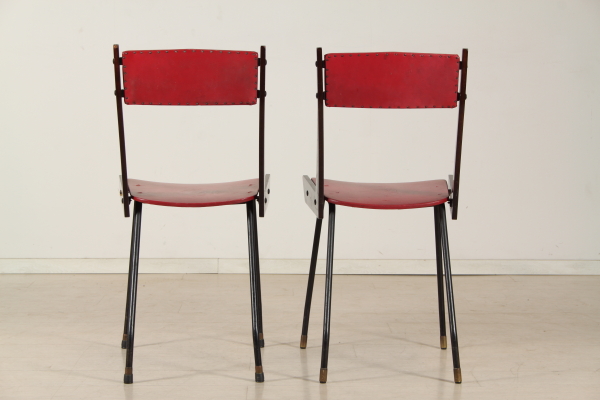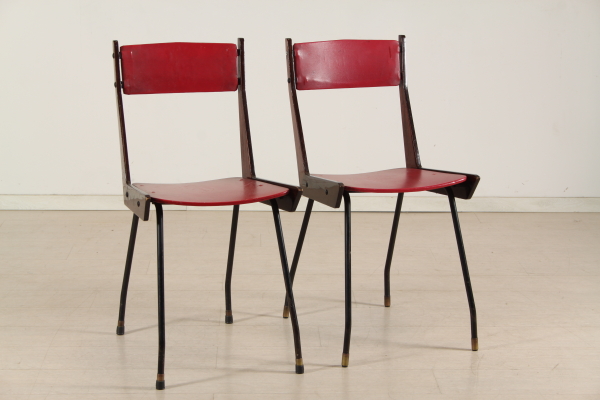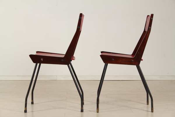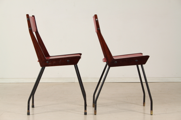 Coppia di sedie con struttura in metallo verniciato e fasce laterali in mogano. Seduta e schienale rivestiti in sky.