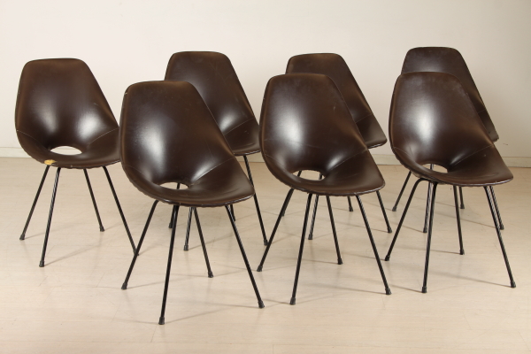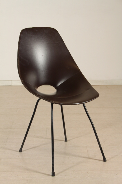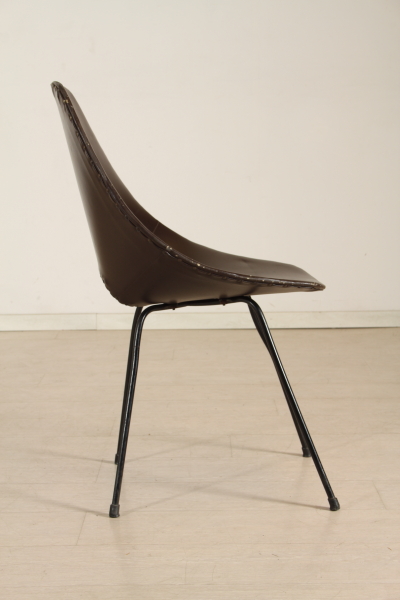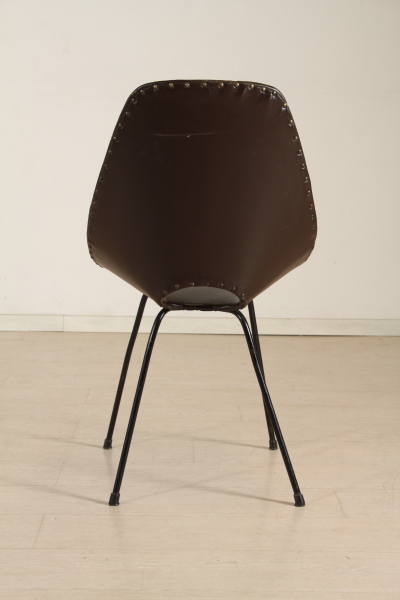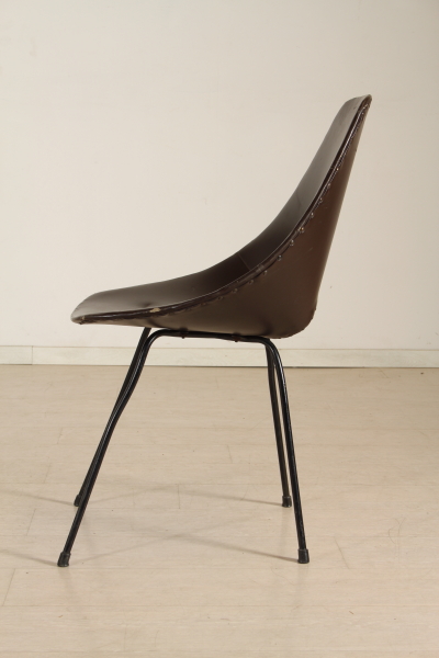 Sedie con scocca di seduta in compensato curvato, imbottito in espanso e rivestito in sky. Gambe tubolari in metallo verniciato.