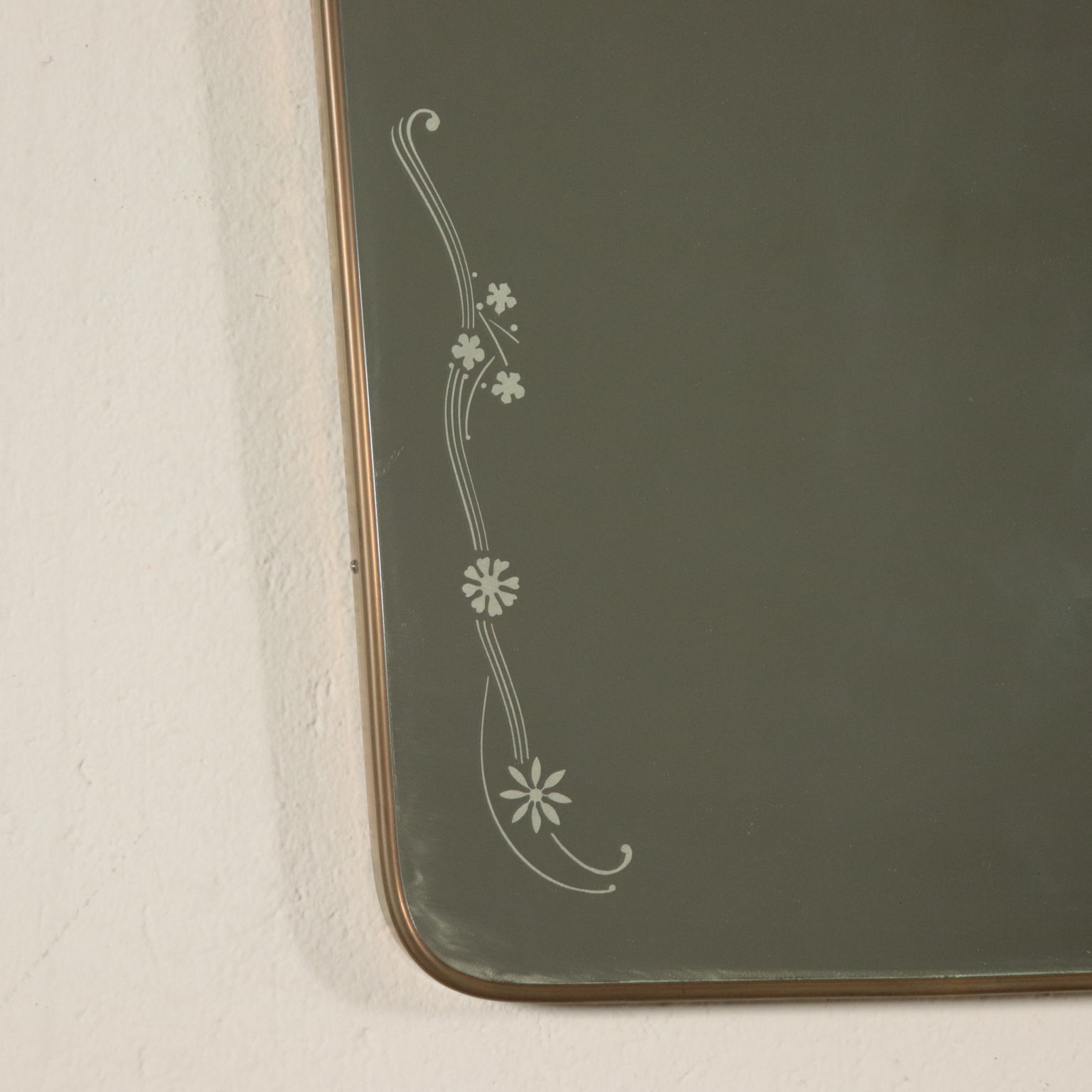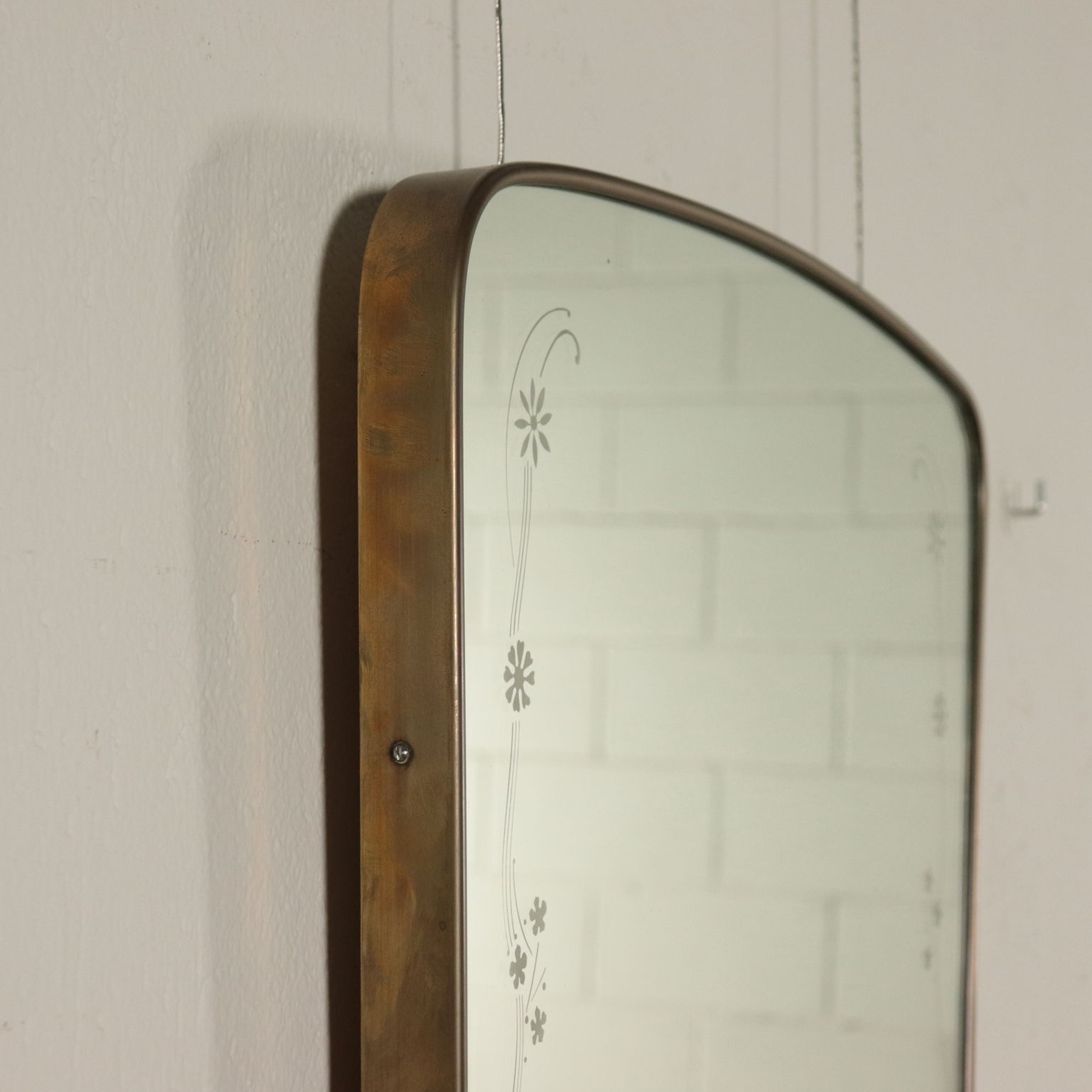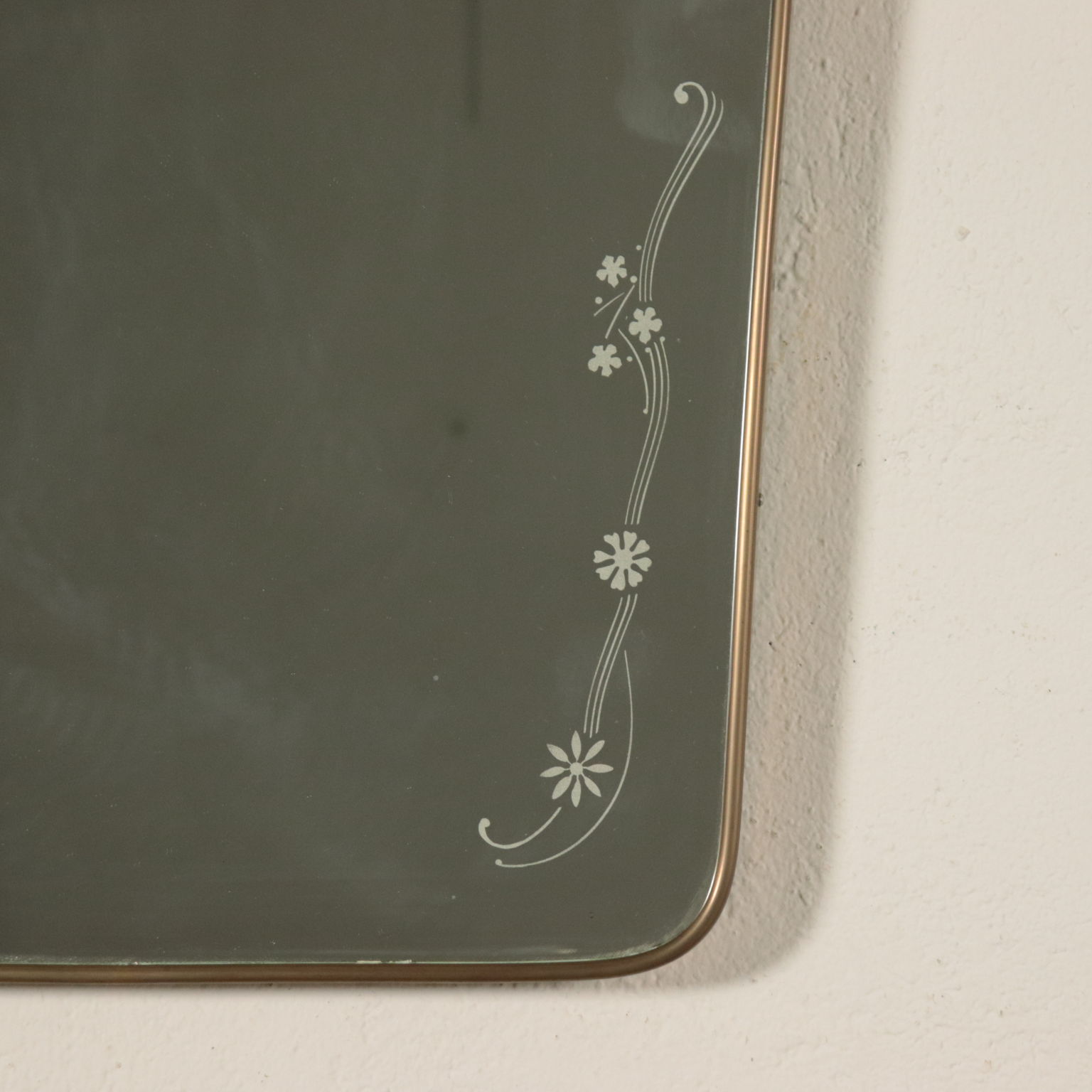 Specchio a parete montato su telaio, vetro specchiato e decorato, cornice in ottone.
