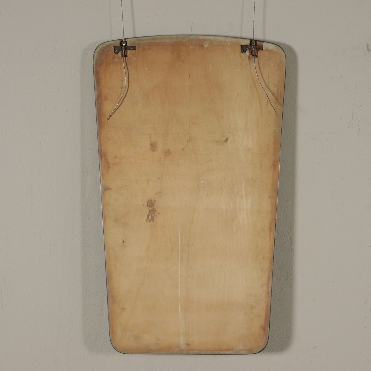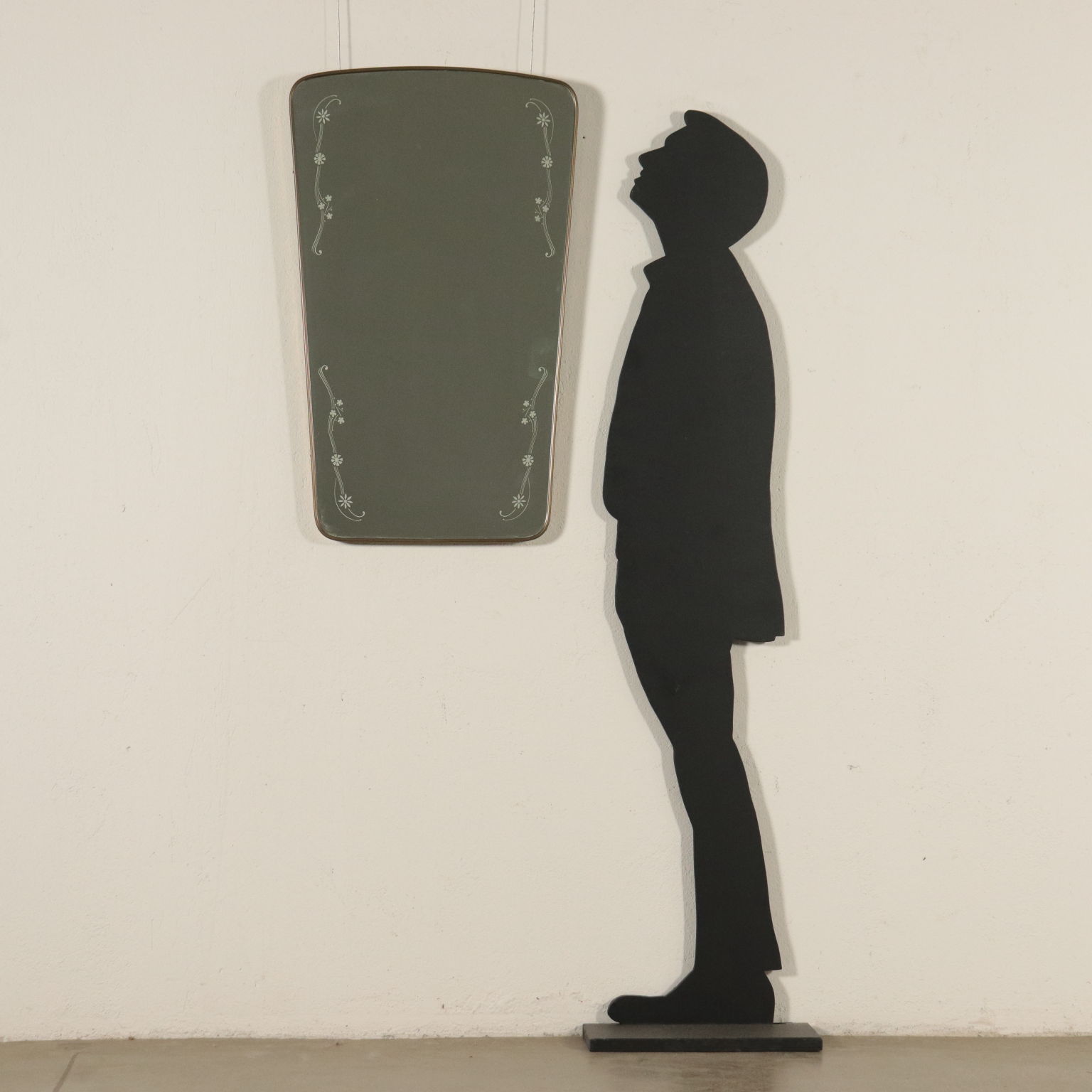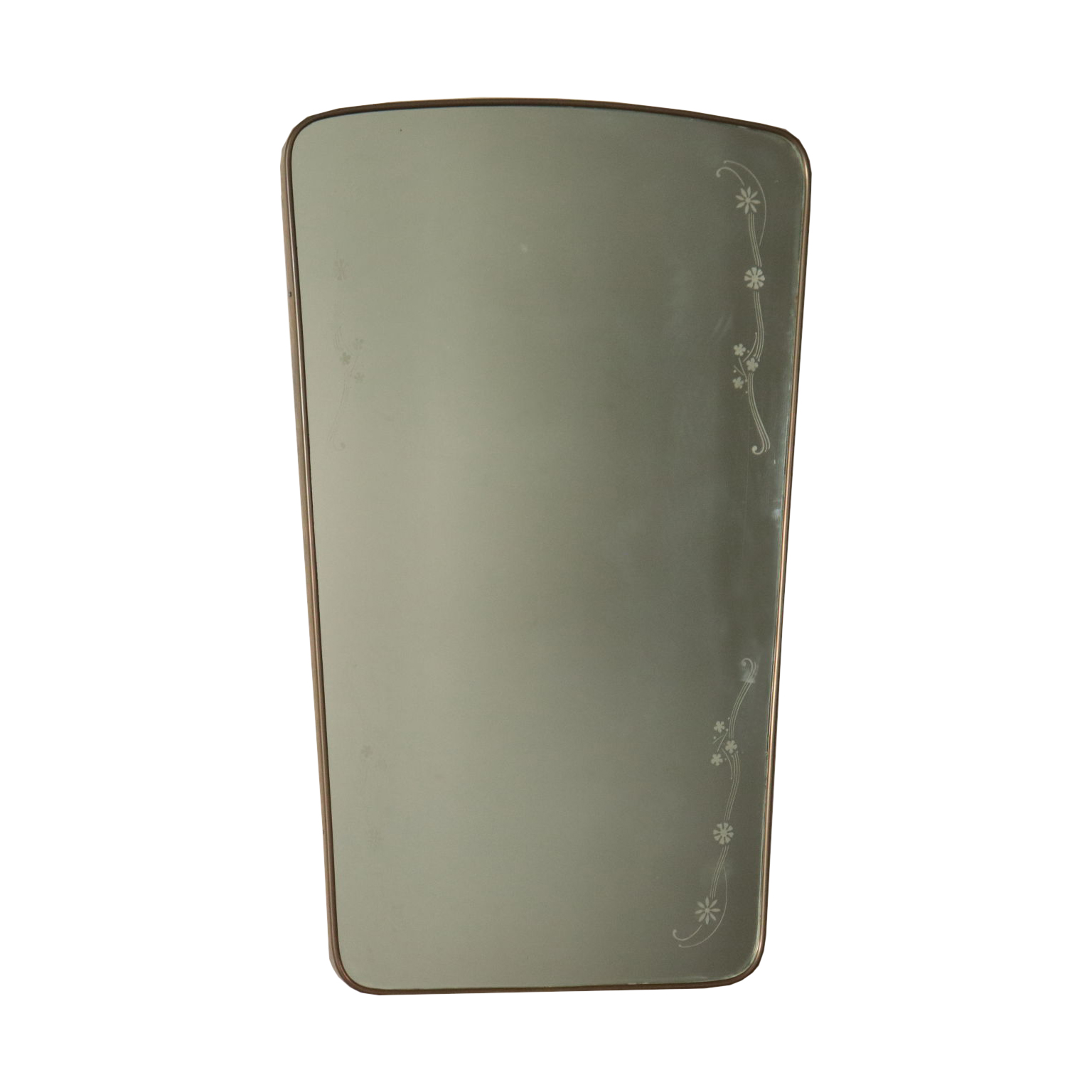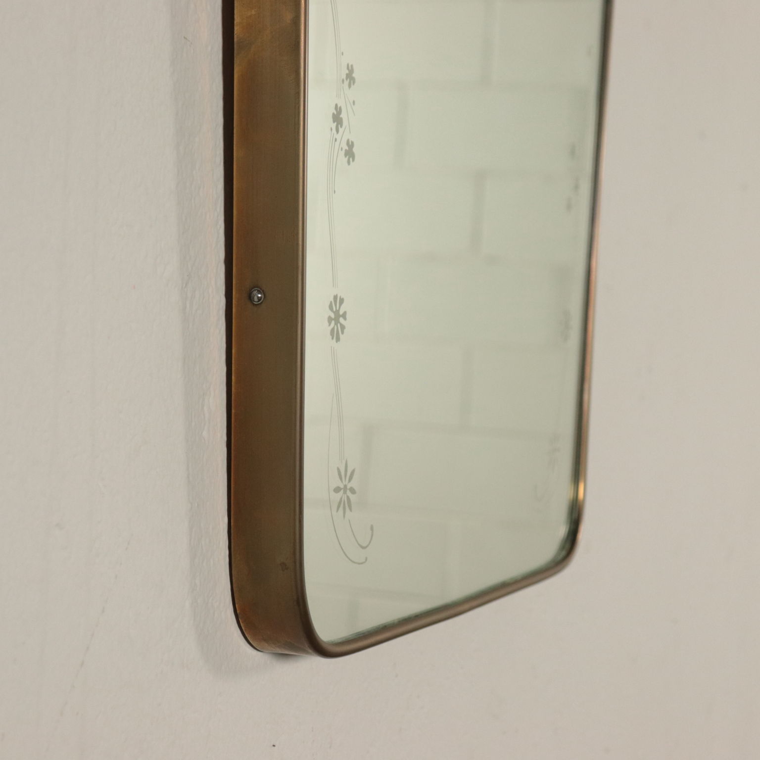 Specchio a parete montato su telaio, vetro specchiato e decorato, cornice in ottone.