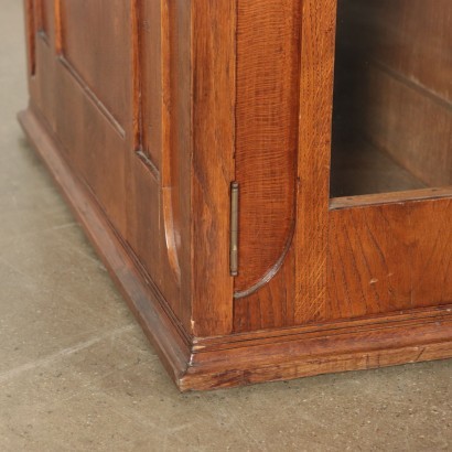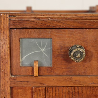 Scrivania Liberty elegantemente rifinita a giorno, i due montanti laterali sono costituiti da due antine con vetri, dietro a quella di destra si trova un piccola cassettiera, sormontate a loro volta da un piccolo cassettino, ornato con inserti in vetro opalino, questi ultimi riproposti anche sulla parte posteriore del mobile. Nella fascia sottopiano, sopra al vano centrale, si trova un cassetto. In legno di rovere, è ornata con raffinati intrecci simmetrici di foglie d'edera, filettate in ottone e intarsiate in radica.