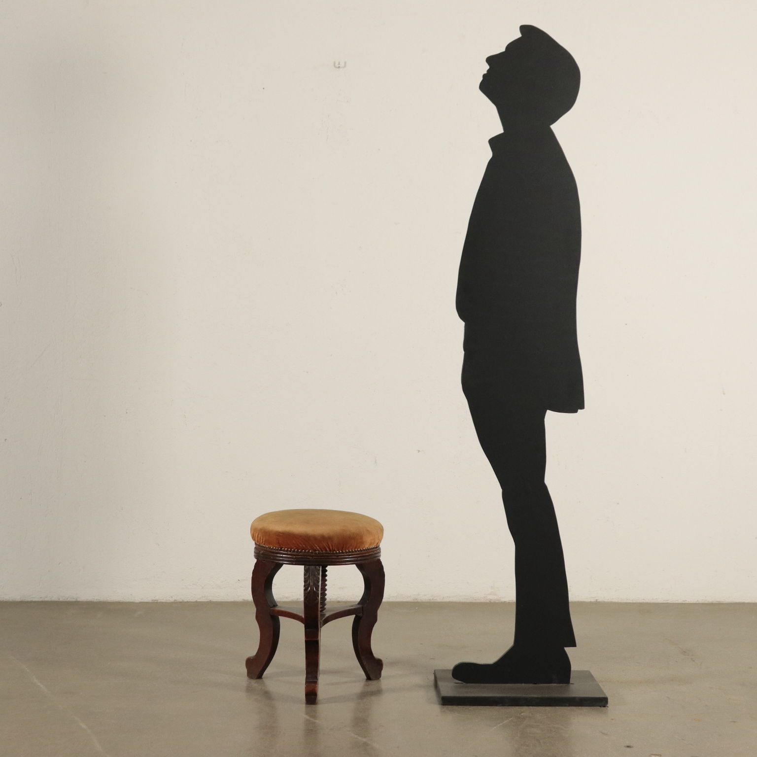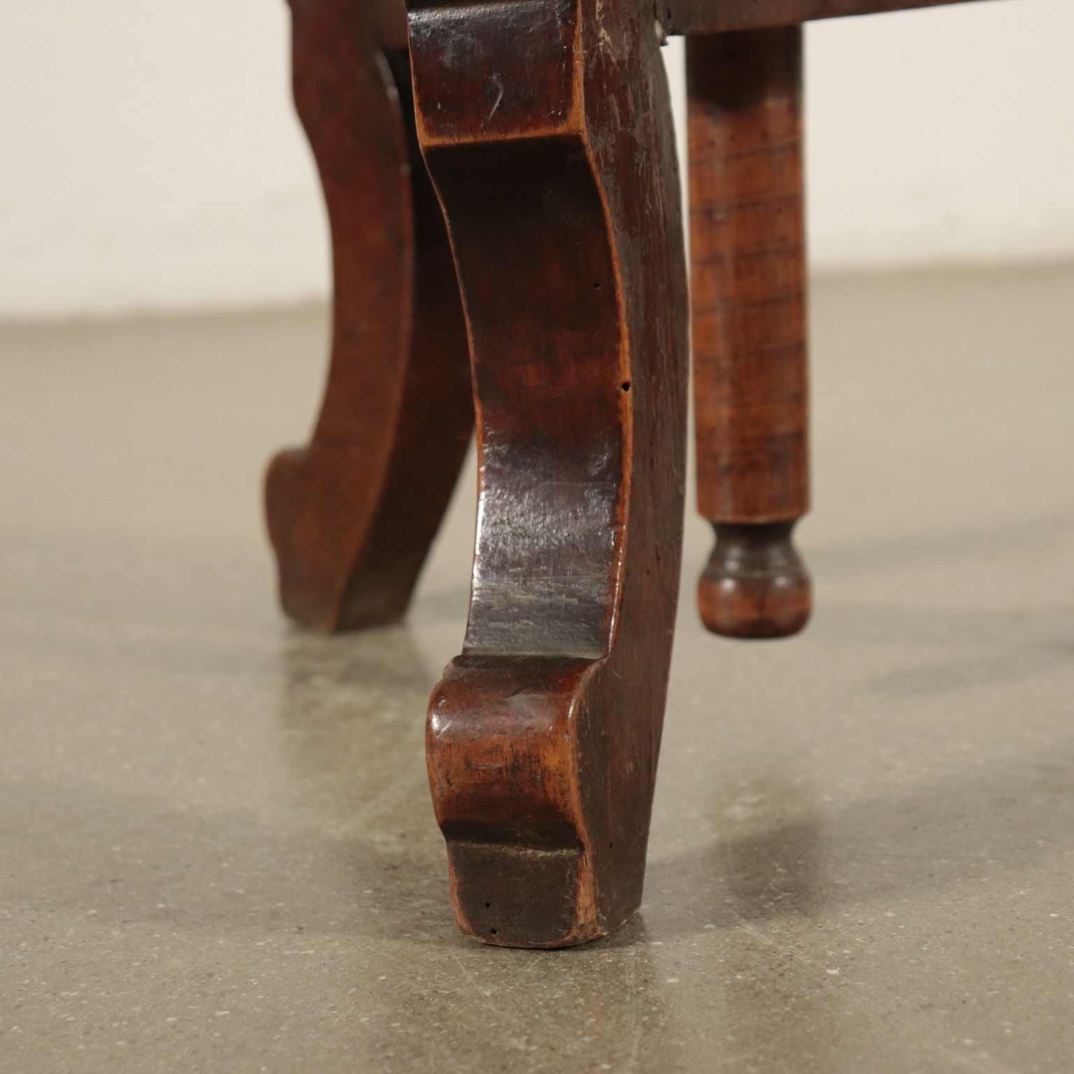 Sorretto da tre gambe mosse e intagliate a ricciolo, ornate con intaglio fogliaceo, connesse da un pianetto mistilineo. La seduta imbottita è regolabile grazie al sottostante sistema a vite.