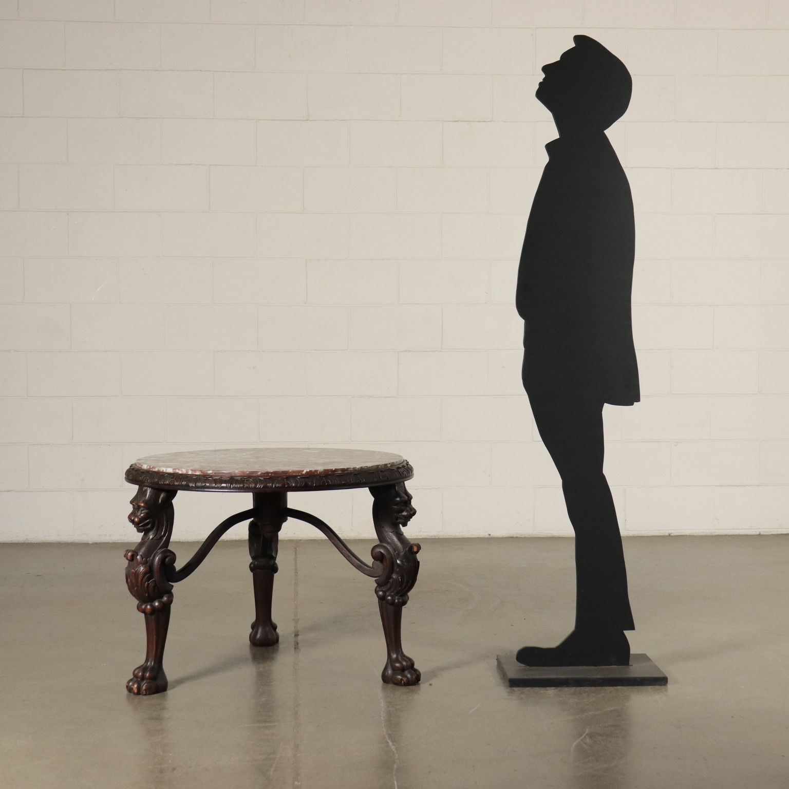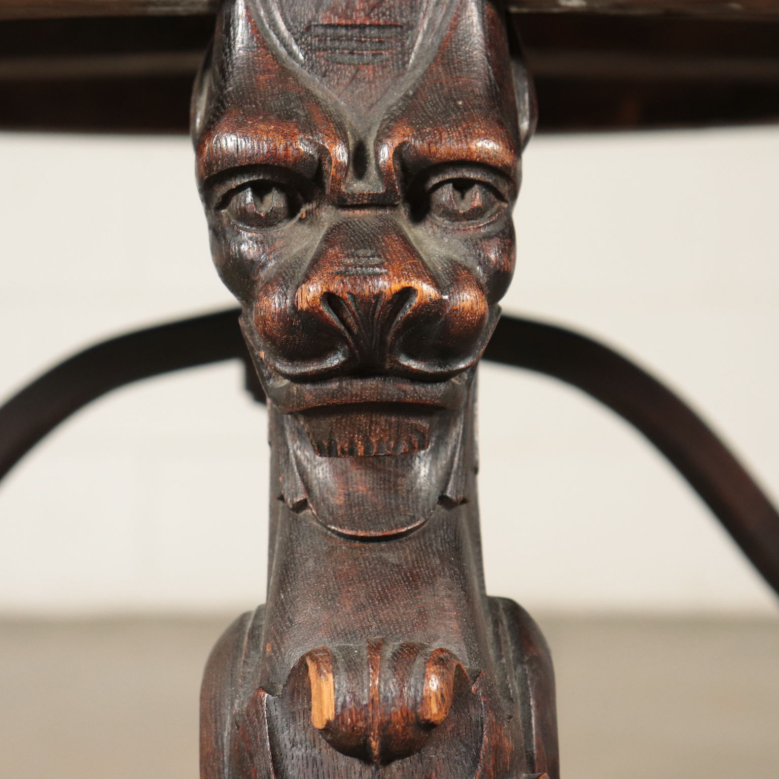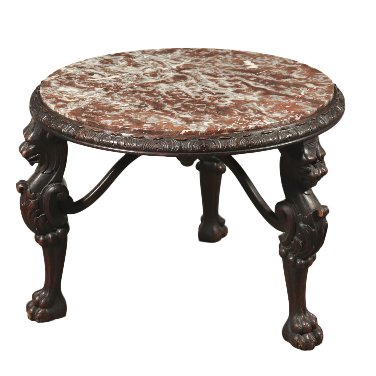 Tavolino in stile Neorinascimento, sorretto da tre montanti intagliati con fattezze di animali mostruosi grotteschi e piedi leonini; il piano è in marmo rosso.