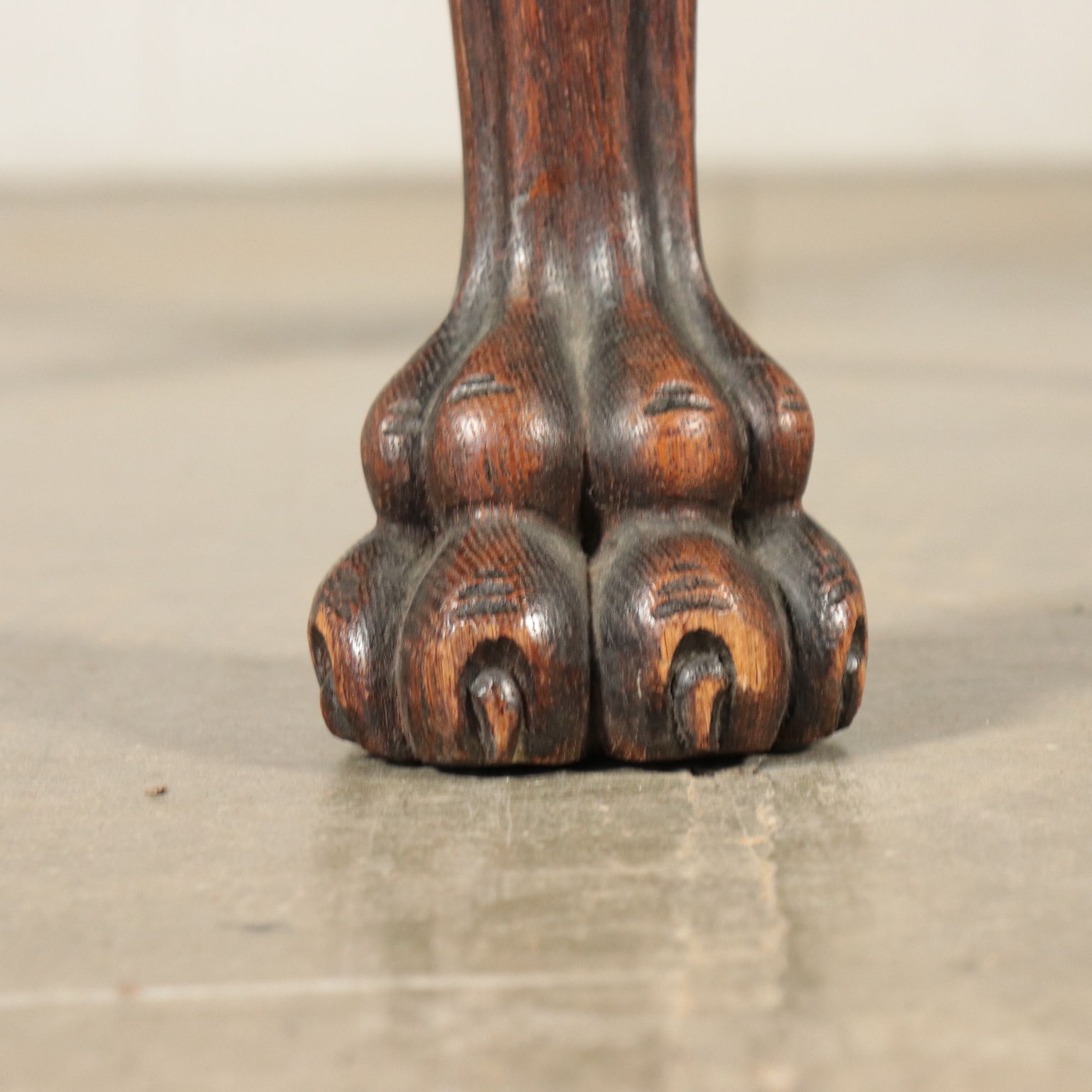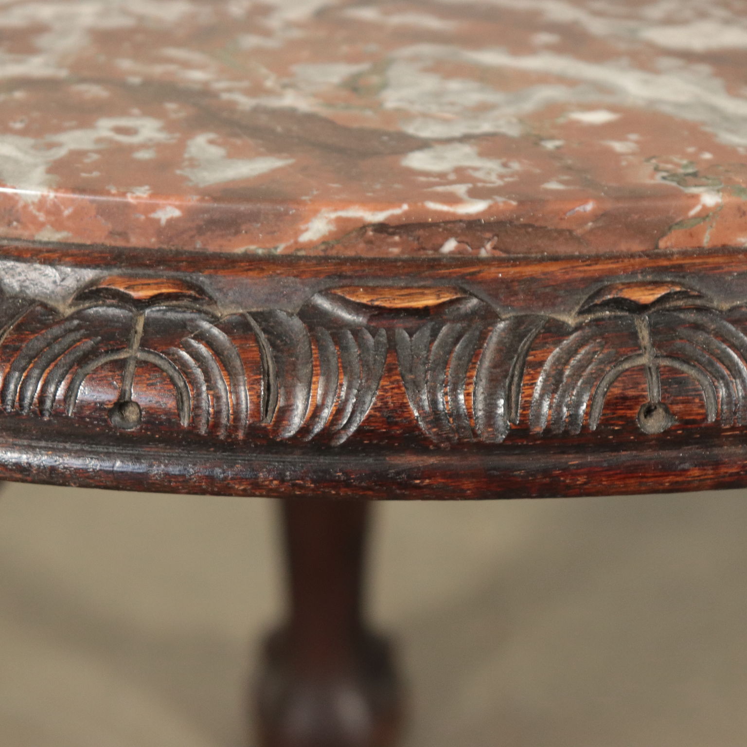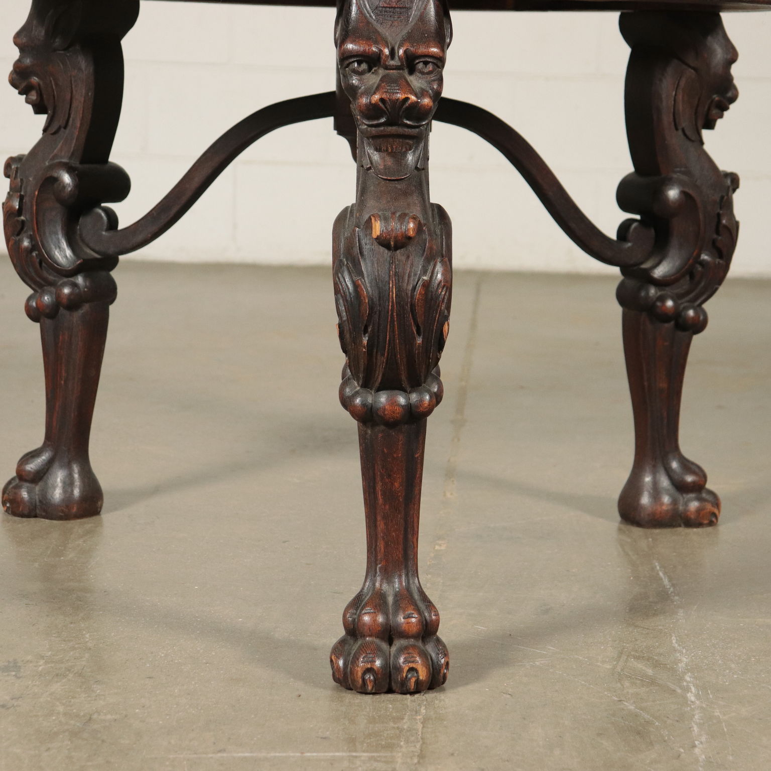 Tavolino in stile Neorinascimento, sorretto da tre montanti intagliati con fattezze di animali mostruosi grotteschi e piedi leonini; il piano è in marmo rosso.
