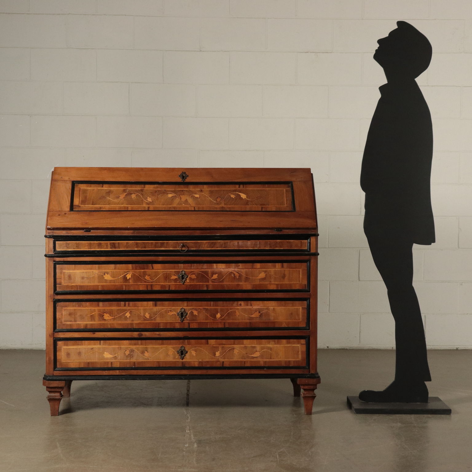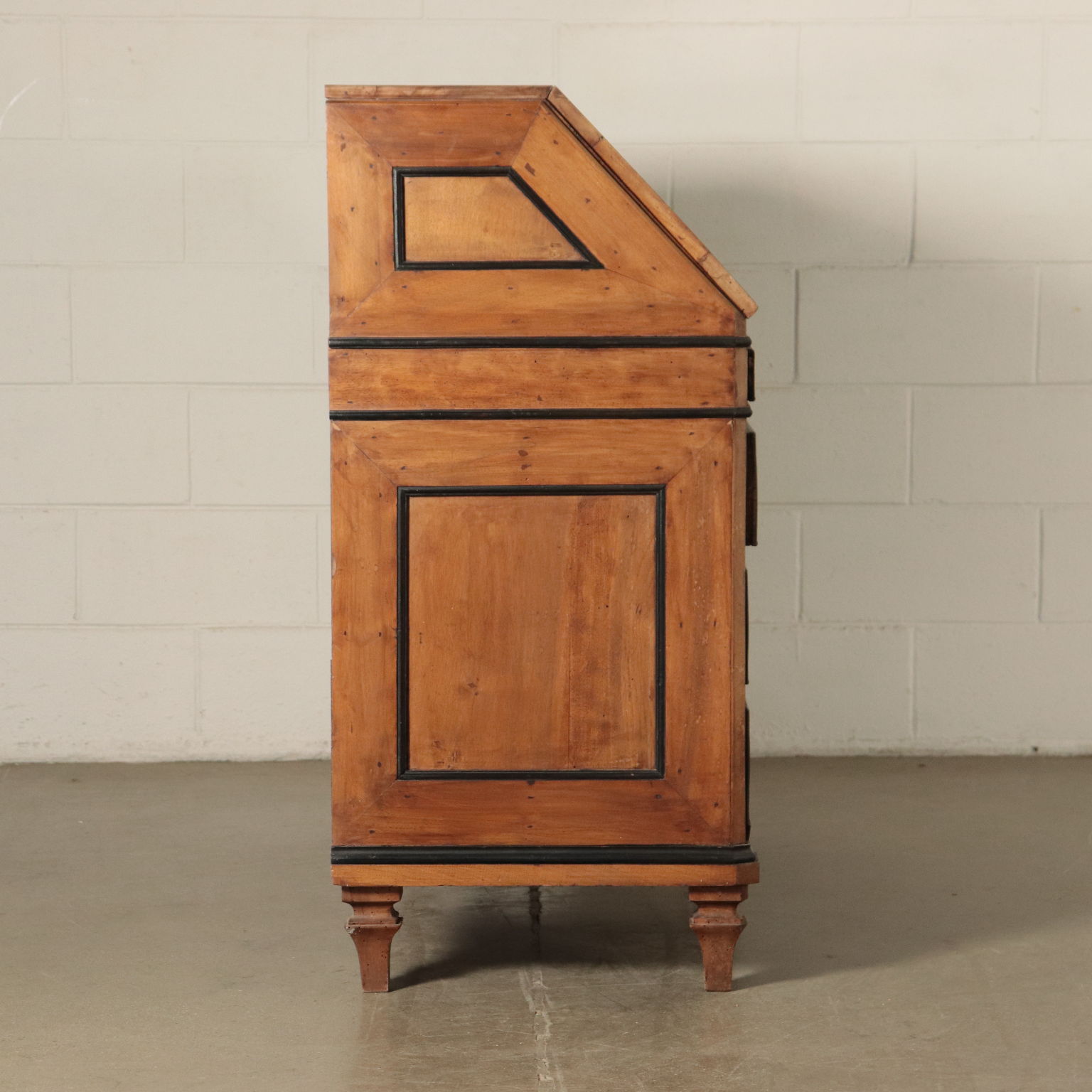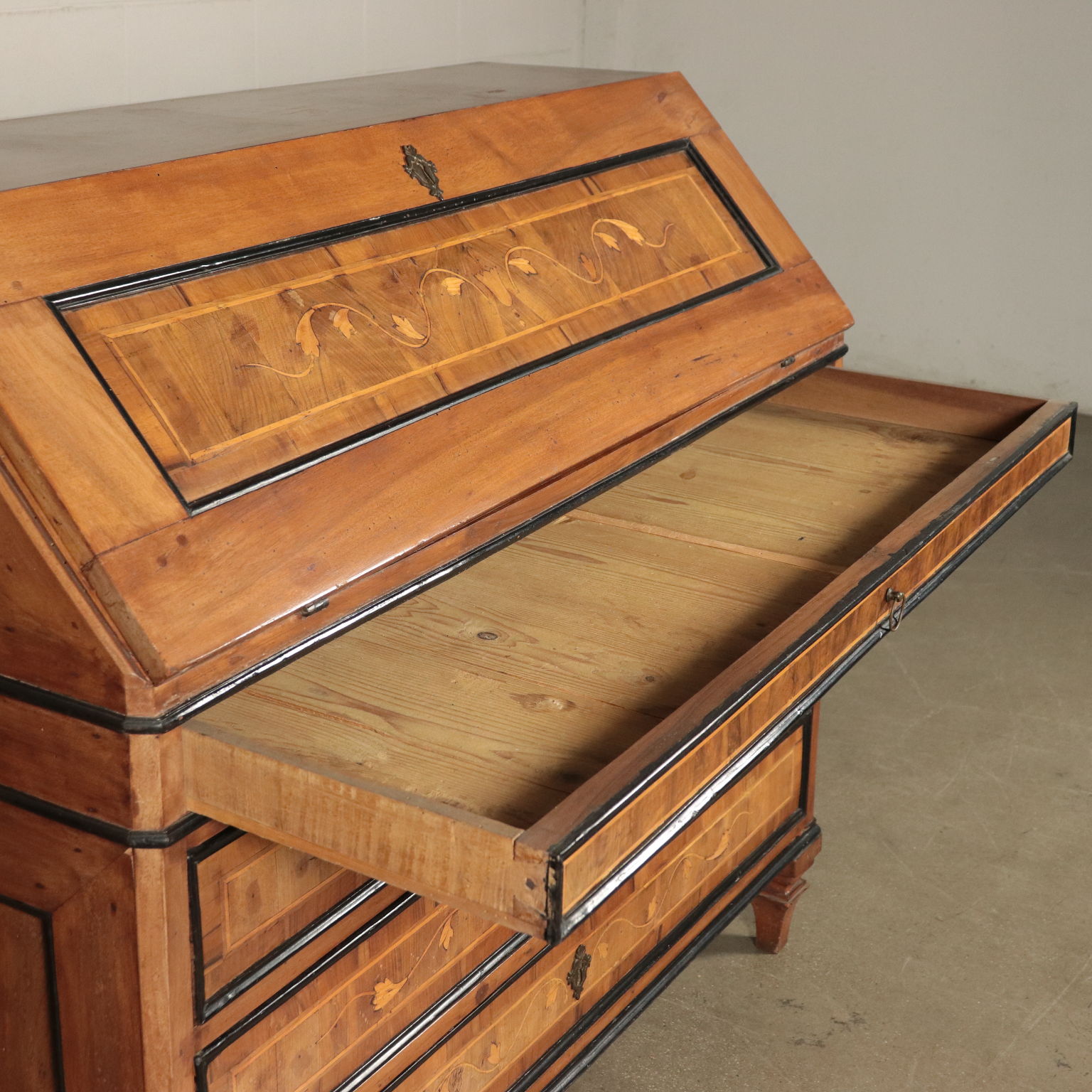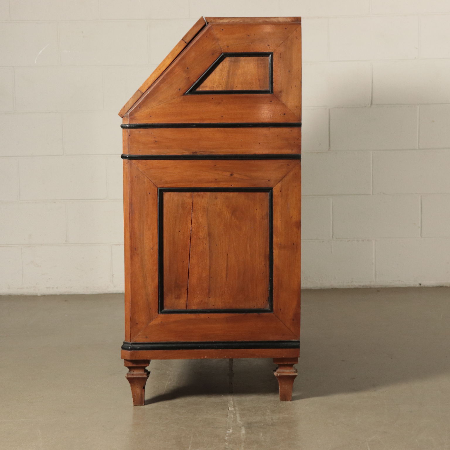 Ribalta lombarda neoclassica, sorretta da quattro piedini tronco-piramidali, stretti da un collare nella parte superiore, sul fronte presenta tre cassetti più uno, dalle dimensioni ridotte e che funge da appoggio per l'anta apribile a ribalta. Questa cela uno scarabattolo con cassetti e segreti. In noce, presenta cornicette ebanizzate che delimitano riserve, sul fronte intarsiate in acero con motivi fitomorfi. La ribalta è stata rimaneggiata nelle parti interne, come nei fianchi e nei cassetti di cui sono stati rifatti gli interni.