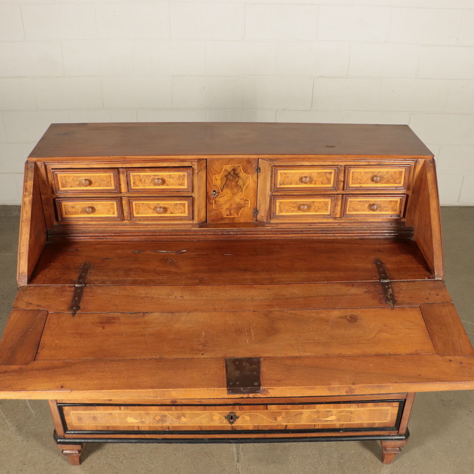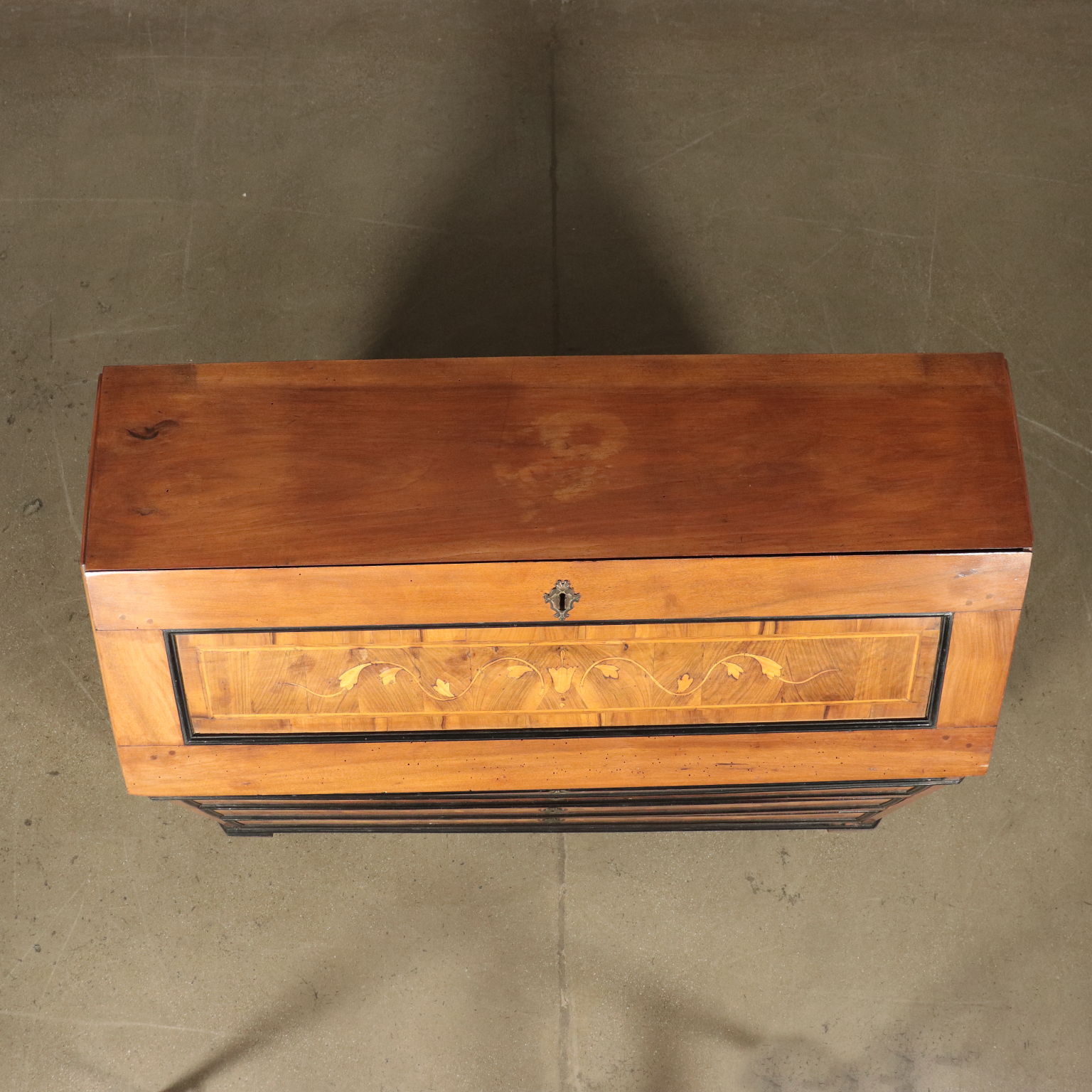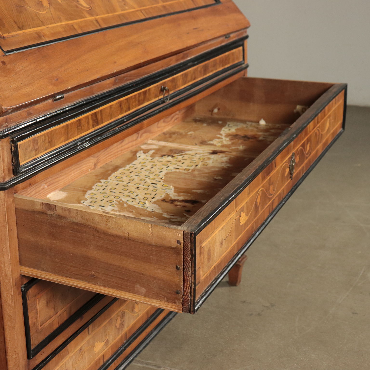 Ribalta lombarda neoclassica, sorretta da quattro piedini tronco-piramidali, stretti da un collare nella parte superiore, sul fronte presenta tre cassetti più uno, dalle dimensioni ridotte e che funge da appoggio per l'anta apribile a ribalta. Questa cela uno scarabattolo con cassetti e segreti. In noce, presenta cornicette ebanizzate che delimitano riserve, sul fronte intarsiate in acero con motivi fitomorfi. La ribalta è stata rimaneggiata nelle parti interne, come nei fianchi e nei cassetti di cui sono stati rifatti gli interni.