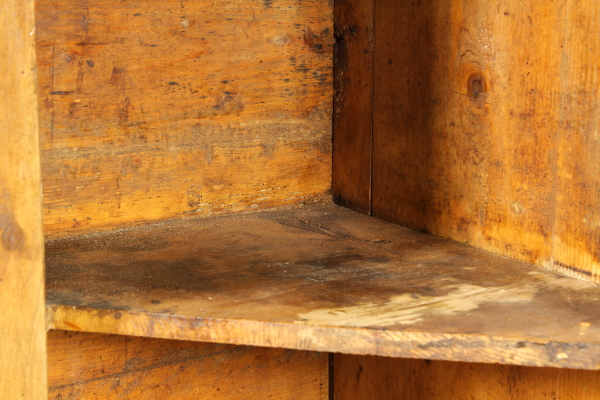 Credenza con quattro ante sul fronte e tre cassetti sottopiano, piano lastronato a lisca di pesce non coevo, interni in abete, restauri e sostituzioni.
