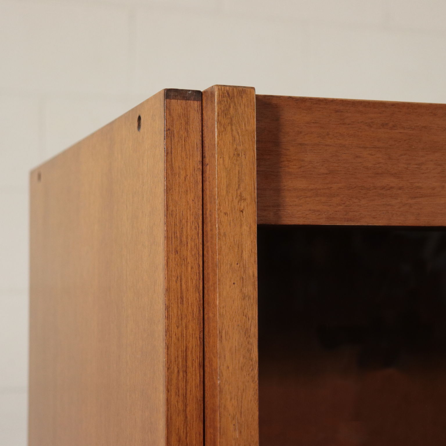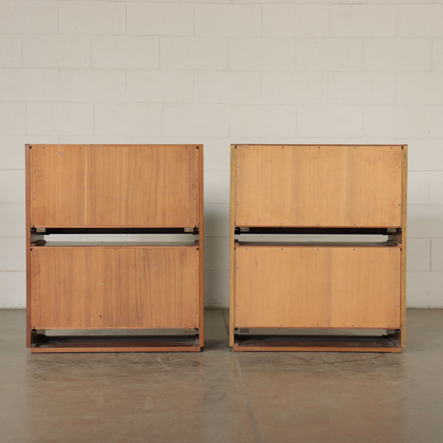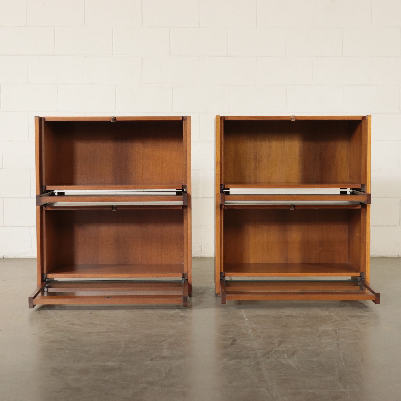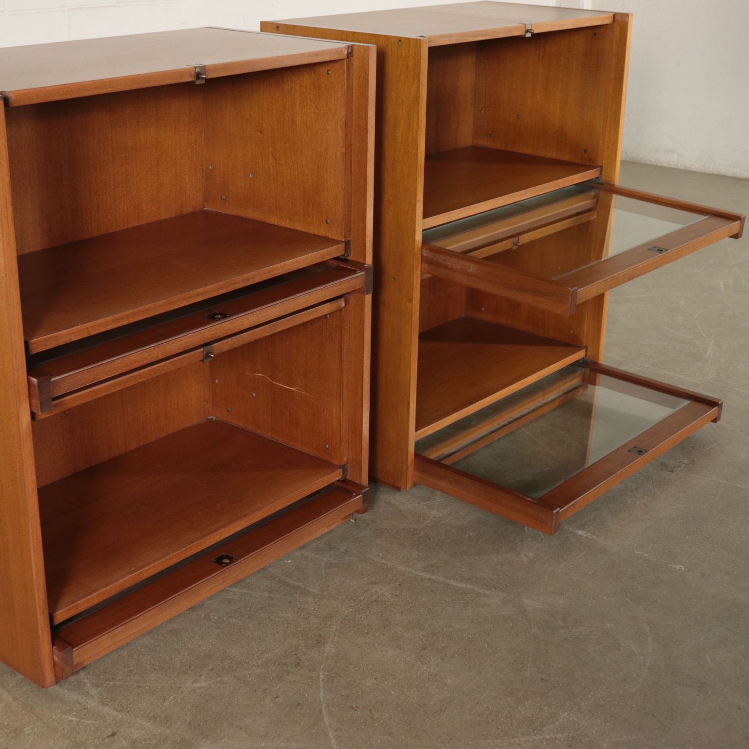 Coppia di mobili con ante ad apertura a ribalta e scomparsa, legno impiallacciato noce tanganica e vetro.