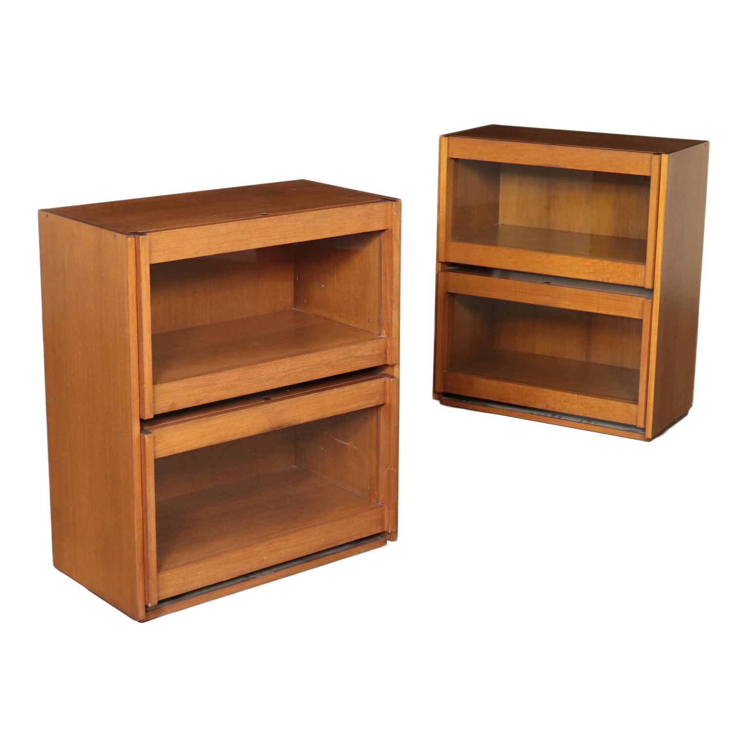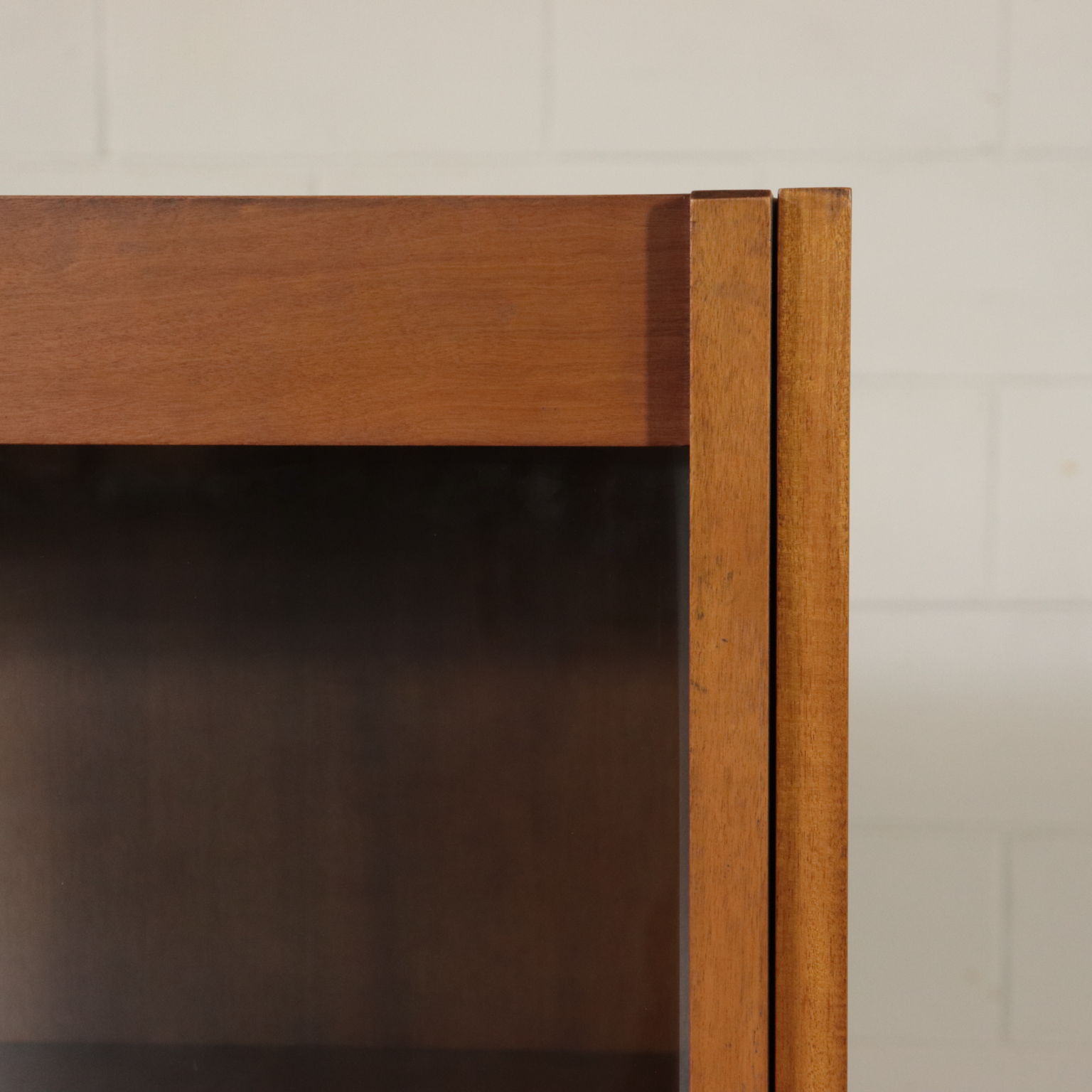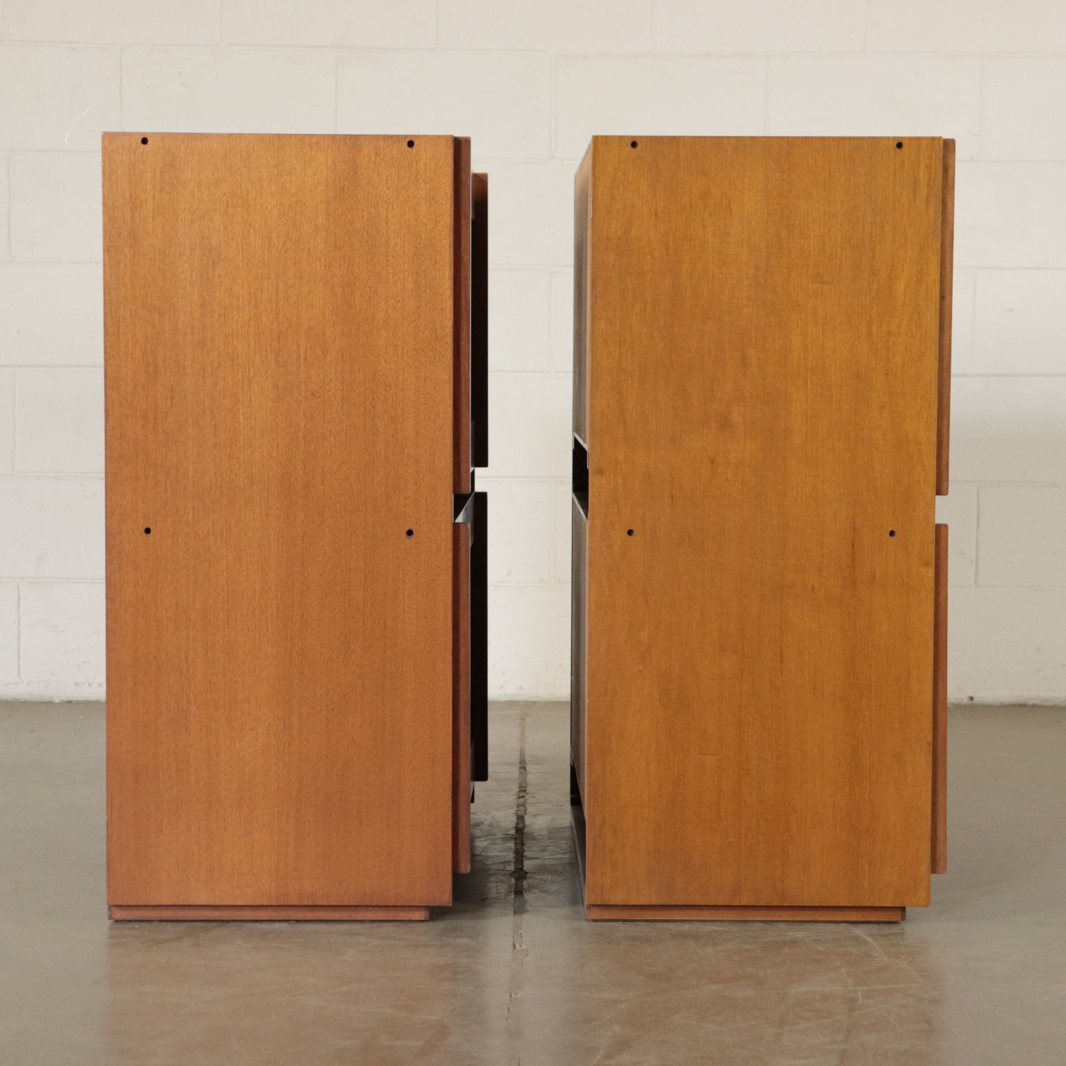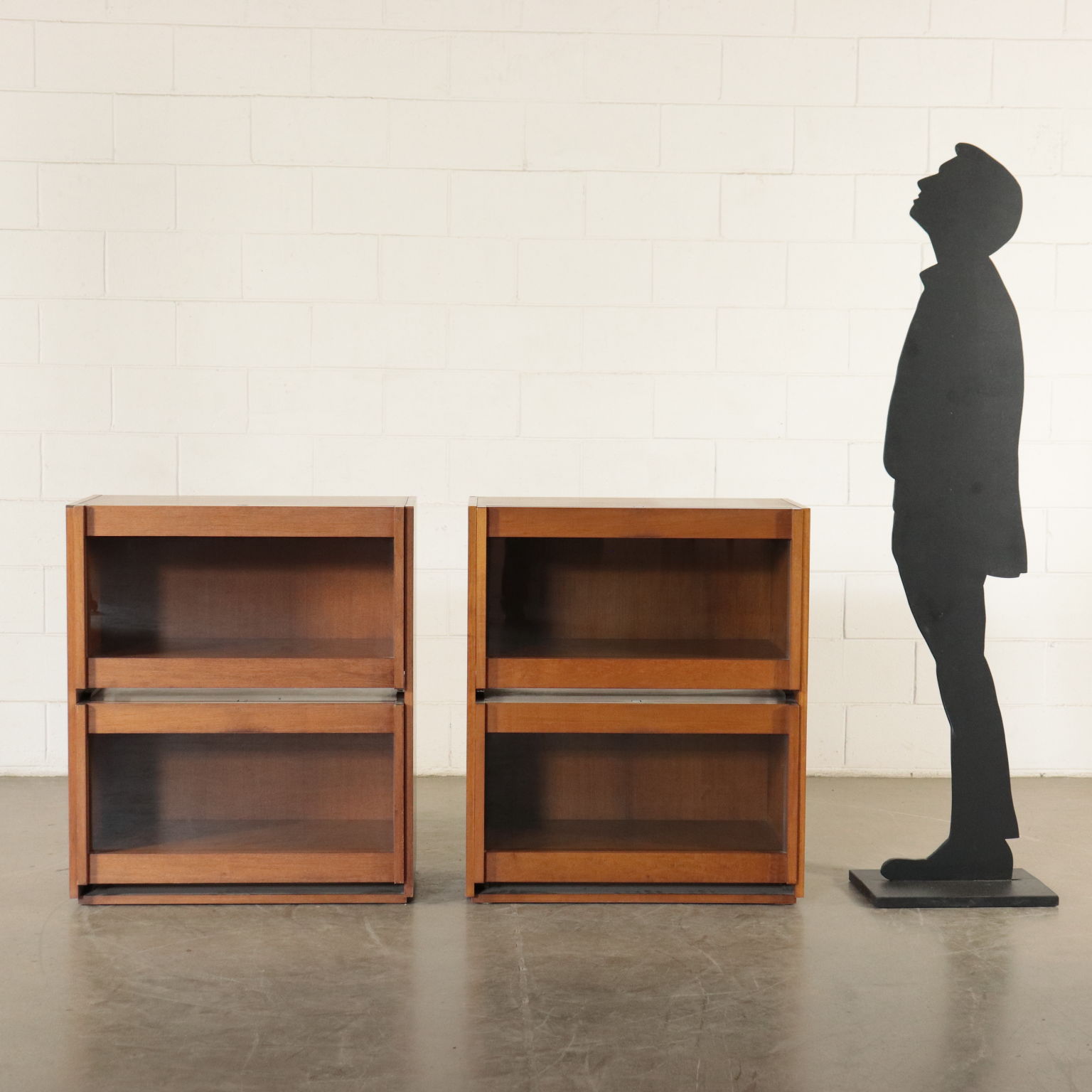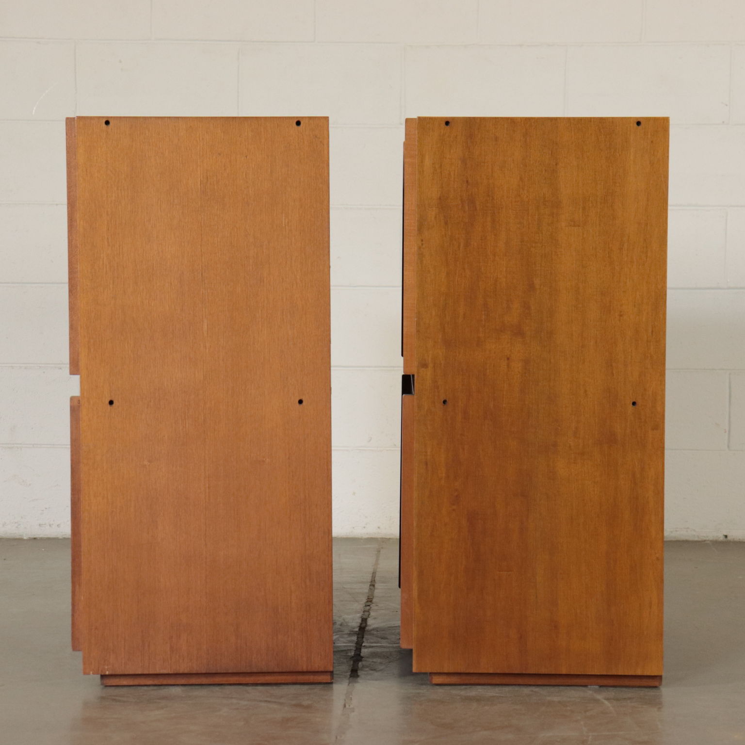 Coppia di mobili con ante ad apertura a ribalta e scomparsa, legno impiallacciato noce tanganica e vetro.