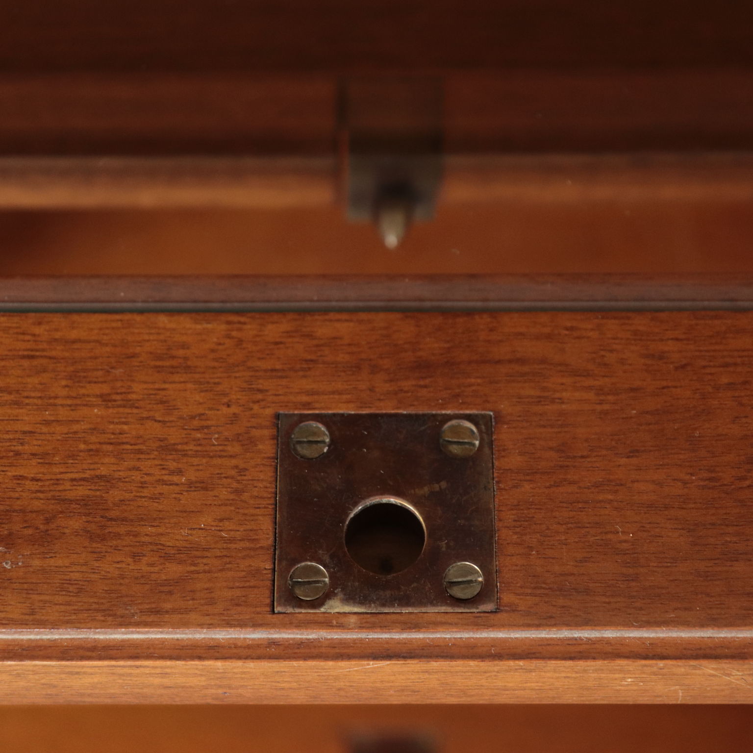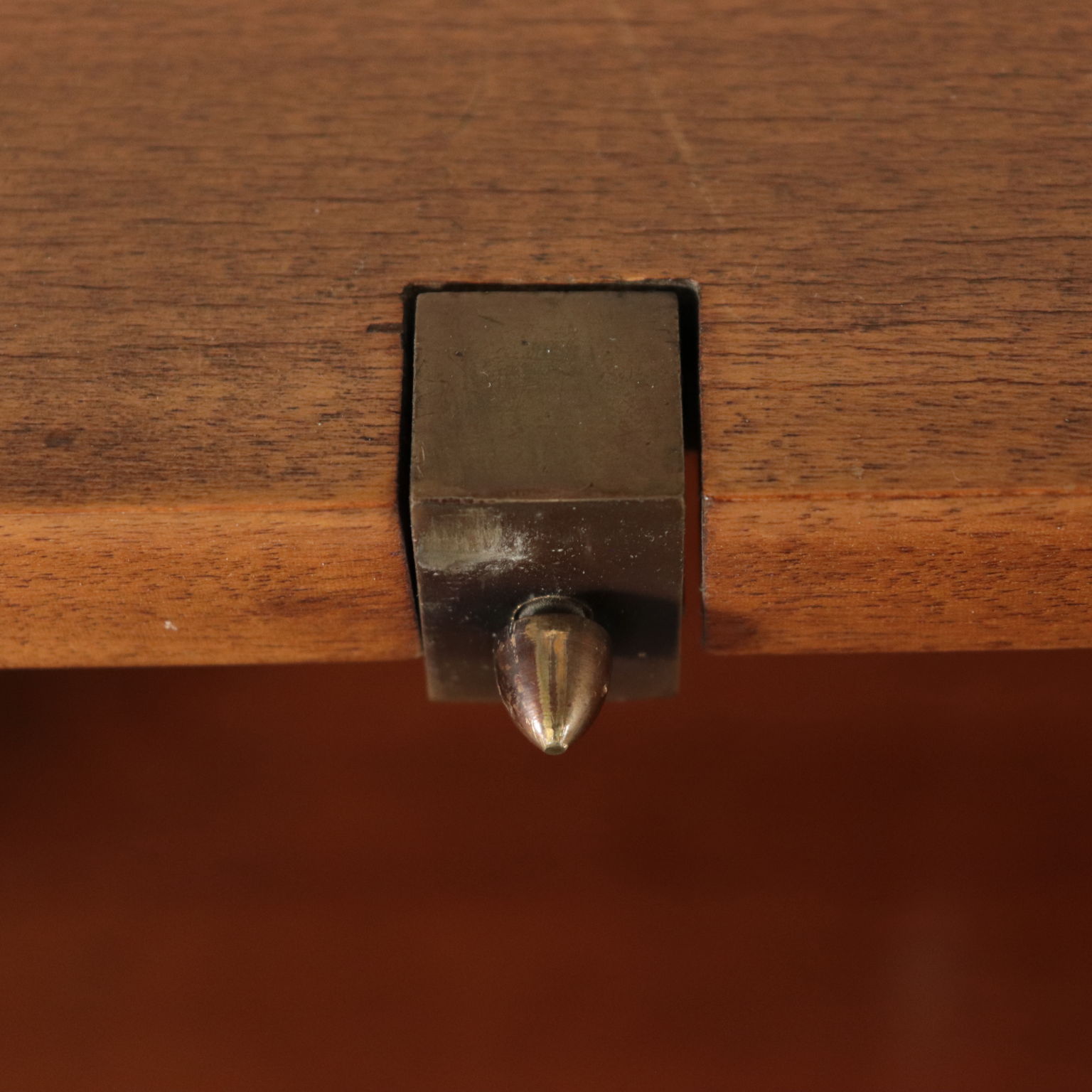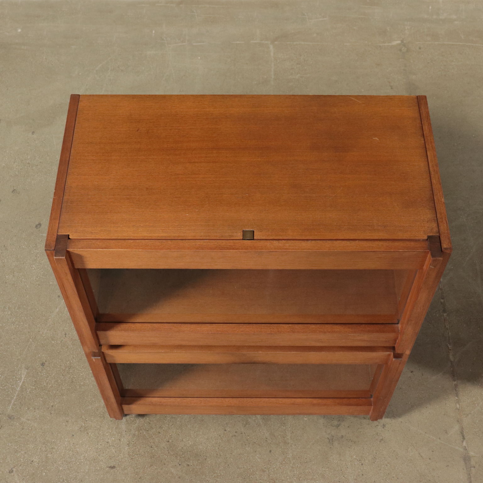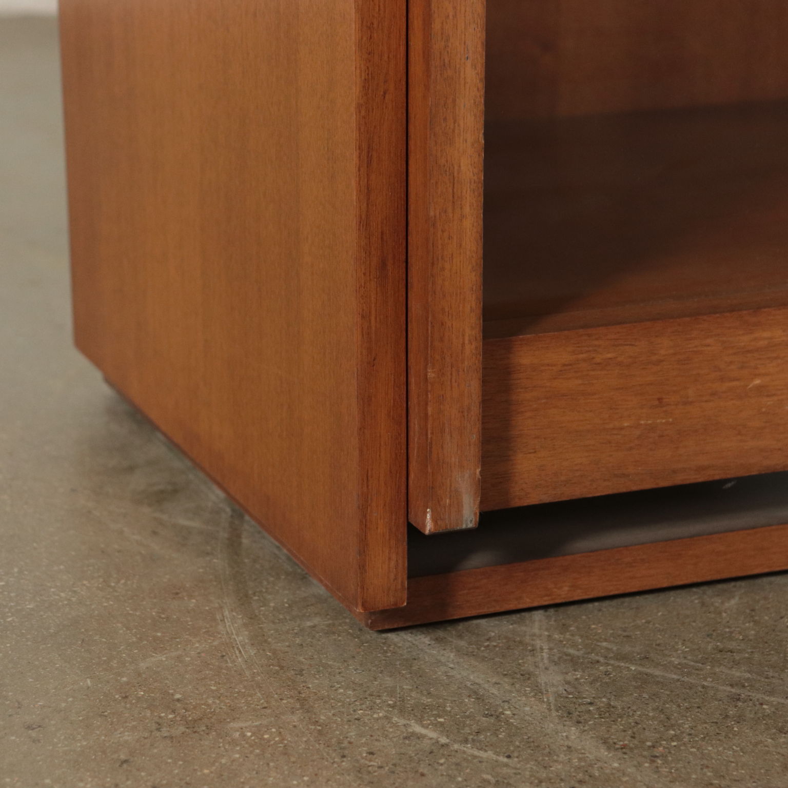 Coppia di mobili con ante ad apertura a ribalta e scomparsa, legno impiallacciato noce tanganica e vetro.