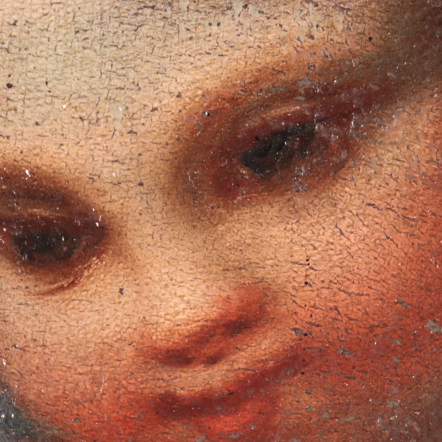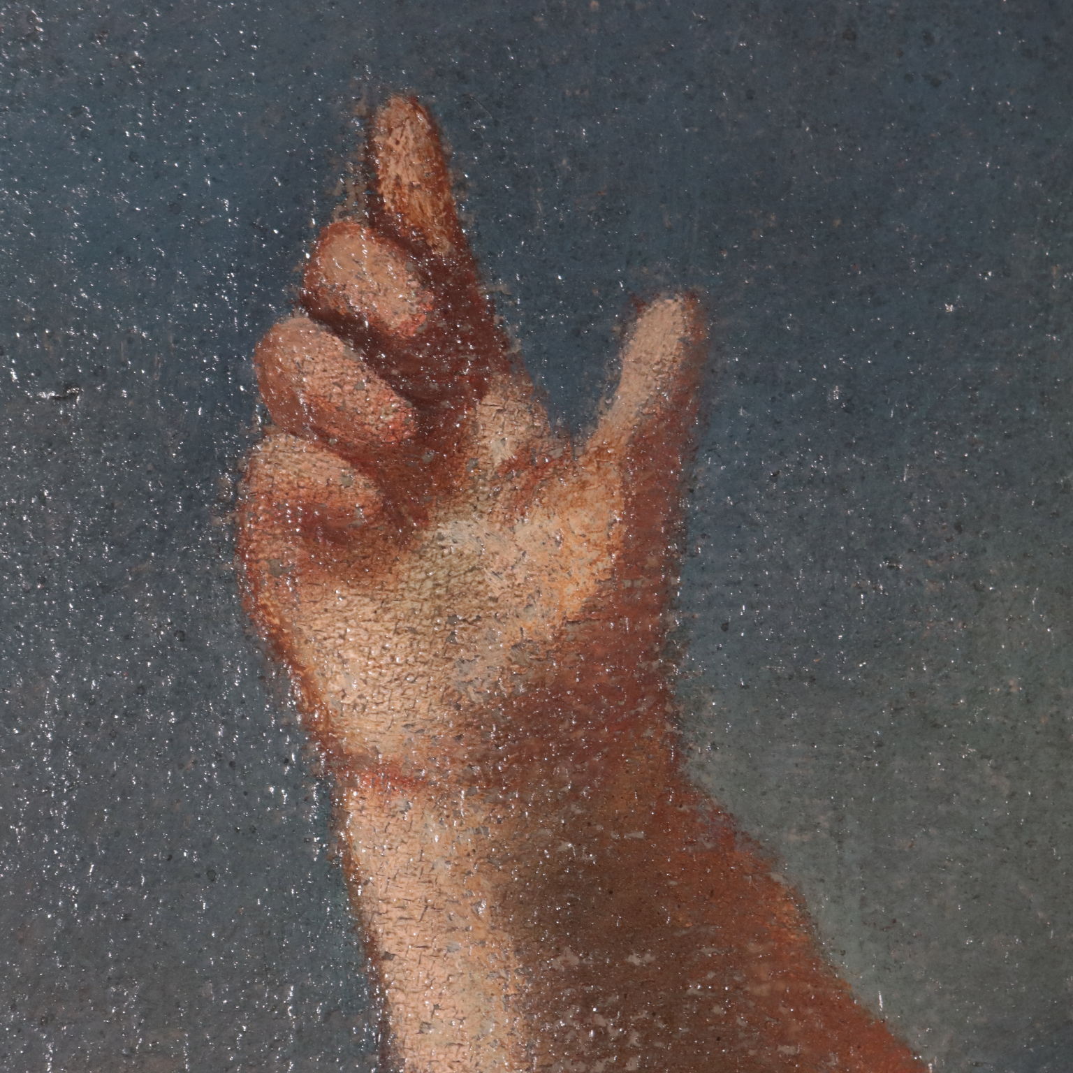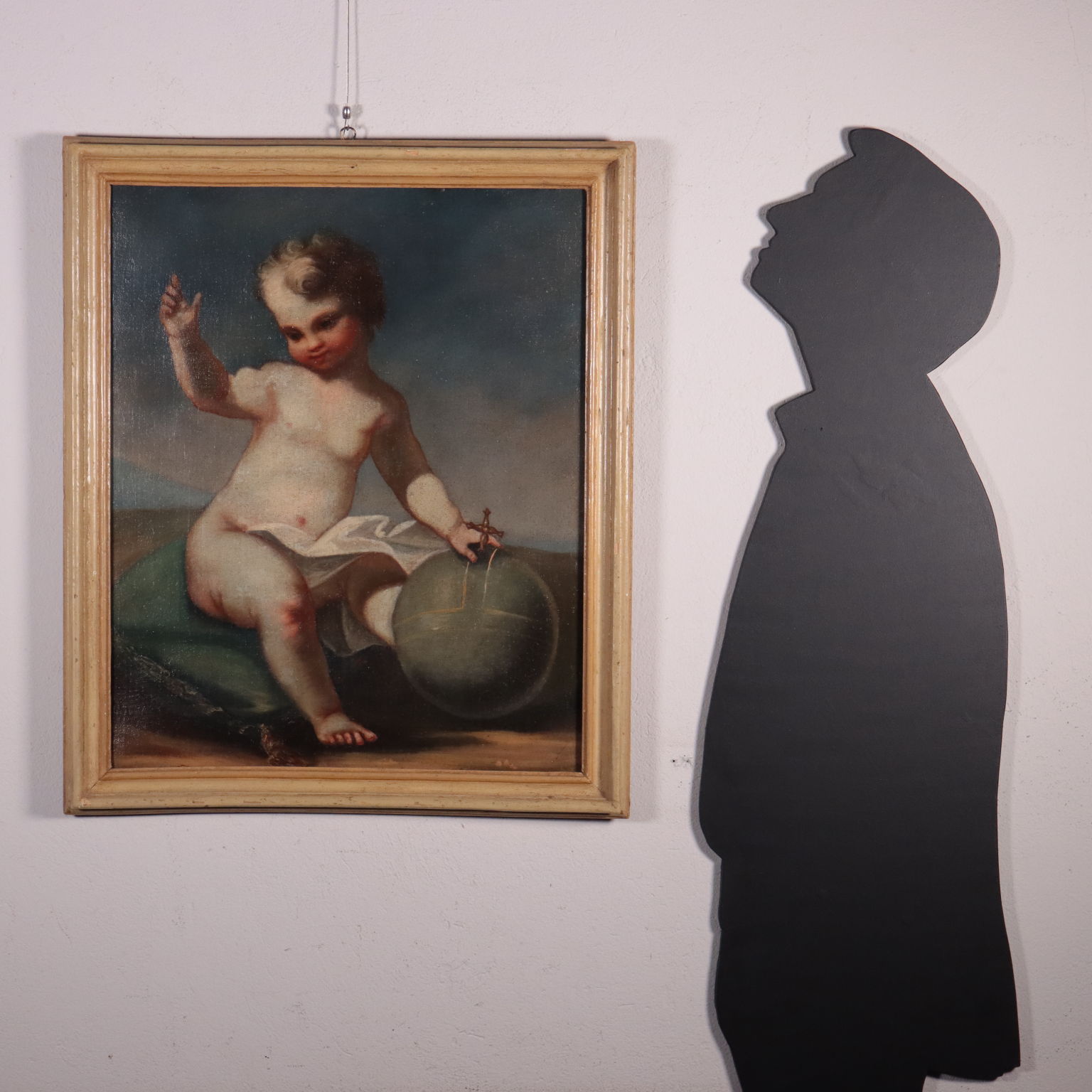 Immagine di Gesù Bambino raffigurato come Salvator Mundi, con la mano destra alzata a benedizione e la sinistra appoggiata sul globus cruciger, simbolo di dominio sul mondo. Si tratta di un soggetto antico molto diffuso in area napoletana. Restaurato e ritelato. In cornice in stile.