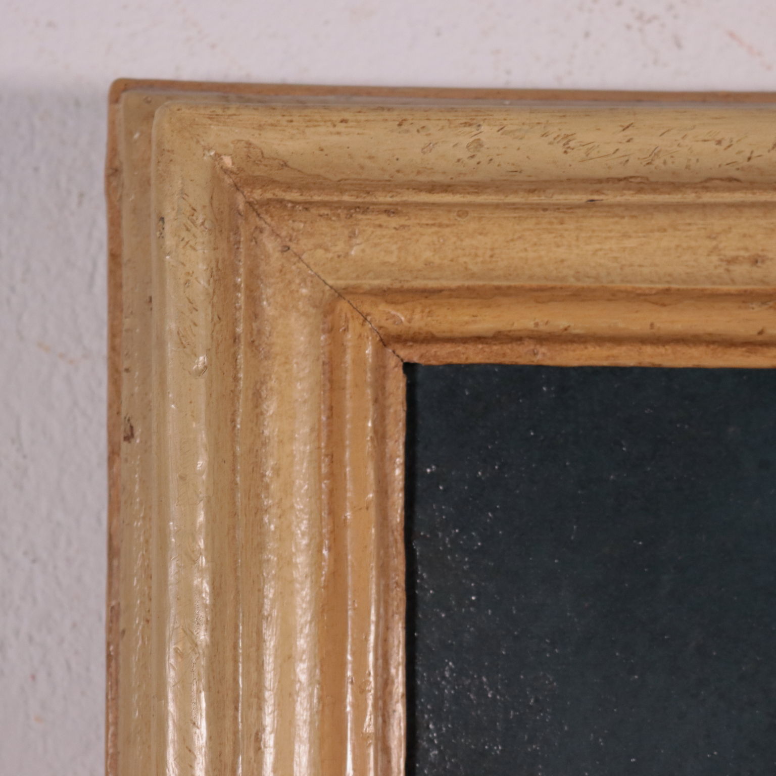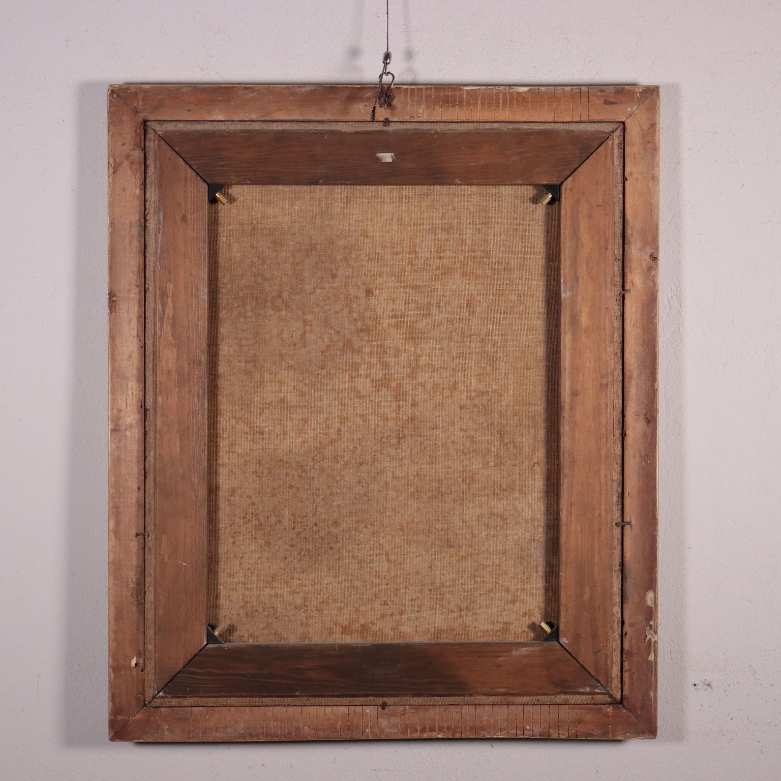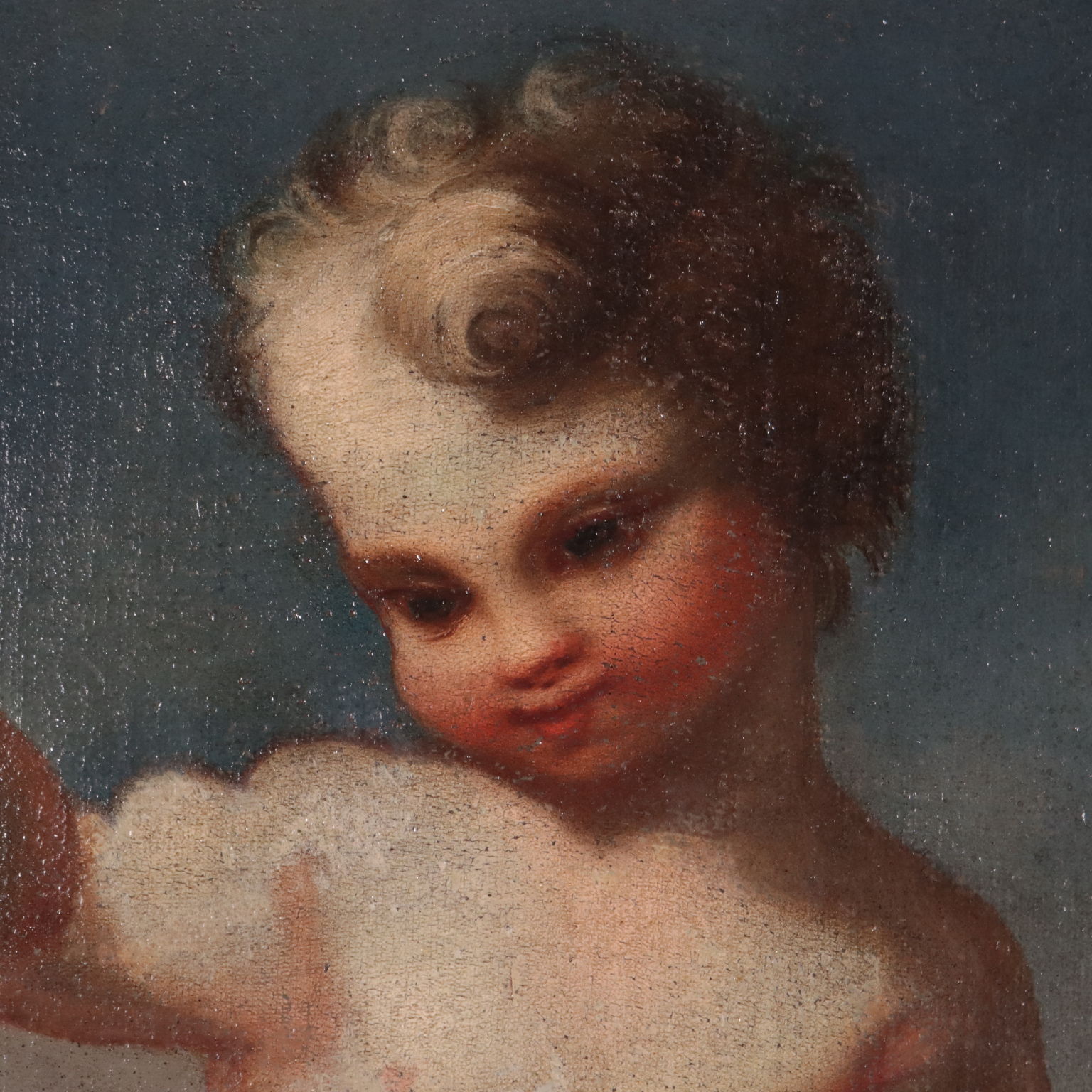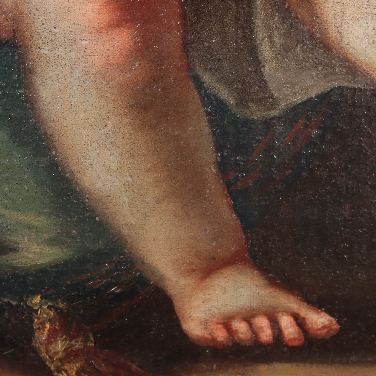 Immagine di Gesù Bambino raffigurato come Salvator Mundi, con la mano destra alzata a benedizione e la sinistra appoggiata sul globus cruciger, simbolo di dominio sul mondo. Si tratta di un soggetto antico molto diffuso in area napoletana. Restaurato e ritelato. In cornice in stile.