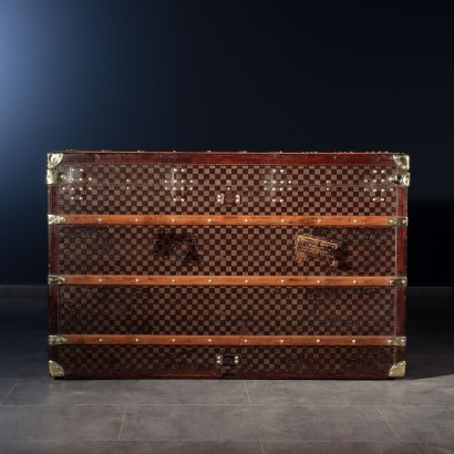 Baule L.V. risalente al 1890, rivestito in tela Damier, la famosa tela con motivi a scacchi marroni e beige alternati, inventata pochi anni prima da Georges Vuitton, figlio di Louis. Si tratta di un baule da uomo dalle dimensioni piuttosto grandi, commissionato quindi per resistere a lunghi viaggi. L'interno è corredato da ripiani e scomparti studiati per riporre i cappelli (anche di grandi dimensioni come il cilindro) e altri accessori indispensabili a fine '800 come foulards, bretelle, polsini e colletti. La maestria artigiana della Maison è dimostrata dalla resistente struttura esterna, accompagnata dal rivestimento morbido interno. Le condizioni sono ottime: negli anni sono stati fatti piccoli restauri conservando tutto originale, comprese serrature e finiture in ottone dorato.