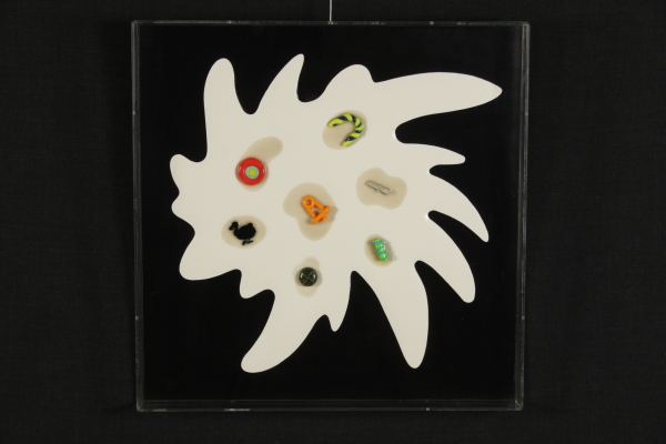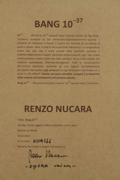 Collage con resine, oggetti, colore serigrafico, carta e legno. Firma e dichiarazione di autenticità dell'artista al retro.