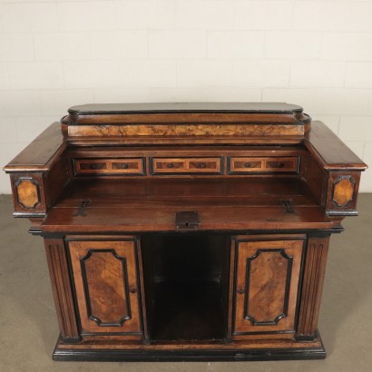 Scrivania in stile, realizzata con parti di un'antica ribalta lombarda, impiallacciata in radica con cornicette ebanizzate. Il mobile presenta due ante sul fronte, nei due corpi laterali che inquadrano un vano centrale; nella parte suoperiore un'anta apribile a ribalta e una a scorrimento danno accesso a uno scarabattolo con tre cassettini. Nella parte superiore un'alzatina cela segreti laterali.