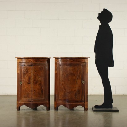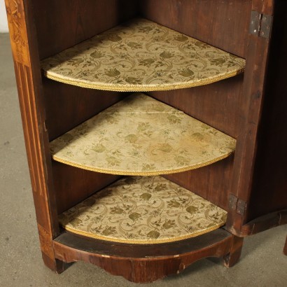 Coppia di angoliere, sul fronte presentano un'anta dalla caratteristica forma a mezza luna, intarsiate con essenze varie a rappresentare scene bucoliche; anche i montanti sono intarsiati con racemi vegetali, mentre sul piano vi è un motivo geometrico.
