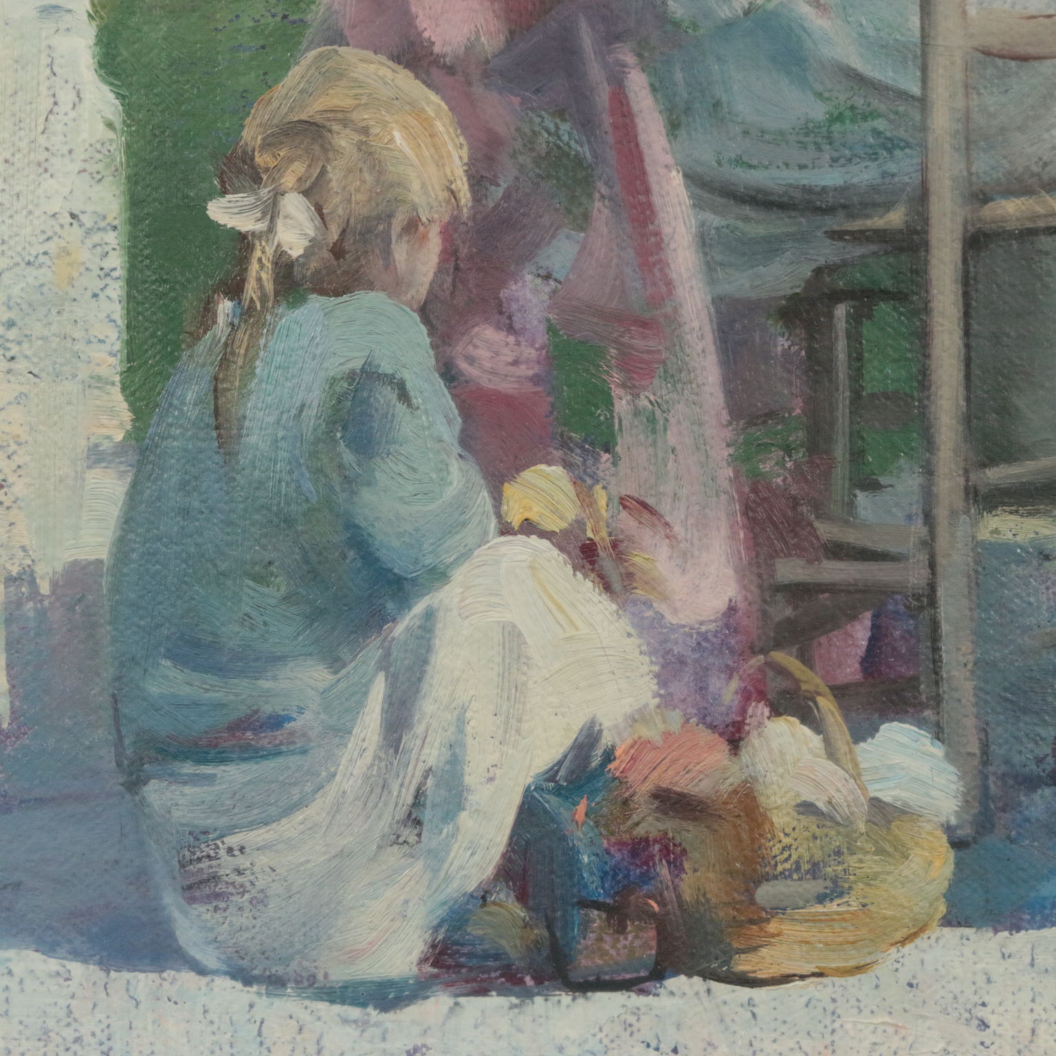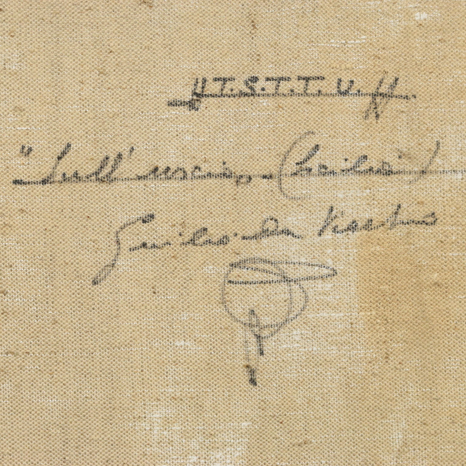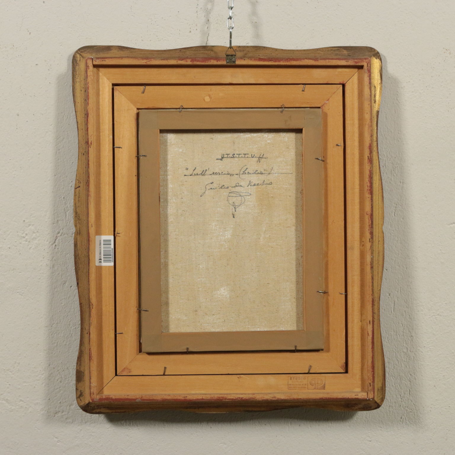 Olio su tela Firmato in basso a destra. Al retro presente titolo e ulteriore firma. Figlio del famoso Ferruccio Rontini, che gli fu maestro nella formazione artistica e di cui non volle mantenere il cognome per non sfruttarne la celebrità, Giulio Da Vicchio ebbe artisticamente un primo periodo formativo legato alla sua terra d'origine, il Mugello e al soggiorno a Livorno, volto alla ricerca di una completezza tecnica, allo studio del "vero" e all'assorbimento di emozioni, di atmosfere e di valori umani. I soggetti principali di questo periodo sono soprattutto paesaggi ma e' presente in questa pittura lo studio e l'interesse verso i pensionati, i contadini ed i pescatori, soggetti che poi diventeranno caratterizzanti della sua pittura. Il secondo periodo, coinciso con il suo matrimonio, è quello dell' esperienza in Sicilia e del rapporto fremente con questa terra. Giulio da Vischio viene letteralmente fulminato da quell'atmosfera piena, ricca anche di mistero e con moltissime cose da scoprire, che lo porta a rileggere gli stessi soggetti preferiti, i volti dei contadini e dei pescatori, rappresentati come gruppi quasi scultorei di figure fuse, legate tra loro nei gesti che caratterizzano da sempre il loro lavoro per glorificare la vita. Solo nel terzo periodo della sua vita Da Vicchio passa ad una interpretazione paesaggistica intimista e poetica. Il dipinto qui proposto rientra nella produzione del secondo periodo. E' presentato in cornice a vassoio.