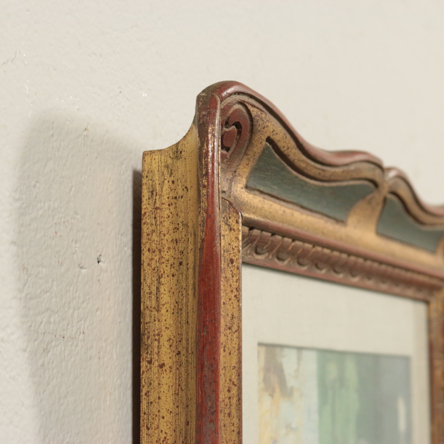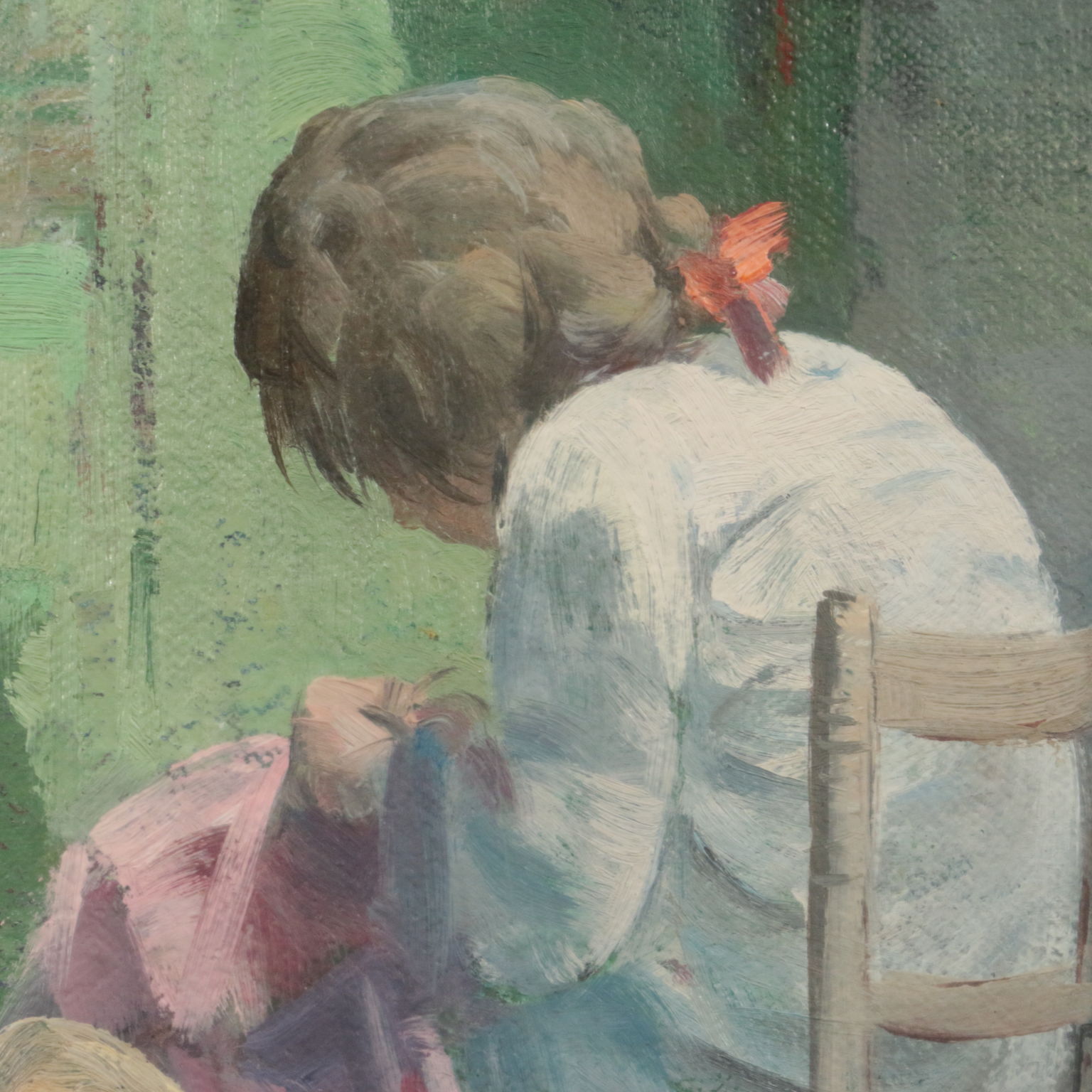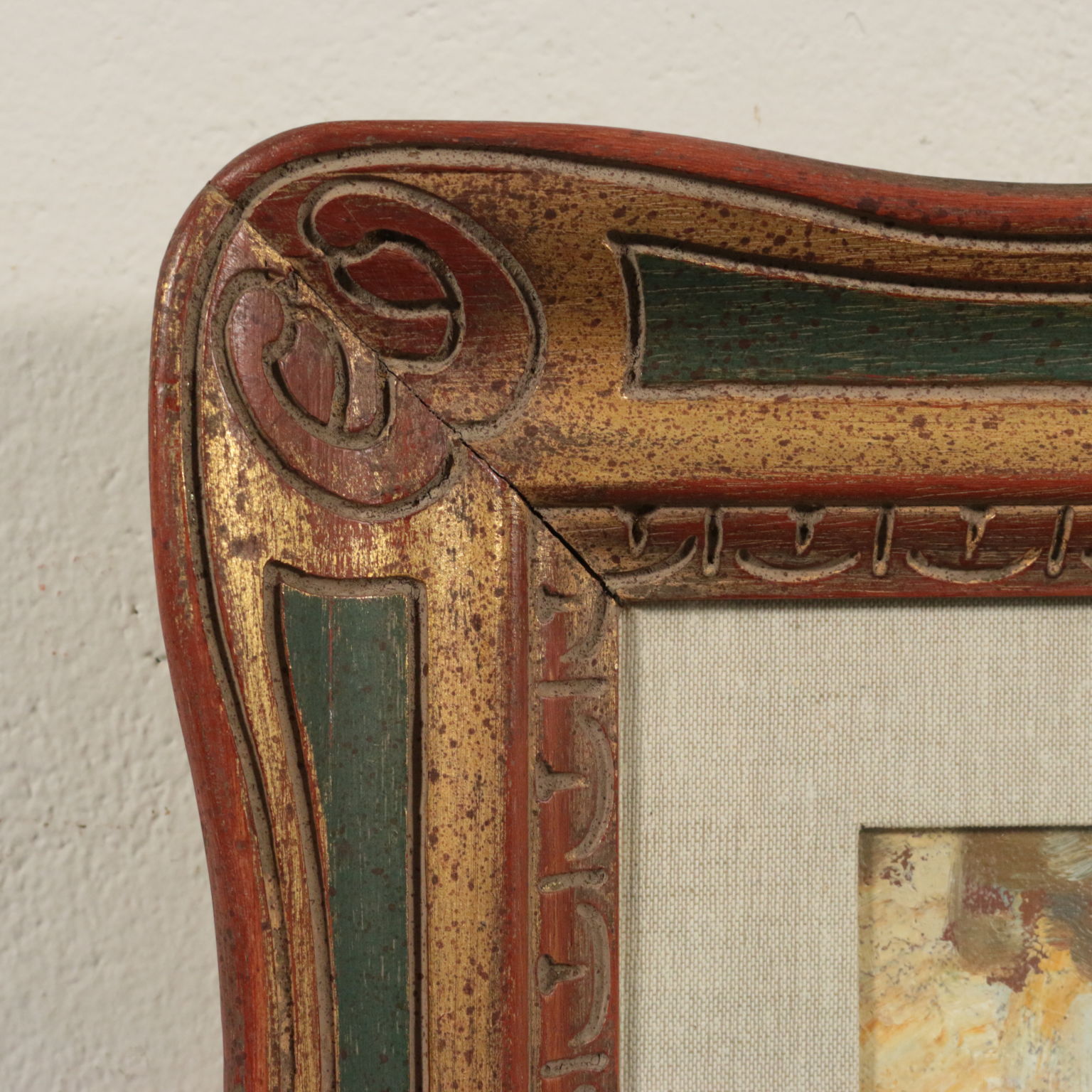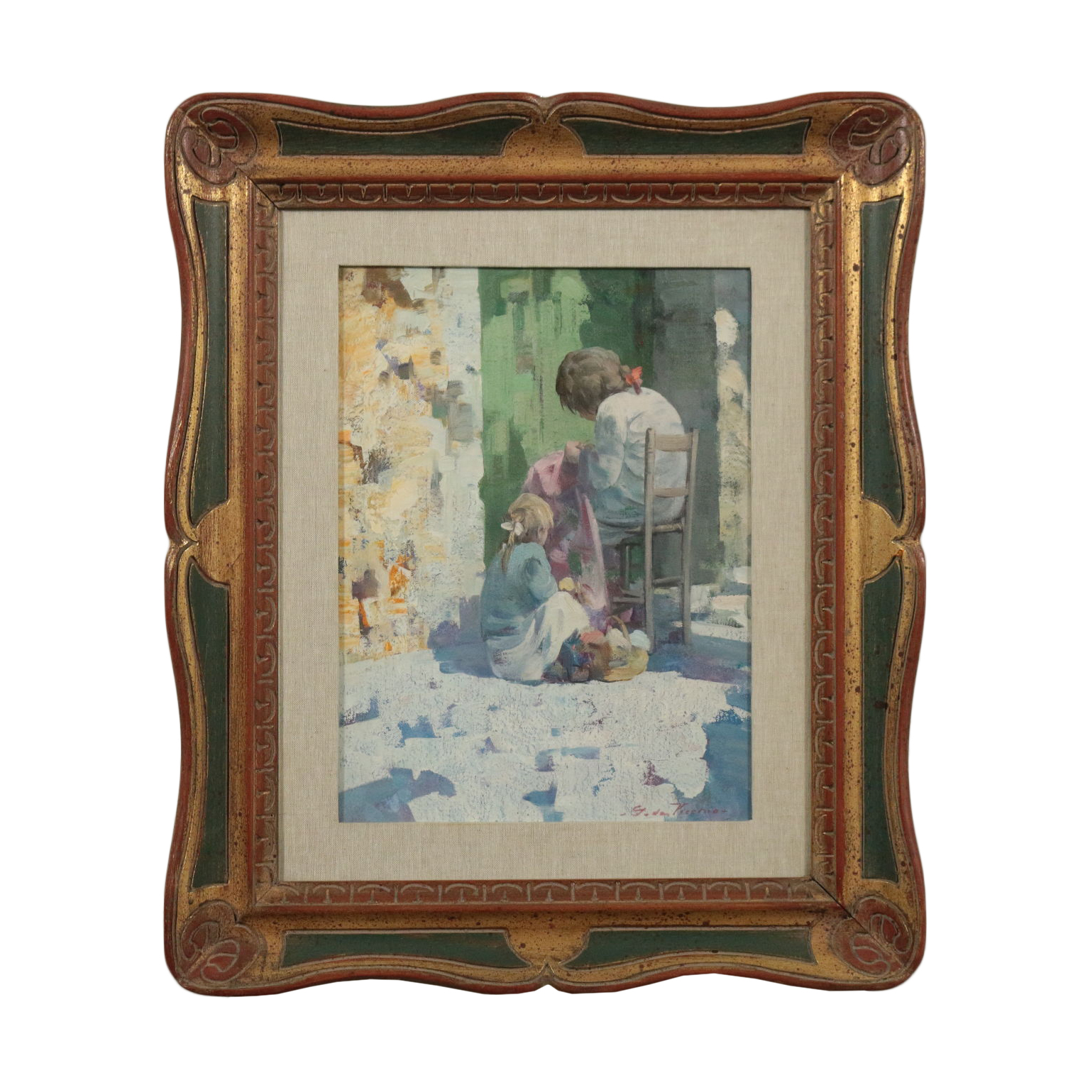 Olio su tela Firmato in basso a destra. Al retro presente titolo e ulteriore firma. Figlio del famoso Ferruccio Rontini, che gli fu maestro nella formazione artistica e di cui non volle mantenere il cognome per non sfruttarne la celebrità, Giulio Da Vicchio ebbe artisticamente un primo periodo formativo legato alla sua terra d'origine, il Mugello e al soggiorno a Livorno, volto alla ricerca di una completezza tecnica, allo studio del "vero" e all'assorbimento di emozioni, di atmosfere e di valori umani. I soggetti principali di questo periodo sono soprattutto paesaggi ma e' presente in questa pittura lo studio e l'interesse verso i pensionati, i contadini ed i pescatori, soggetti che poi diventeranno caratterizzanti della sua pittura. Il secondo periodo, coinciso con il suo matrimonio, è quello dell' esperienza in Sicilia e del rapporto fremente con questa terra. Giulio da Vischio viene letteralmente fulminato da quell'atmosfera piena, ricca anche di mistero e con moltissime cose da scoprire, che lo porta a rileggere gli stessi soggetti preferiti, i volti dei contadini e dei pescatori, rappresentati come gruppi quasi scultorei di figure fuse, legate tra loro nei gesti che caratterizzano da sempre il loro lavoro per glorificare la vita. Solo nel terzo periodo della sua vita Da Vicchio passa ad una interpretazione paesaggistica intimista e poetica. Il dipinto qui proposto rientra nella produzione del secondo periodo. E' presentato in cornice a vassoio.