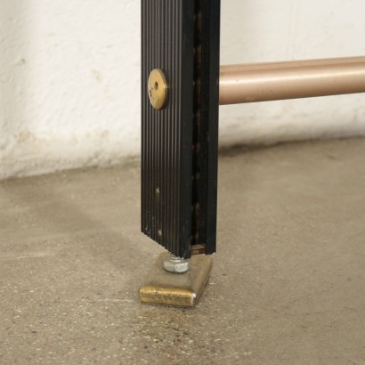 Libreria a parete, montanti in alluminio, ottone, legno impiallacciato mogano.