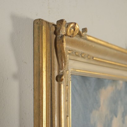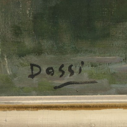 Olio su tela. Firmato Dossi in basso a sinistra. La modalità pittorica del dipinto rimanda alla produzione di Ivan Karpoff (1898-1970), pittore russo che a partire dal 1925 si formò e lavorò a Milano, utilizzando spesso lo pseudonimo Dossi. L'artista si fece apprezzare per la sua pittura orientata al verismo impressionistico italiano di fine '800, e si distinse prevalentemente per i paesaggi ed i ritratti. Nella sua produzione paesaggistica Karpoff seppe trasfondere, in scorci tipicamente italiani, soprattutto lombardi, la sensibilità caratteristica dell'arte slava; spesso collocò in essi elementi caratteristici dei paesaggi russi, ad esprimere la sua nostalgia nei confronti della madrepatria, alla quale non fece mai ritorno. L'opera è presentata in cornice.