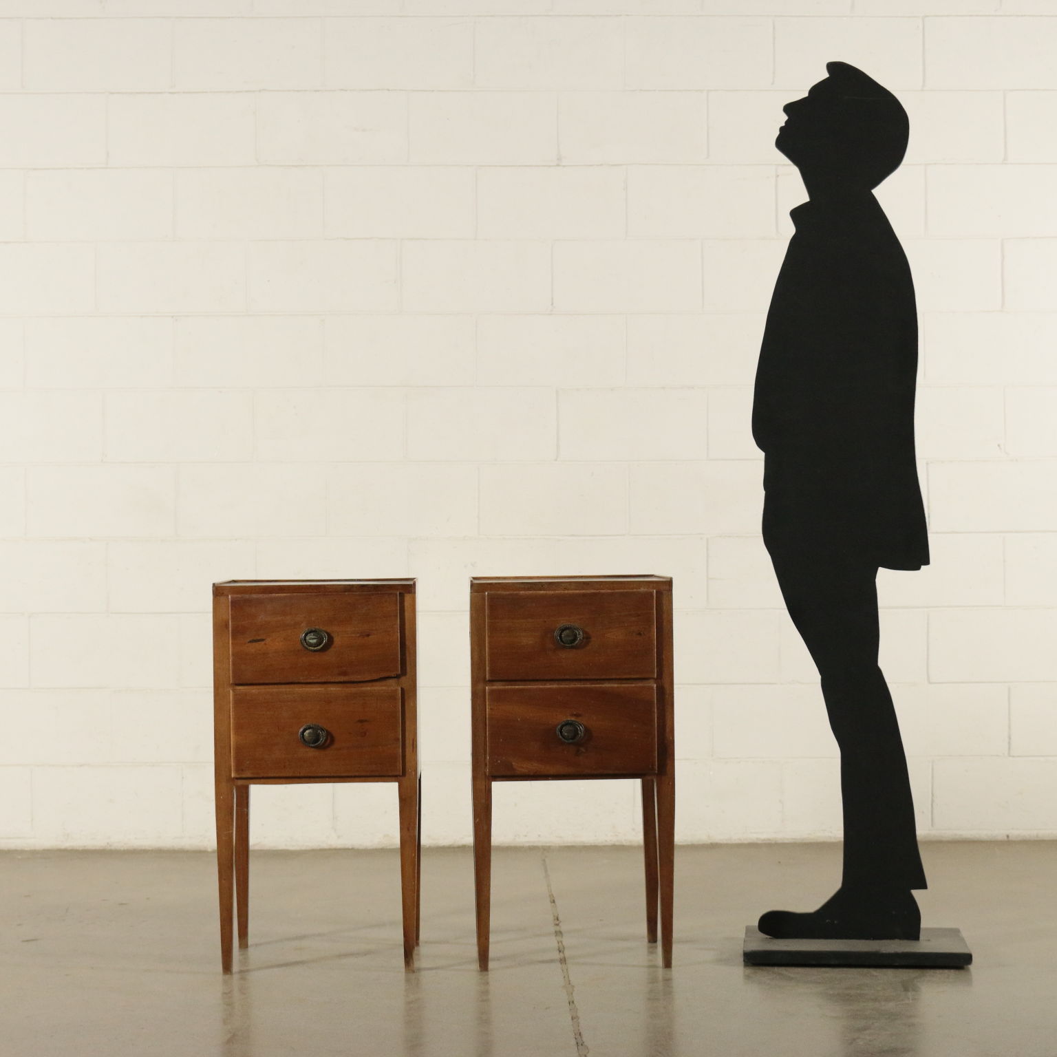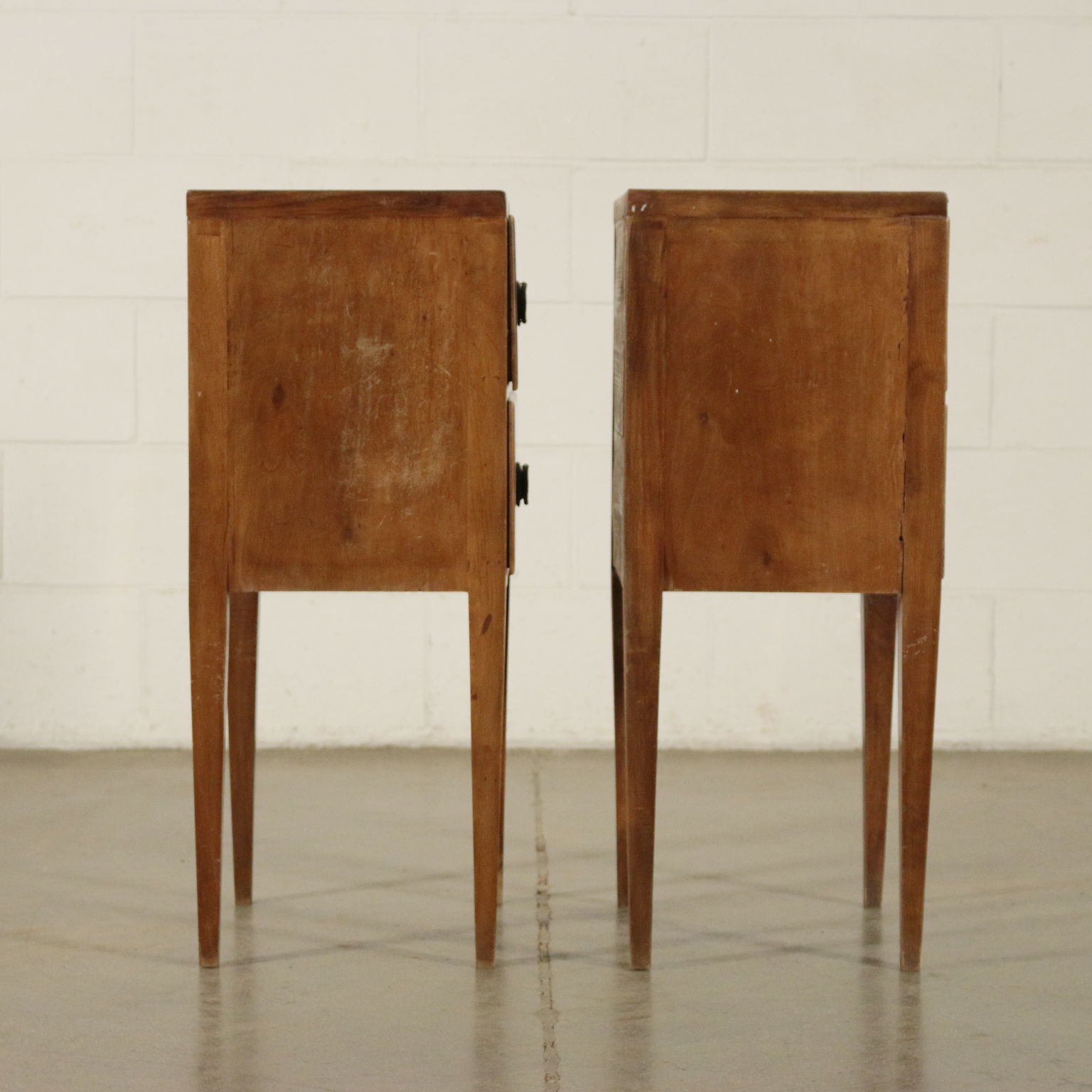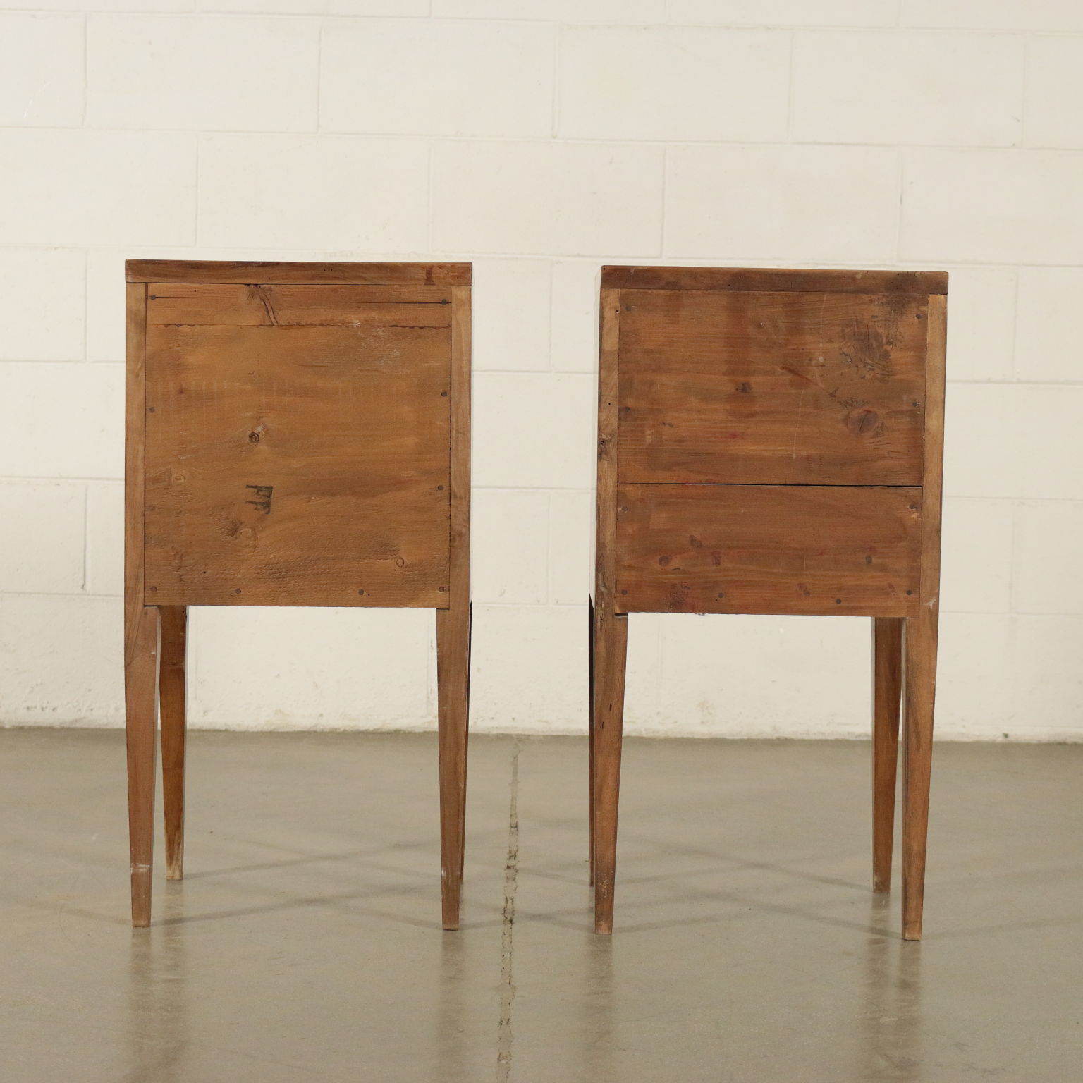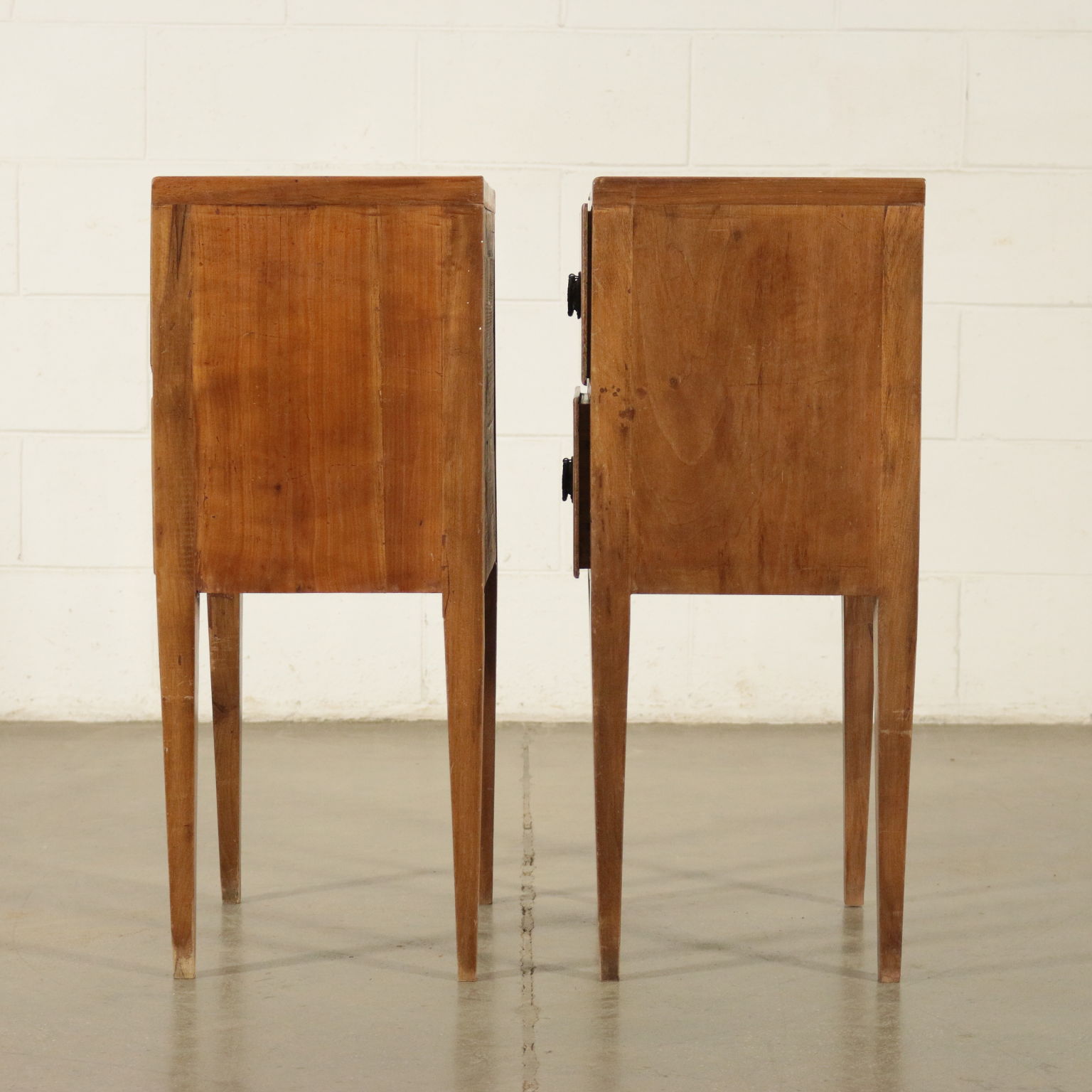 Coppia di comodini in stile direttorio, sorretti da sottili gambe tronco-piramidali, sul fronte presentano una coppia di cassetti sormontati; in noce, con maniglieria bronzea. Realizzati con parti di mobili antichi.