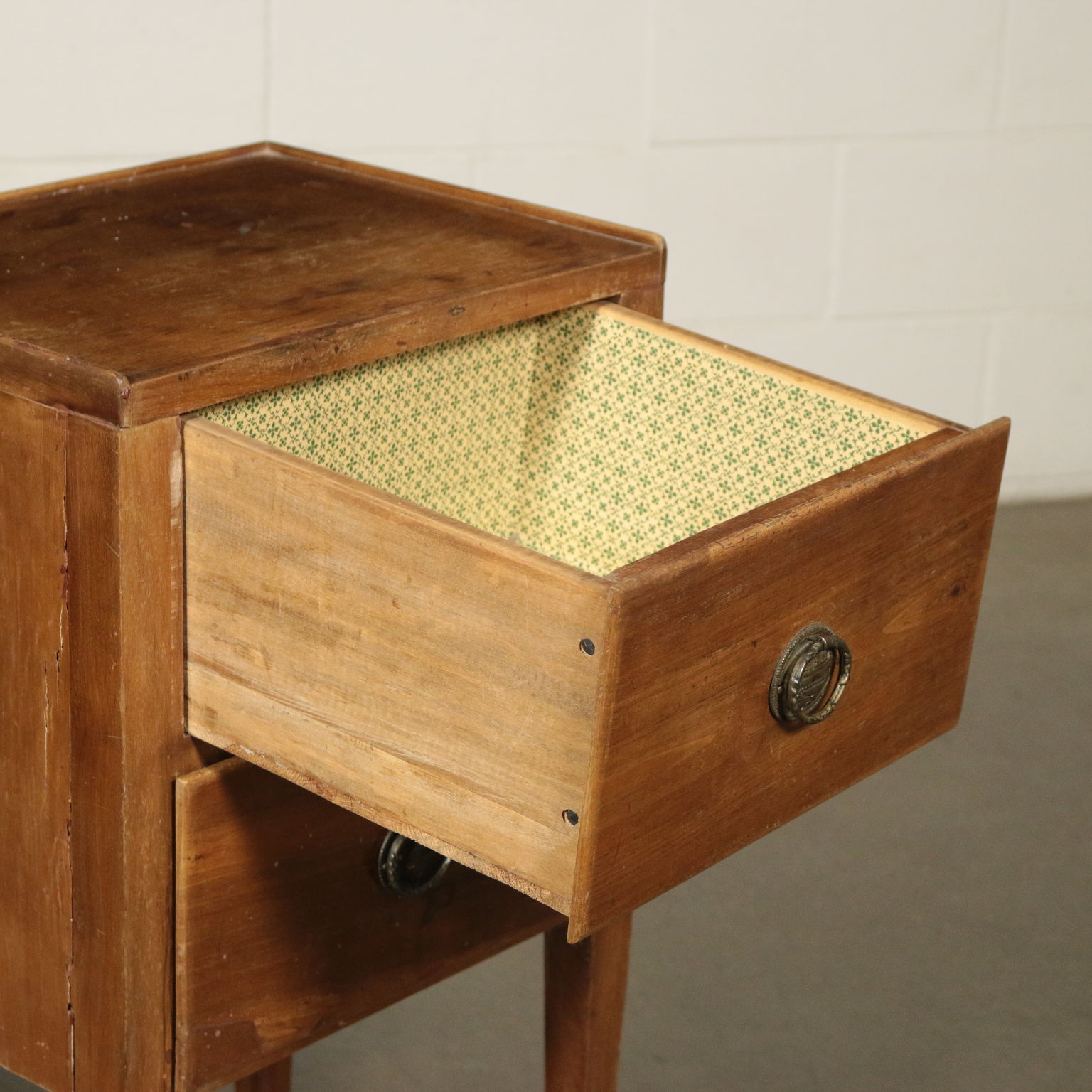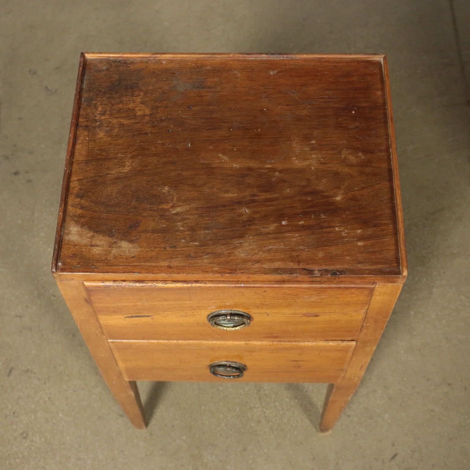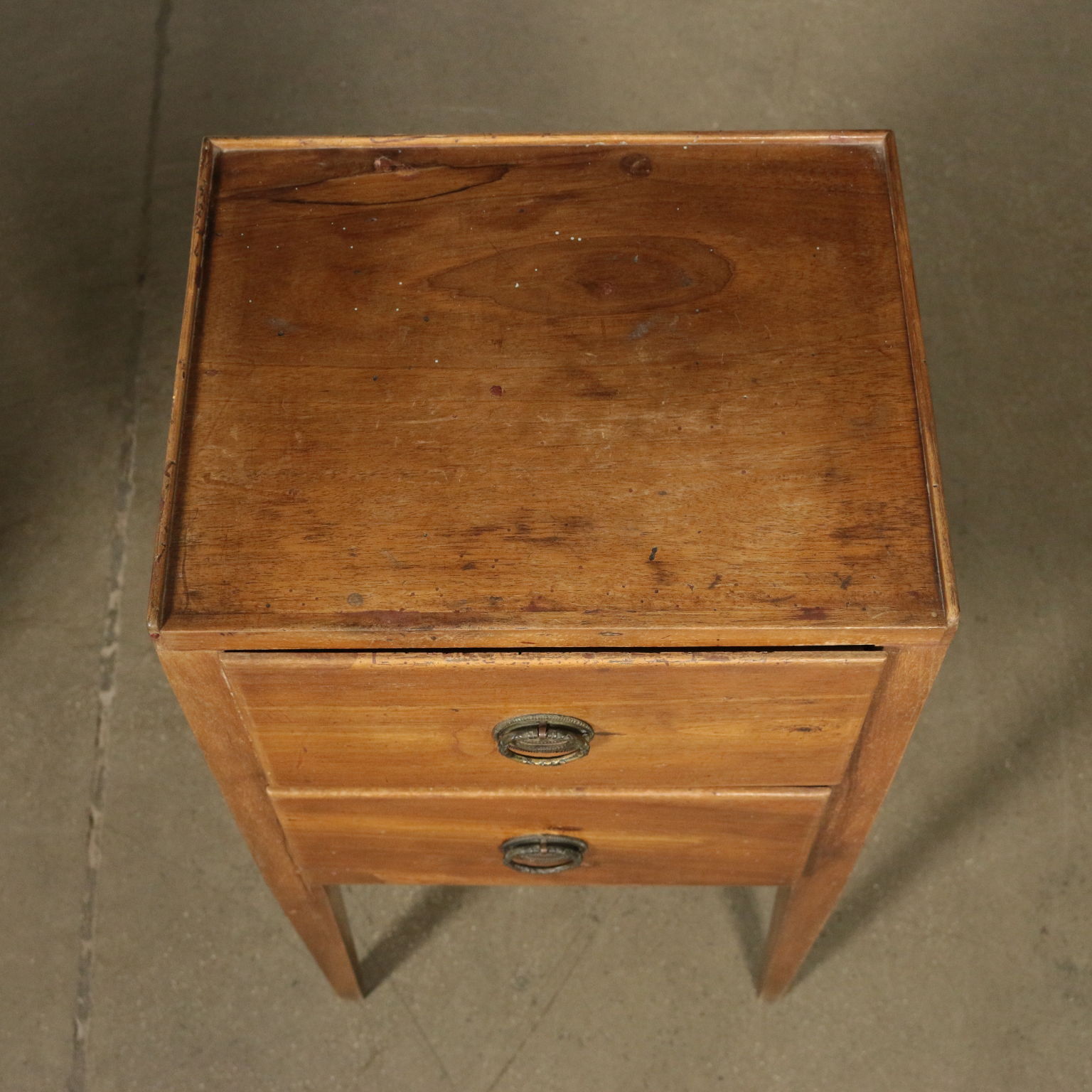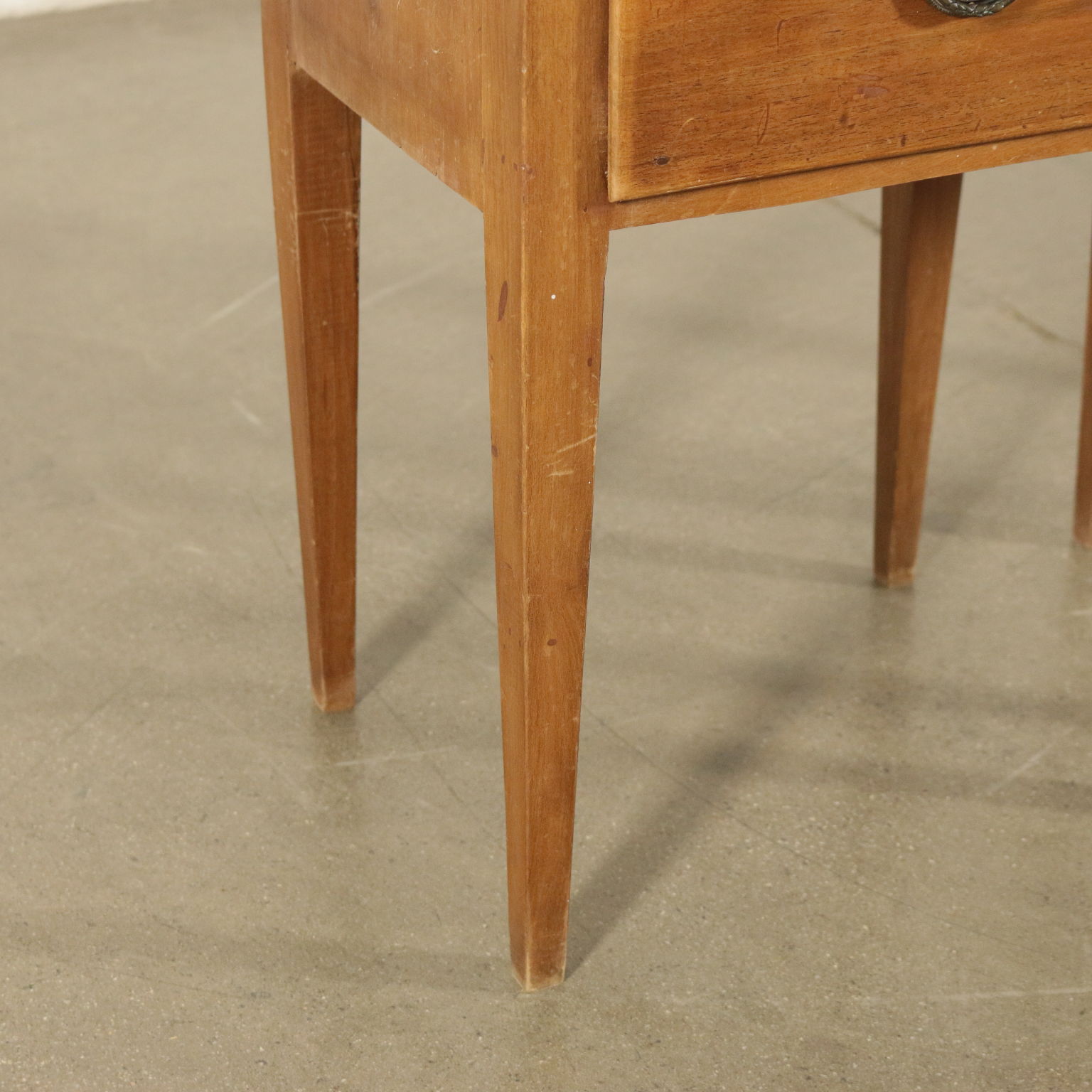 Coppia di comodini in stile direttorio, sorretti da sottili gambe tronco-piramidali, sul fronte presentano una coppia di cassetti sormontati; in noce, con maniglieria bronzea. Realizzati con parti di mobili antichi.