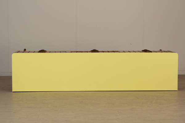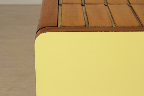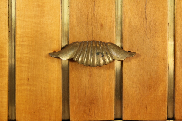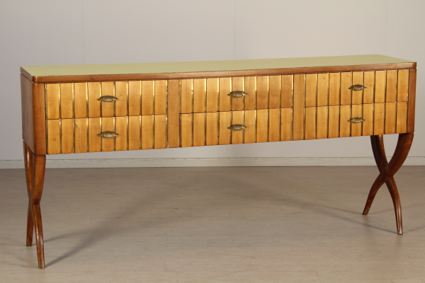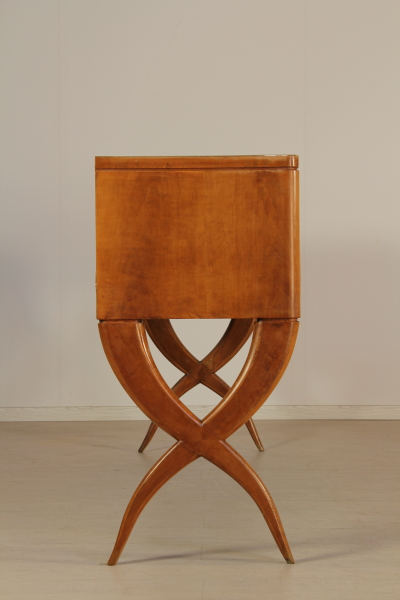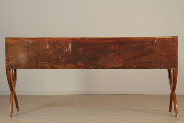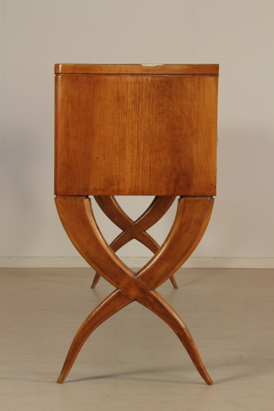 Mobile impiallacciato ciliegio, sei cassetti con fasce in legno alternate a lamine in ottone. Gambe in ciliegio incrociate ad "X". Piano in formica.