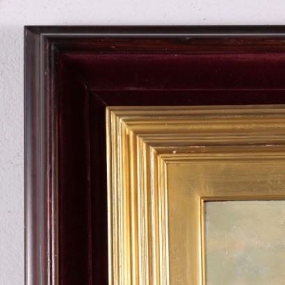 Olio su tavoletta. Firmato in basso a destra. Al retro presente timbro dello studio-bottega d'arte dell'artista a Napoli. Lo scorcio della baia di Napoli propone una veduta di un approdo per barchette di pescatori, lungo una spiaggia popolata di numerose figure; si erge sullo sfondo il Vesuvio, il cui contorno sfuma nel cielo nuvoloso e grigio, che toglie la luce del sole alla giornata, illuminata piuttosto dal vivace viavai di gente sul lungomare. Molto poco si conosce dell' artista napoletano Eduardo Scognamiglio: nella sua produzione si ritrovano numerosi scorci e vedute, soprattutto napoletane, ma anche scene di genere popolare e ritratti di figure popolari. La sua produzione ebbe largo seguito anche all'estero, ove venne conosciuto, apprezzato, e ampiamente richiesto, guadagnandone il nome inglesizzato di Edwardo. Il dipinto è presentato in cornice in stile.