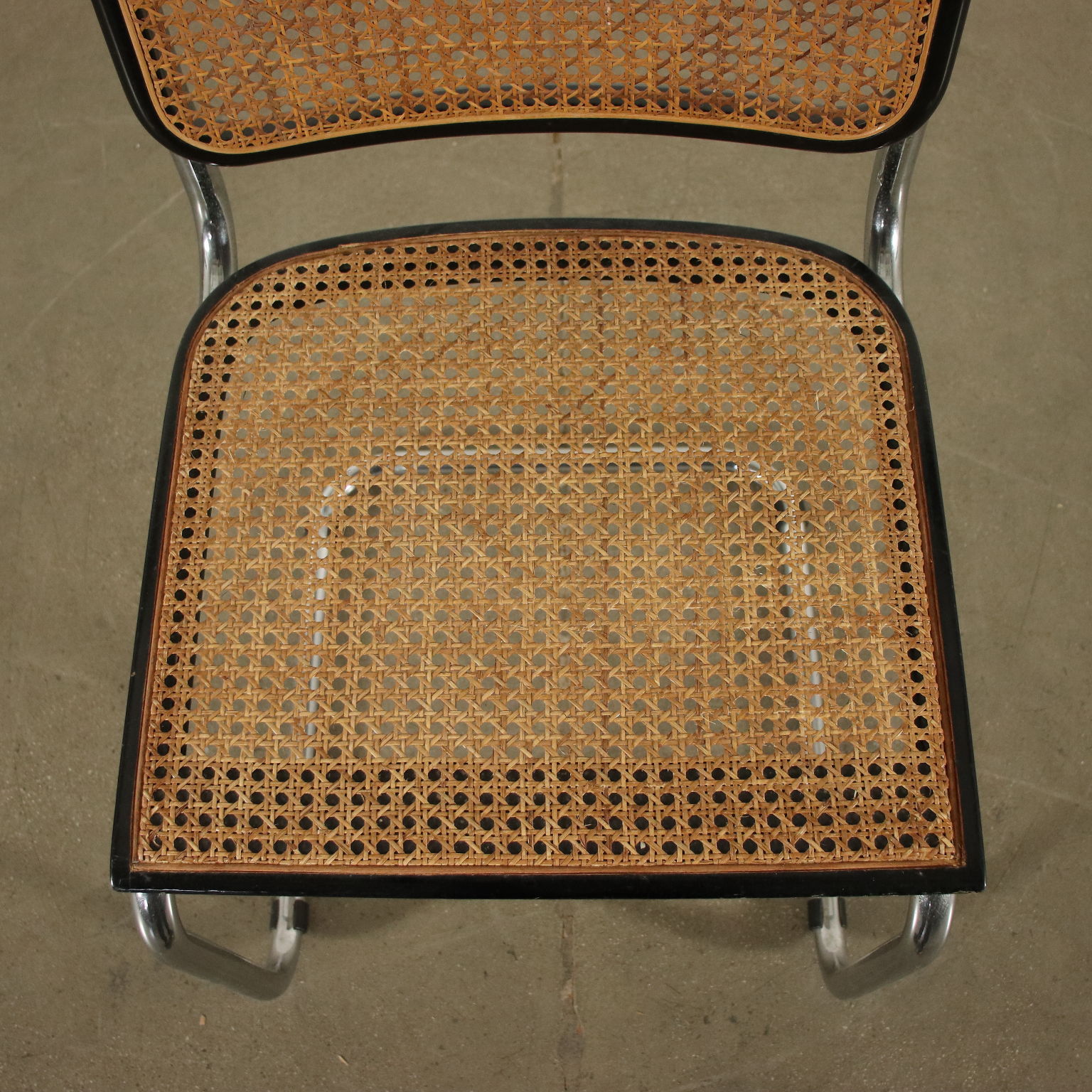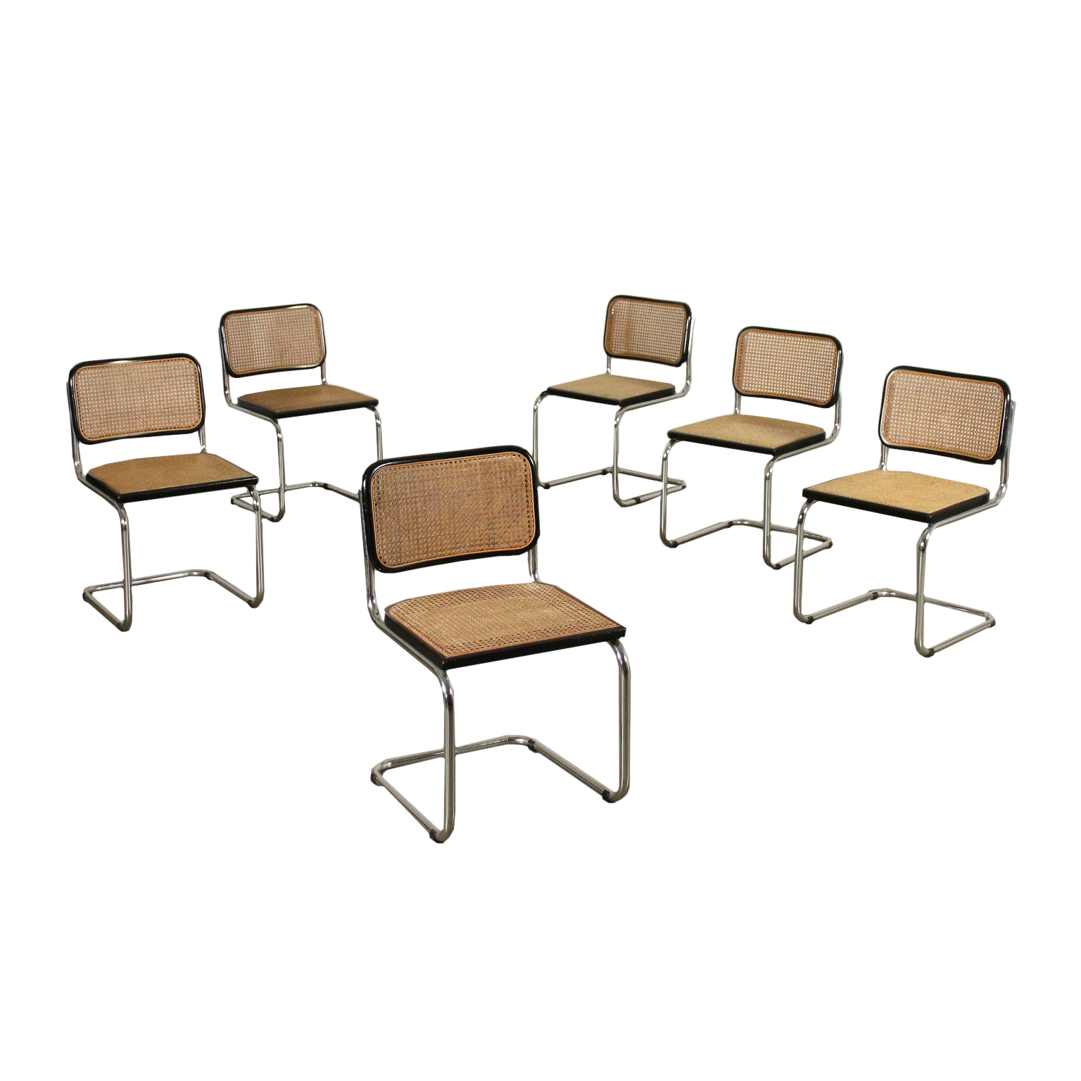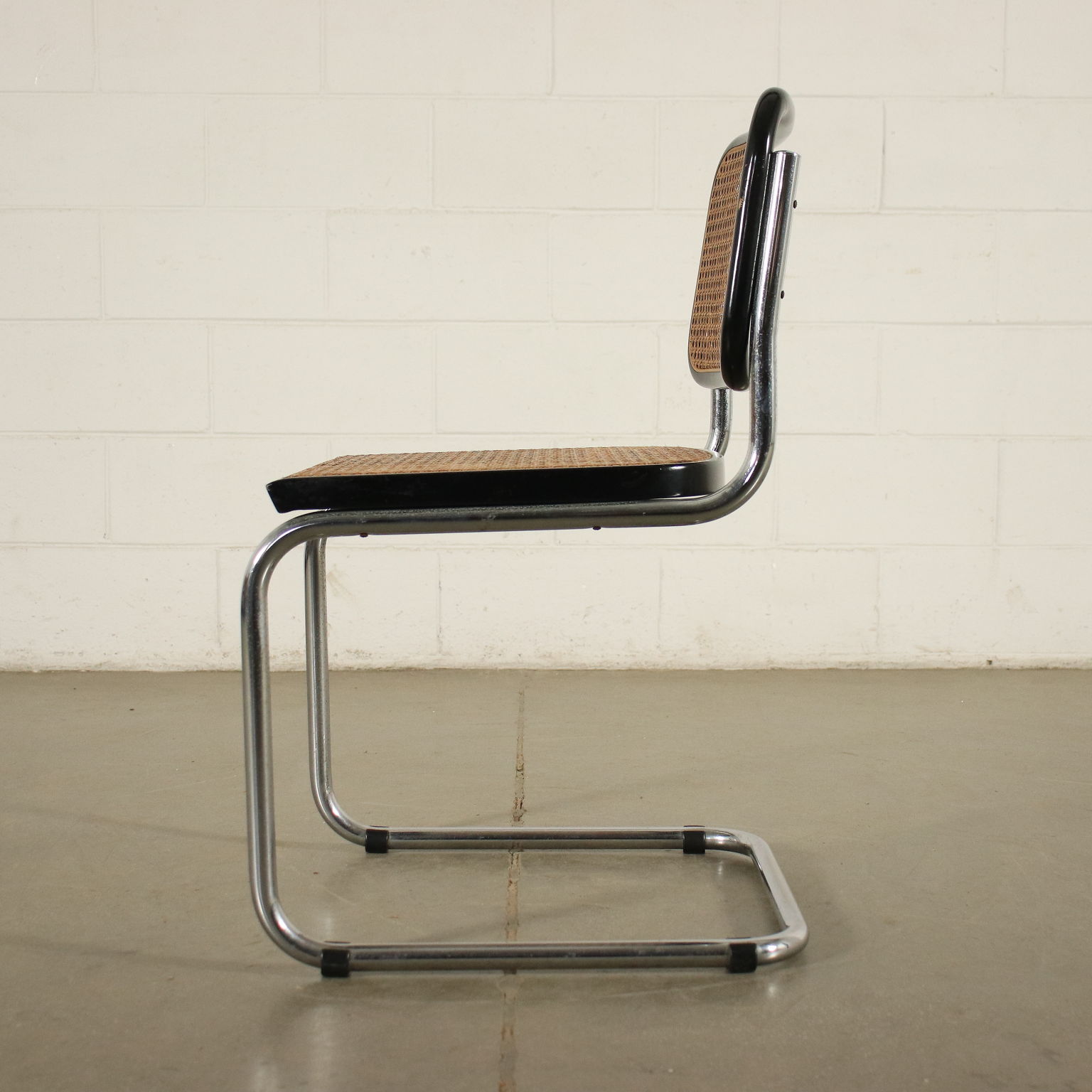 Gruppo di 6 sedie nello stile di Marcel Breuer. Tubolare in metallo cromato, telaio in legno e paglia di Vienna.