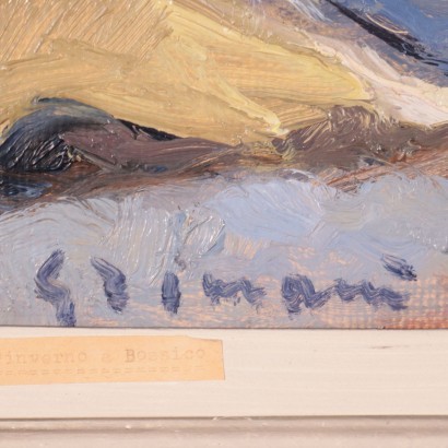 Olio su faesite. Firmato in basso a sinistra. In basso a sinistra sulla cornice piccolo cartiglio con il titolo. Il pittore bergamasco Beppe Grimani esordì nel settore dell'affresco sacro, realizzando opere -sia affreschi che vetrate - sia nella Bergamasca che fuori. A partire dagli anni' '50, abbandona l'arte sacra per dedicarsi alle composizioni floreali, che gli avvalgono il nome di "artista dei cardi" per la predilezione per questo fiore, ma anche al paesaggio, da alcuni ritenuti la parte più valida della sua produzione. Il paesaggio presentato propone uno scorcio invernale di una località sopra il lago d'Iseo. In cornice. pittore d'affreschi a soggetto sacro, lavorando fu chiamato "il pittore dei cardi" perché negli anni Sessanta e Settanta del Novecento produsse soprattutto fiori in vaso, cardi in particolare. Con quelle opere aveva ottenuto un notevole successo non solo a Bergamo ma anche in tutte le città italiane in cui espose.