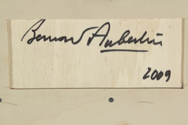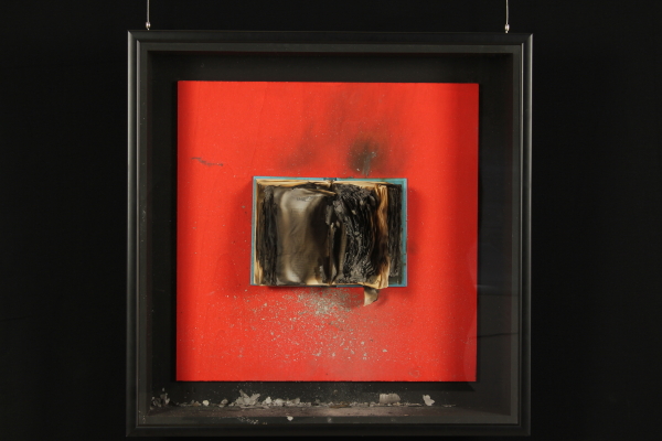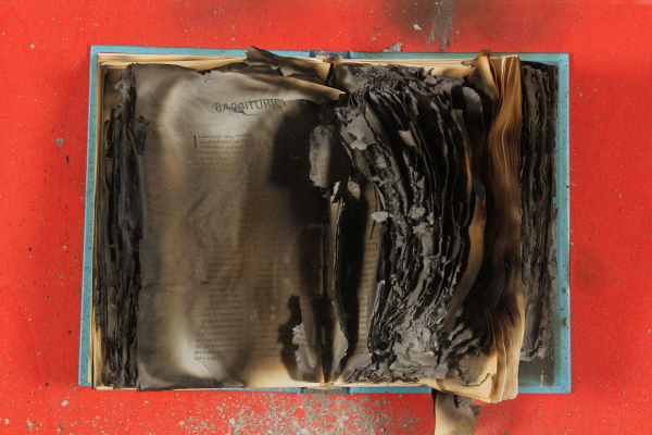 Libro bruciato su tavola rossa. Firma e data al retro.