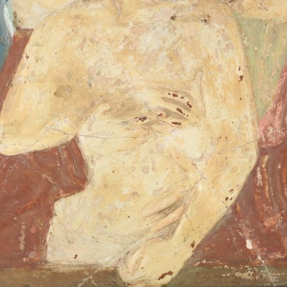 Placca in gesso patinata a policromia raffigurante la Pietà o Cristo morto sorretto dalla Madonna e da San Giovanni. Copia da Giovanni Bellini.