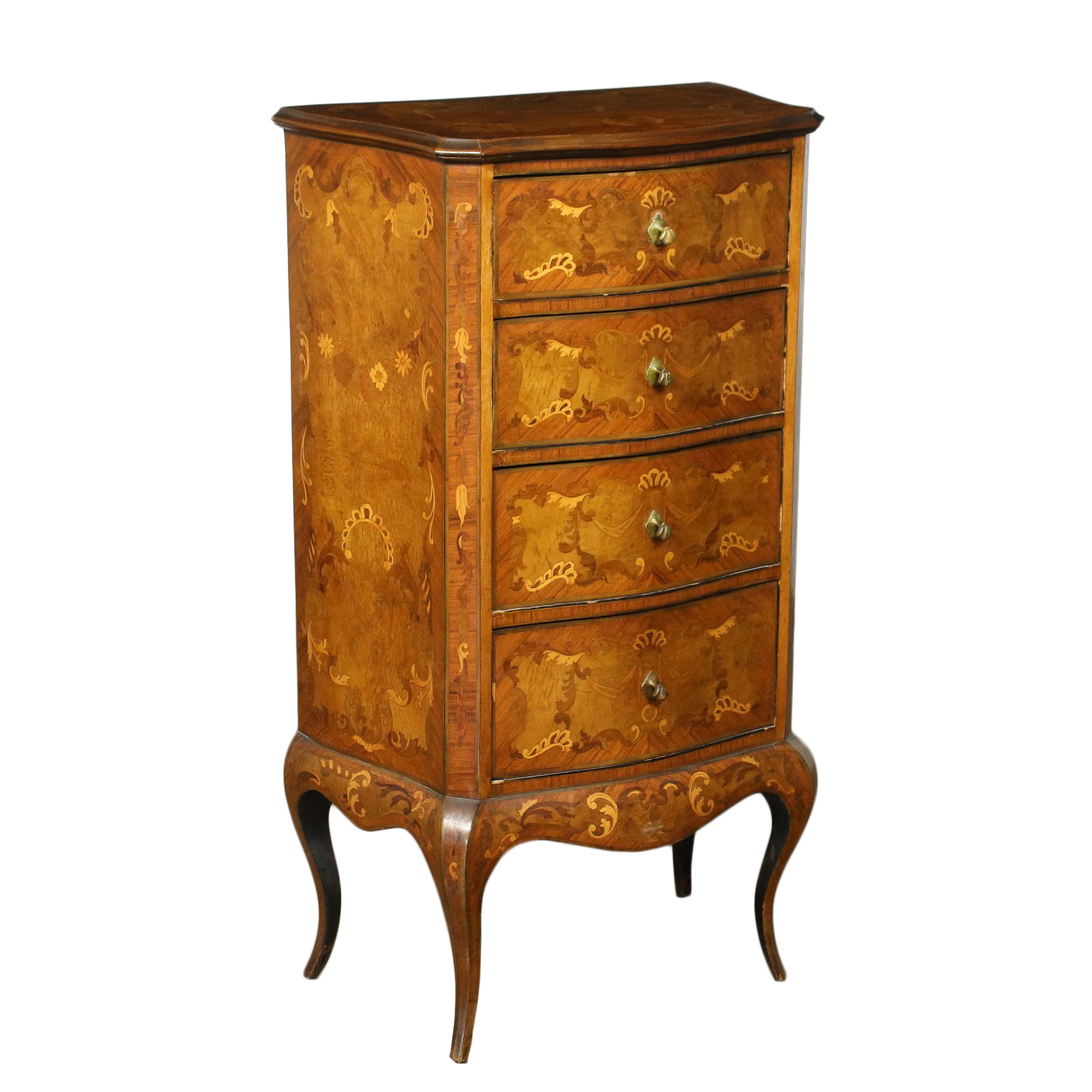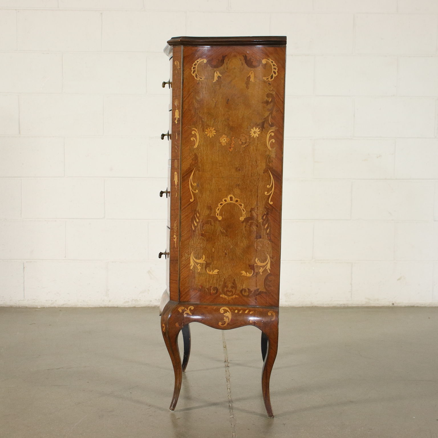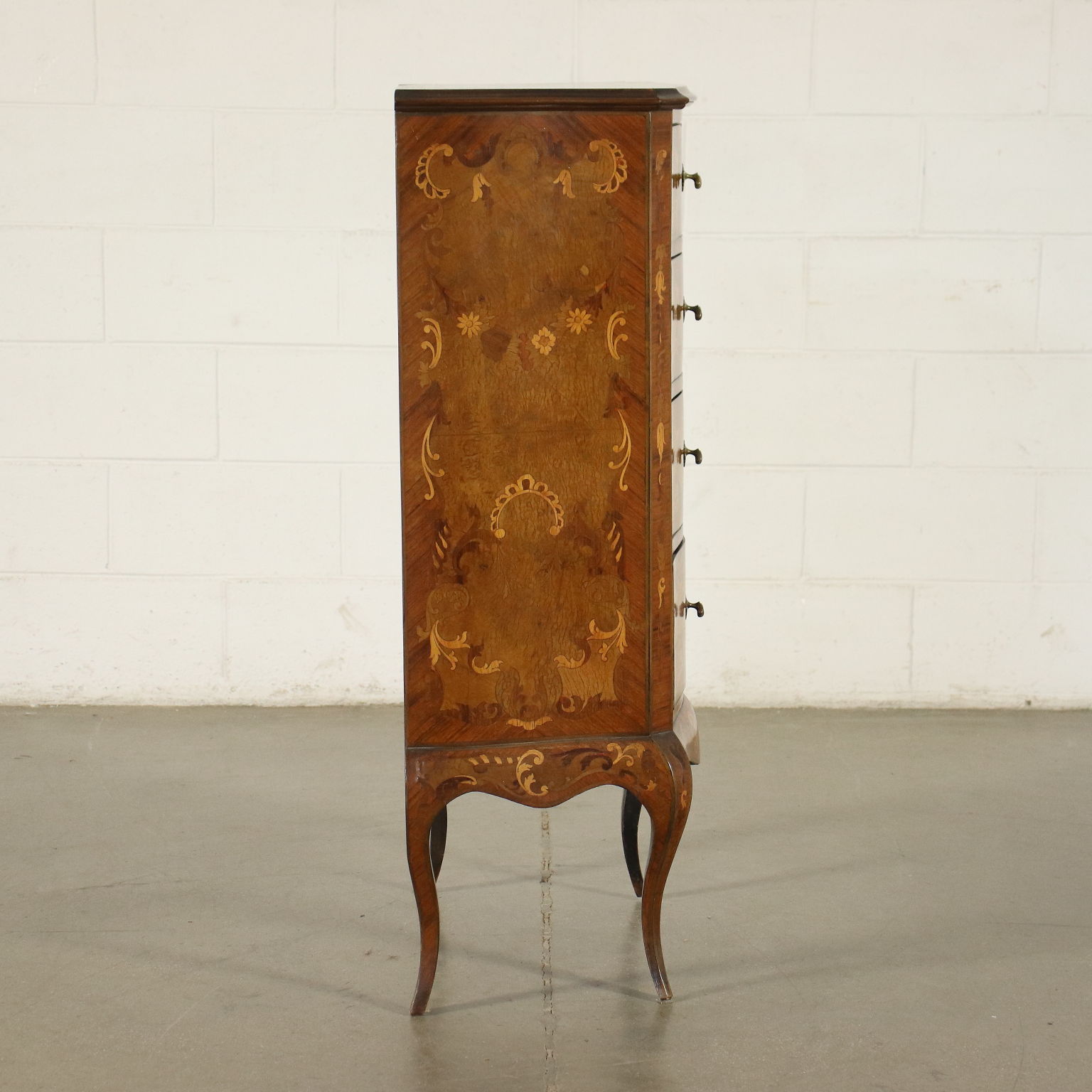 Cassettiera in stile sorretta da gambe mosse, sul fronte presenta quattro cassetti. Intarsiata con motivi fitomorfi in essenze varie, gli interni sono in pioppo.