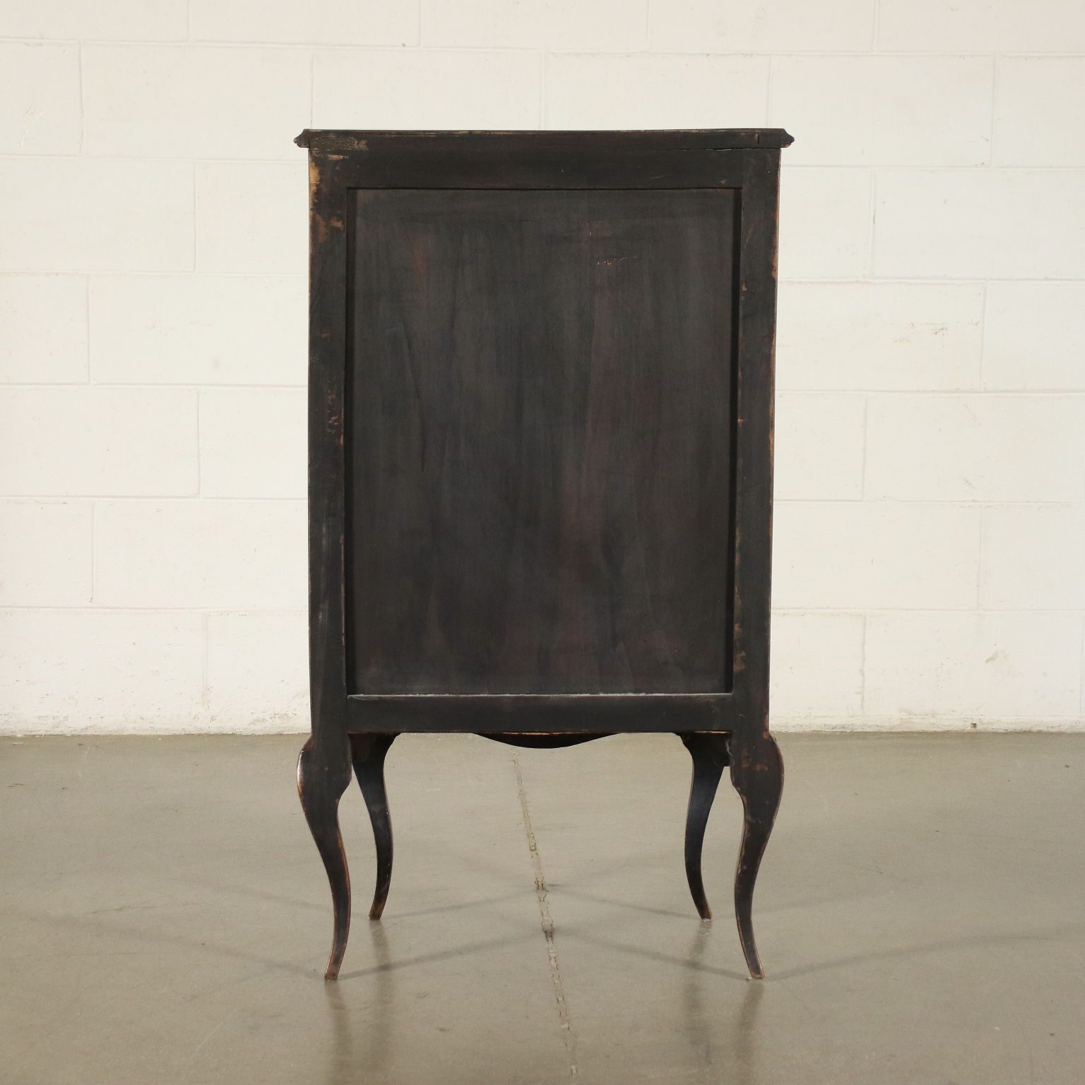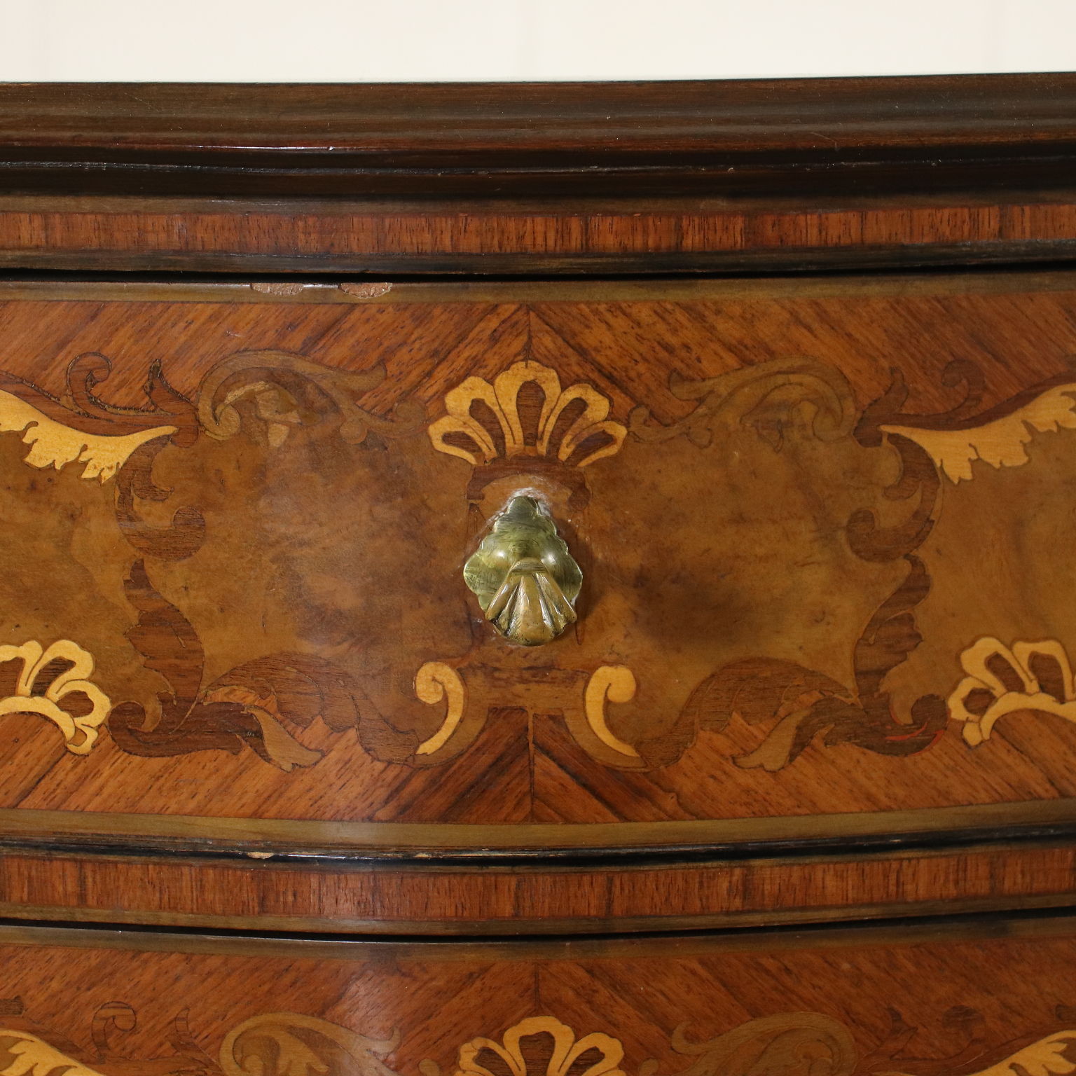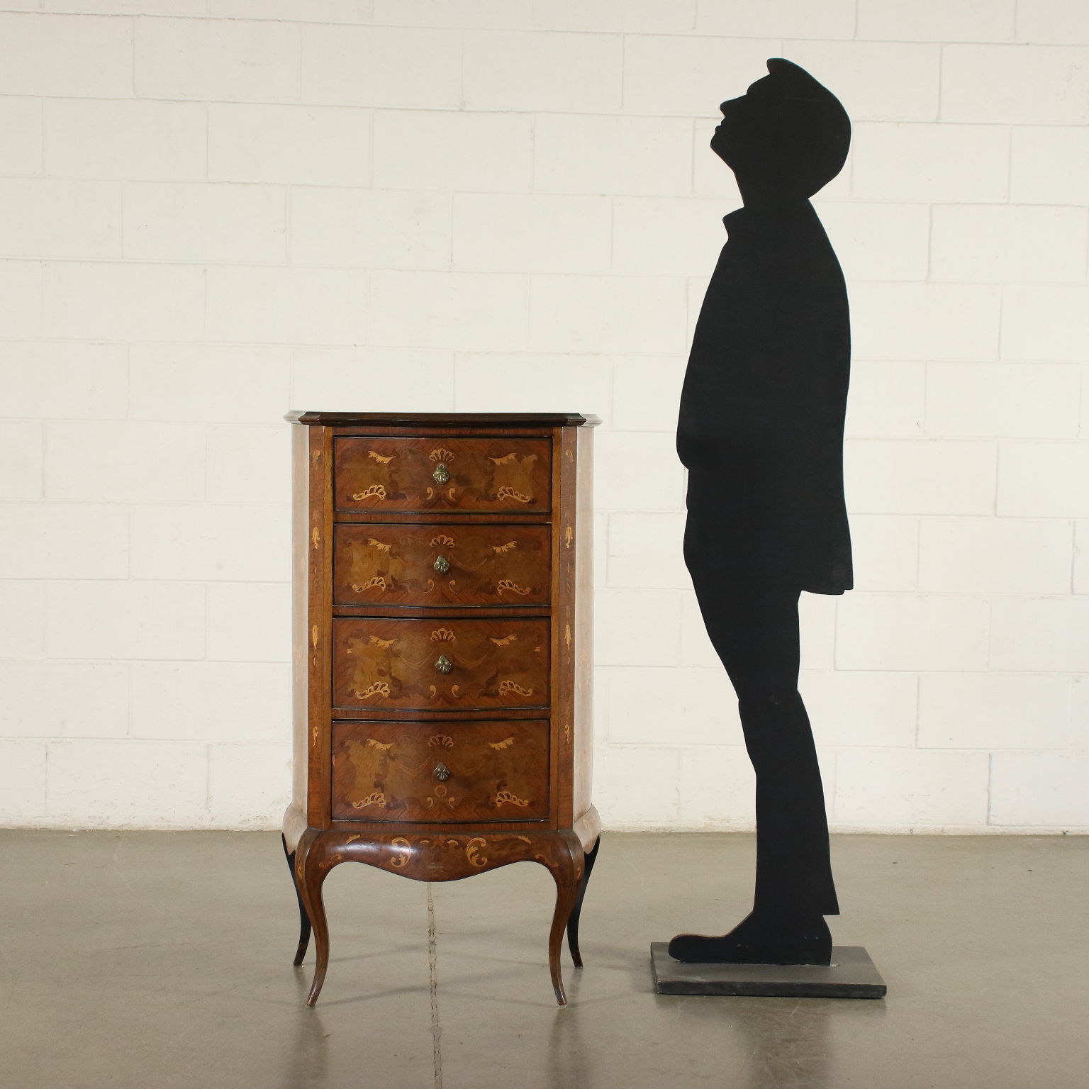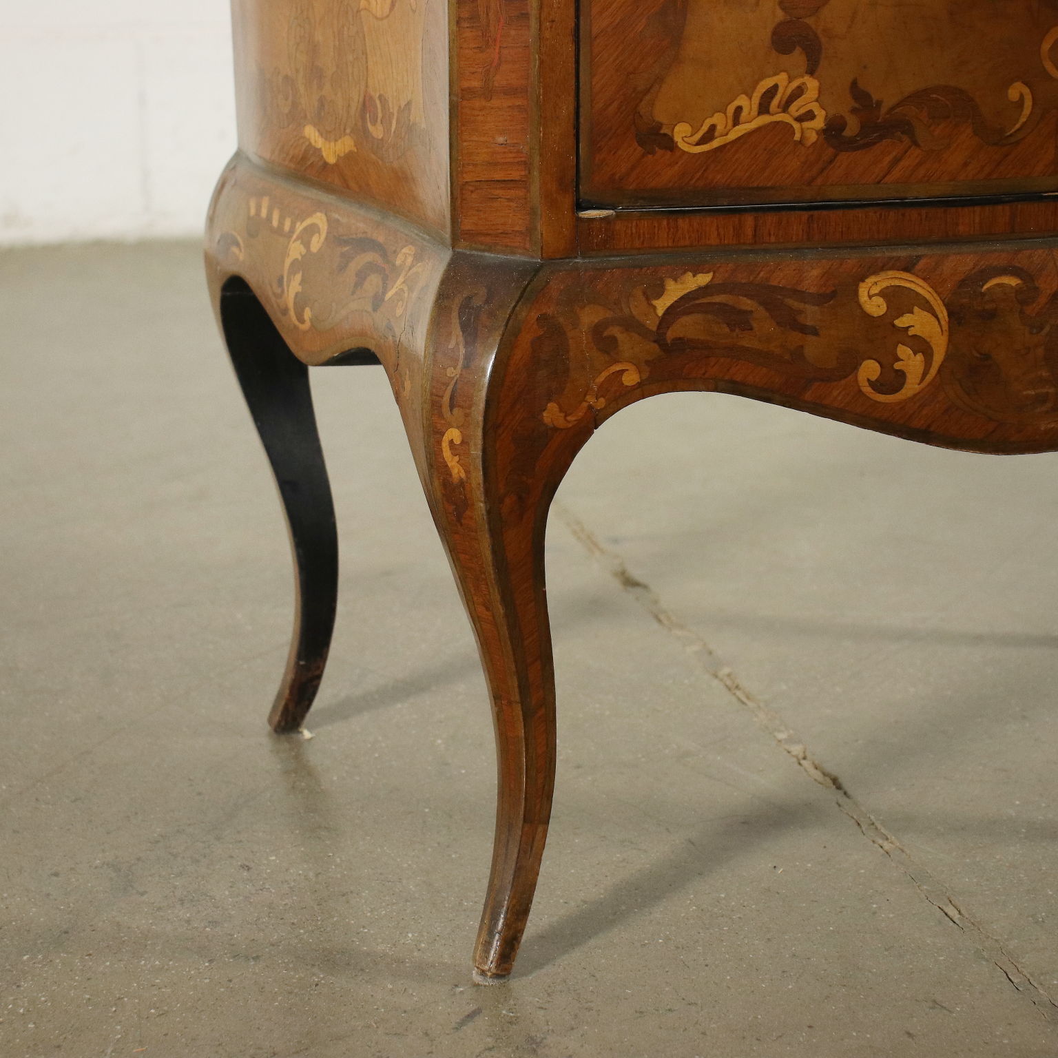 Cassettiera in stile sorretta da gambe mosse, sul fronte presenta quattro cassetti. Intarsiata con motivi fitomorfi in essenze varie, gli interni sono in pioppo.