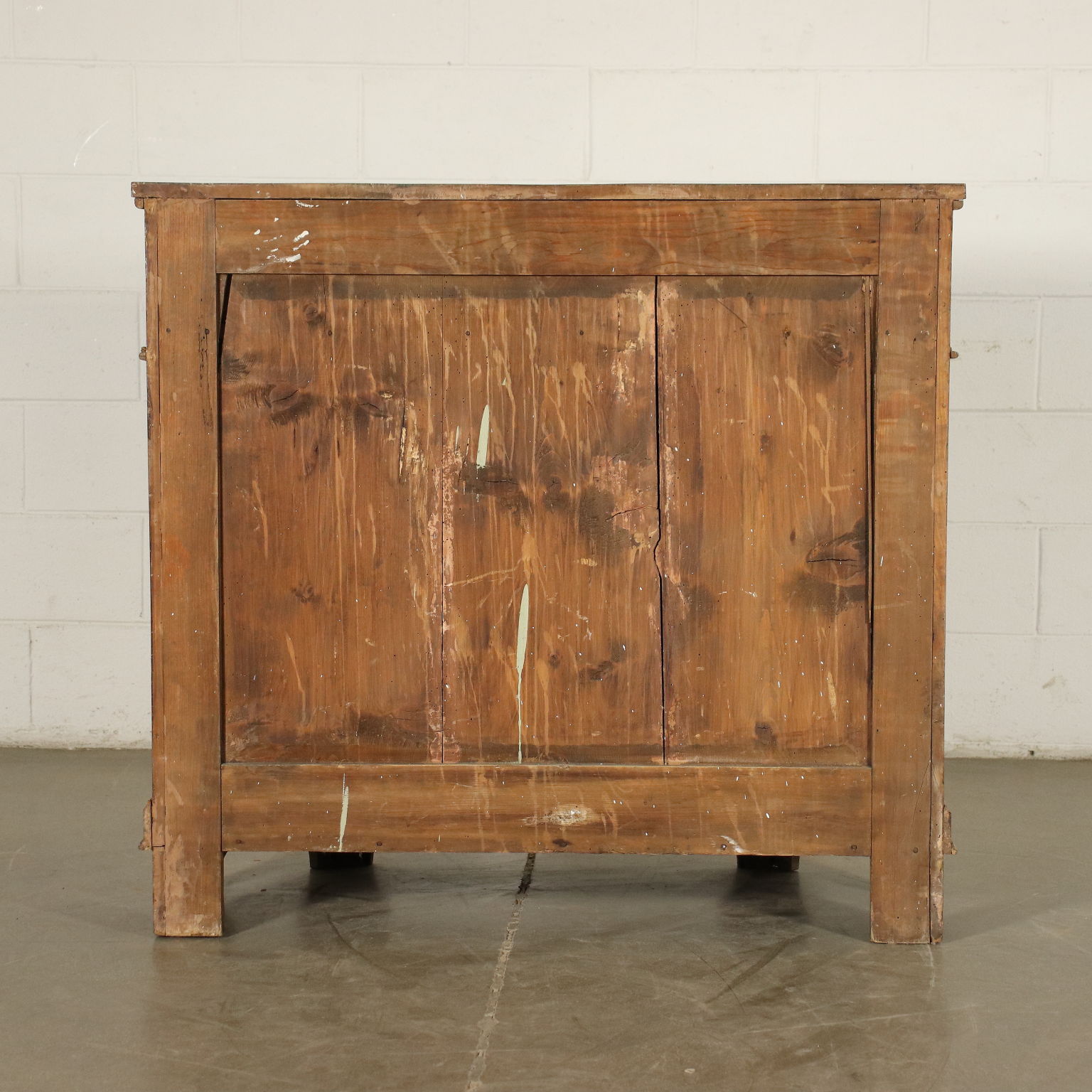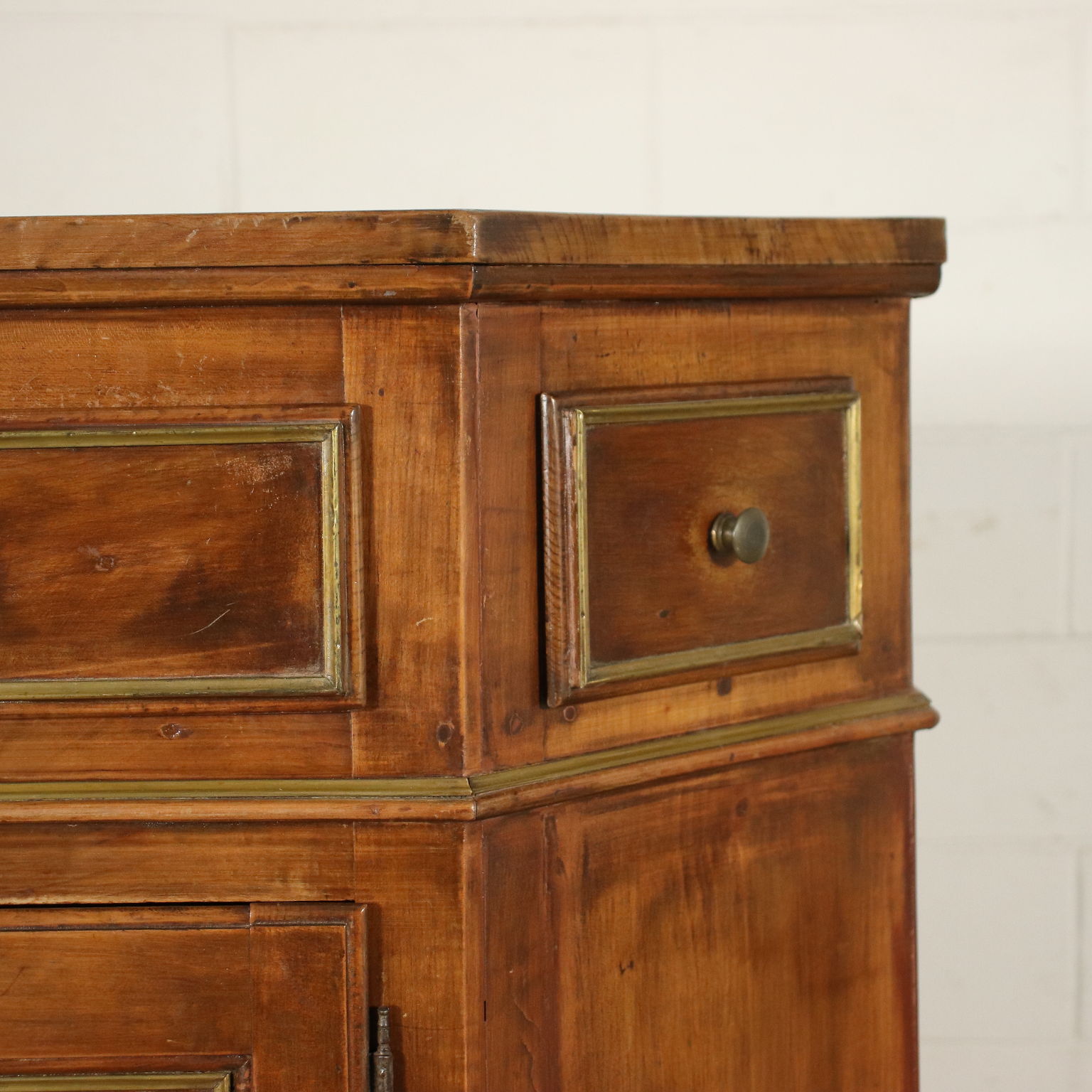 Credenza scantonata lombardo veneta, sorretta da piedini a mensola, sul fronte presenta due ante sormontate da un cassetto, altri due cassetti sono presenti nella fascia sottopiano sui fianchi a 45°. In ciliegio con cornicette in ottone, gli interni sono in abete; ha subito restauri e modifiche.