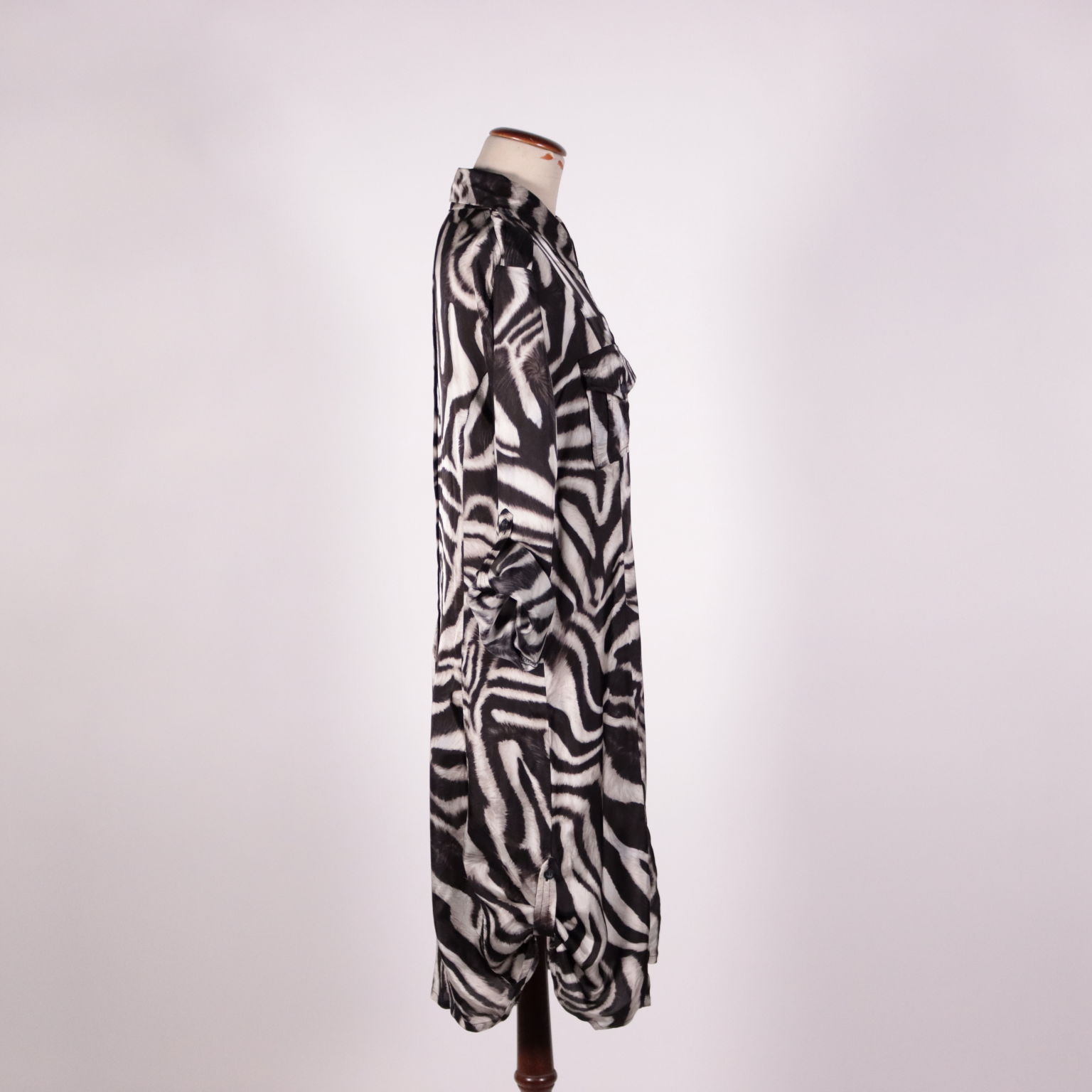 Abito modello chemisier dall'originale fantasia zebrata di Guess by Marciano, in pura viscosa. Abbellita da controspalline con passante e bottoncino, presenta 2 taschine applicate sul petto e polsini chiusi da 2 bottoni e un particolare taschino accessorio.