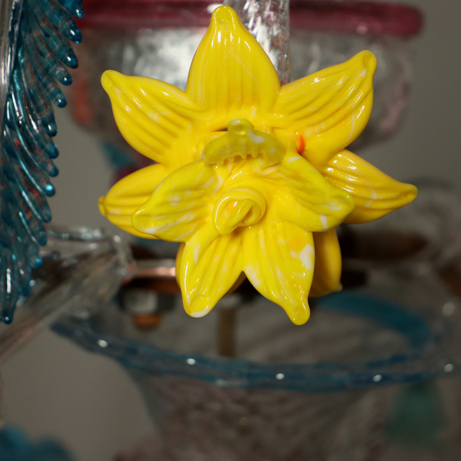 Coppia di lampadari Murano a 12 luci a doppio palco, in vetro soffiato e vetro soffiato colorato, ornati con pendenti dalla forma di corolle floreali. Elettrificati.