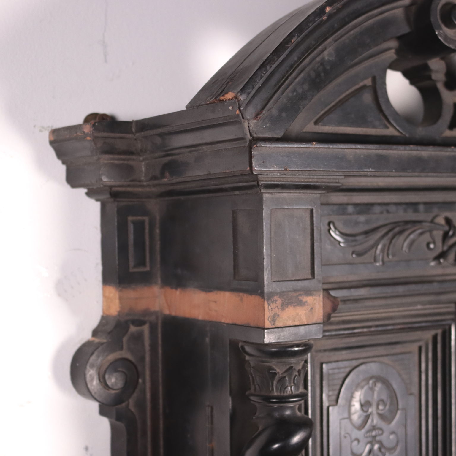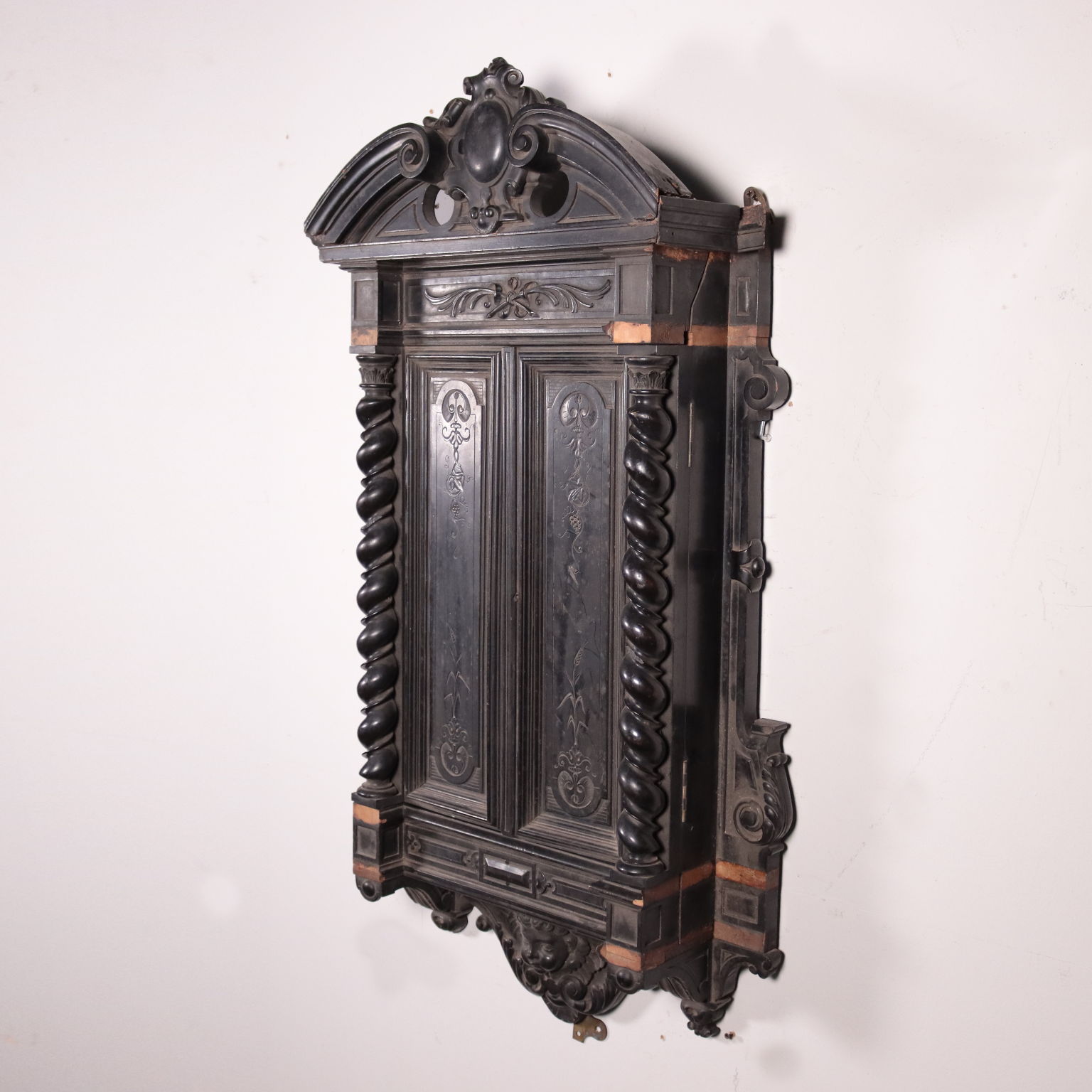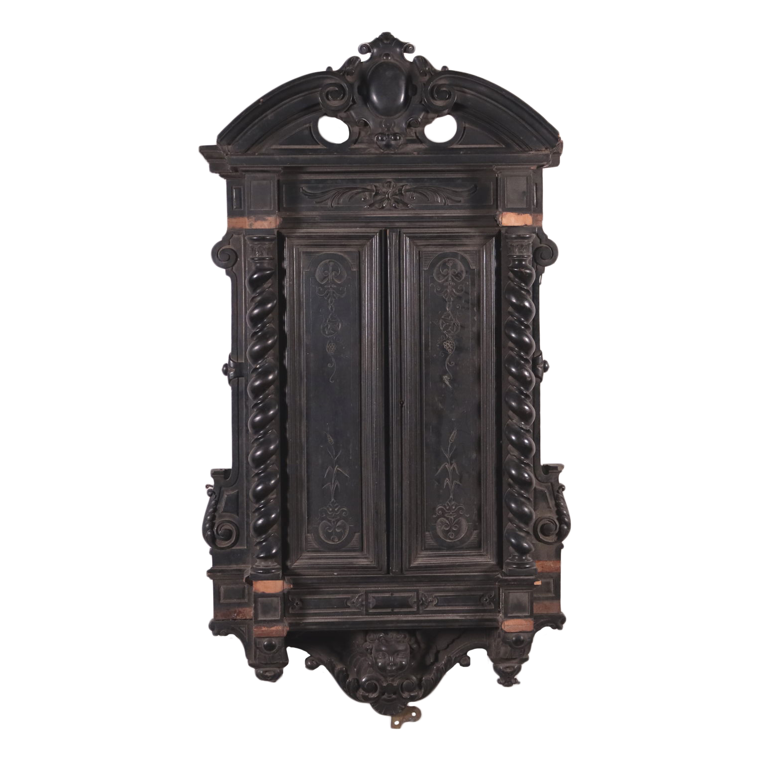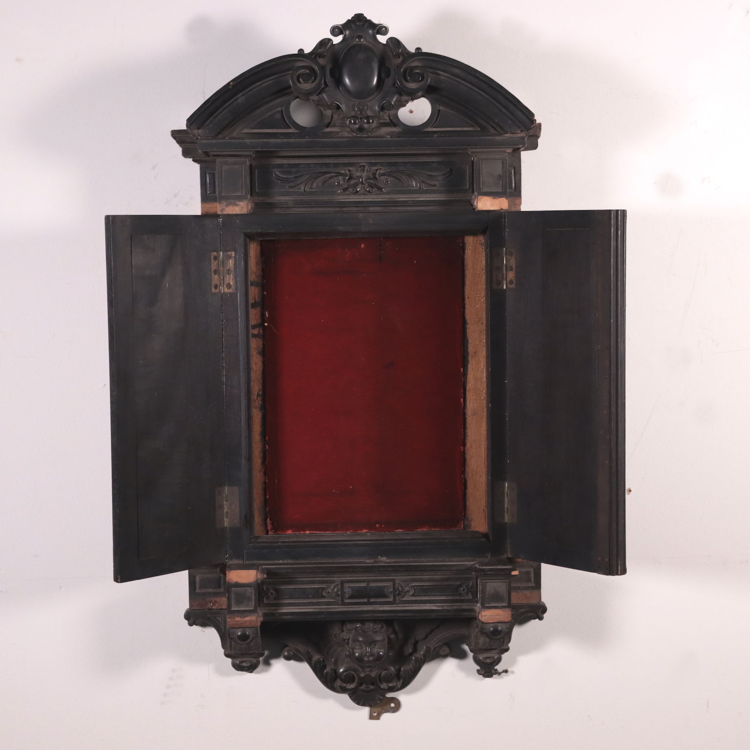 Edicola neorinascimento, sul fronte presenta due ante intagliate con motivi a candelabra, inquadrate tra due colonne tornite che sostengono il fronte ad arco ribassato con medaglione al centro. Altri intagli ornano i fianchi e la parte inferiore, dove si trova la testa di un putto. In legno di pero ebanizzato.