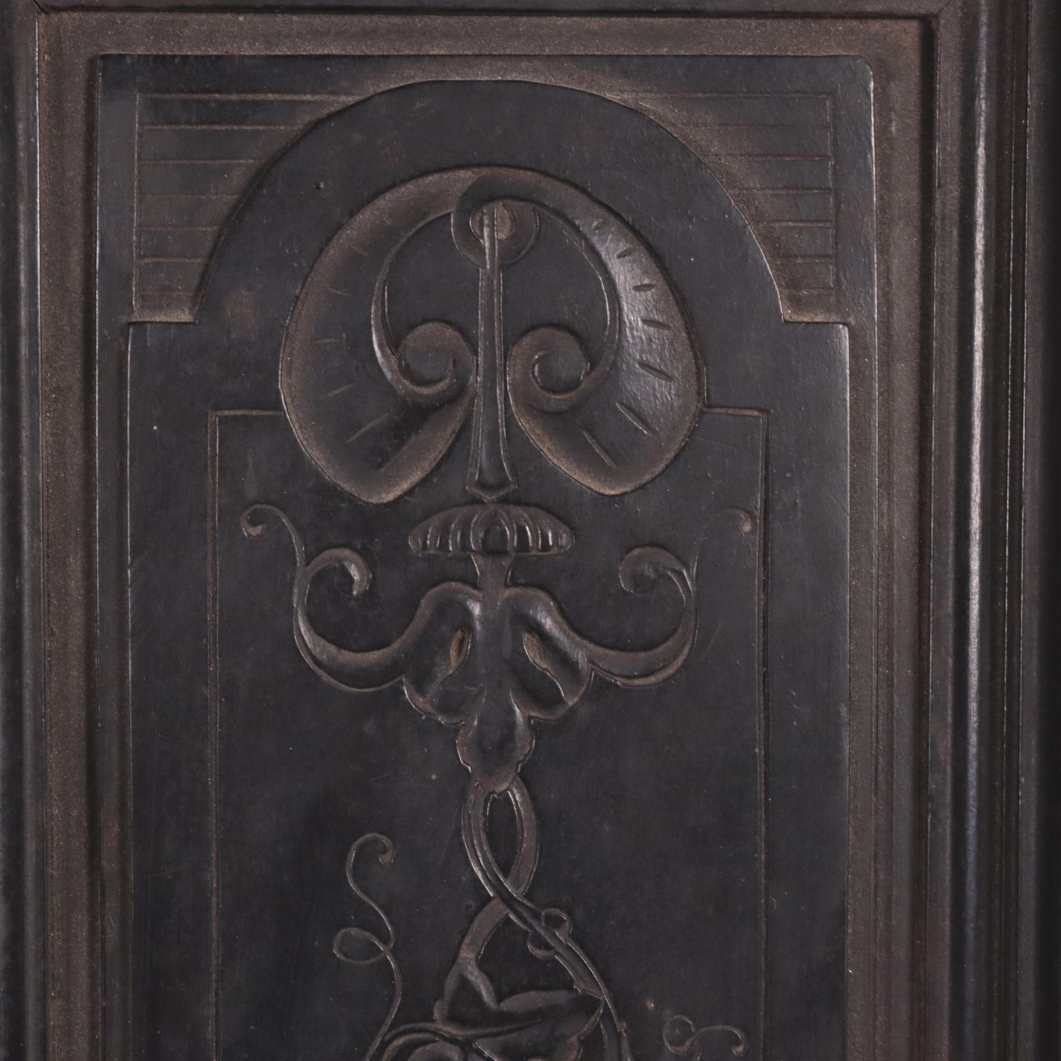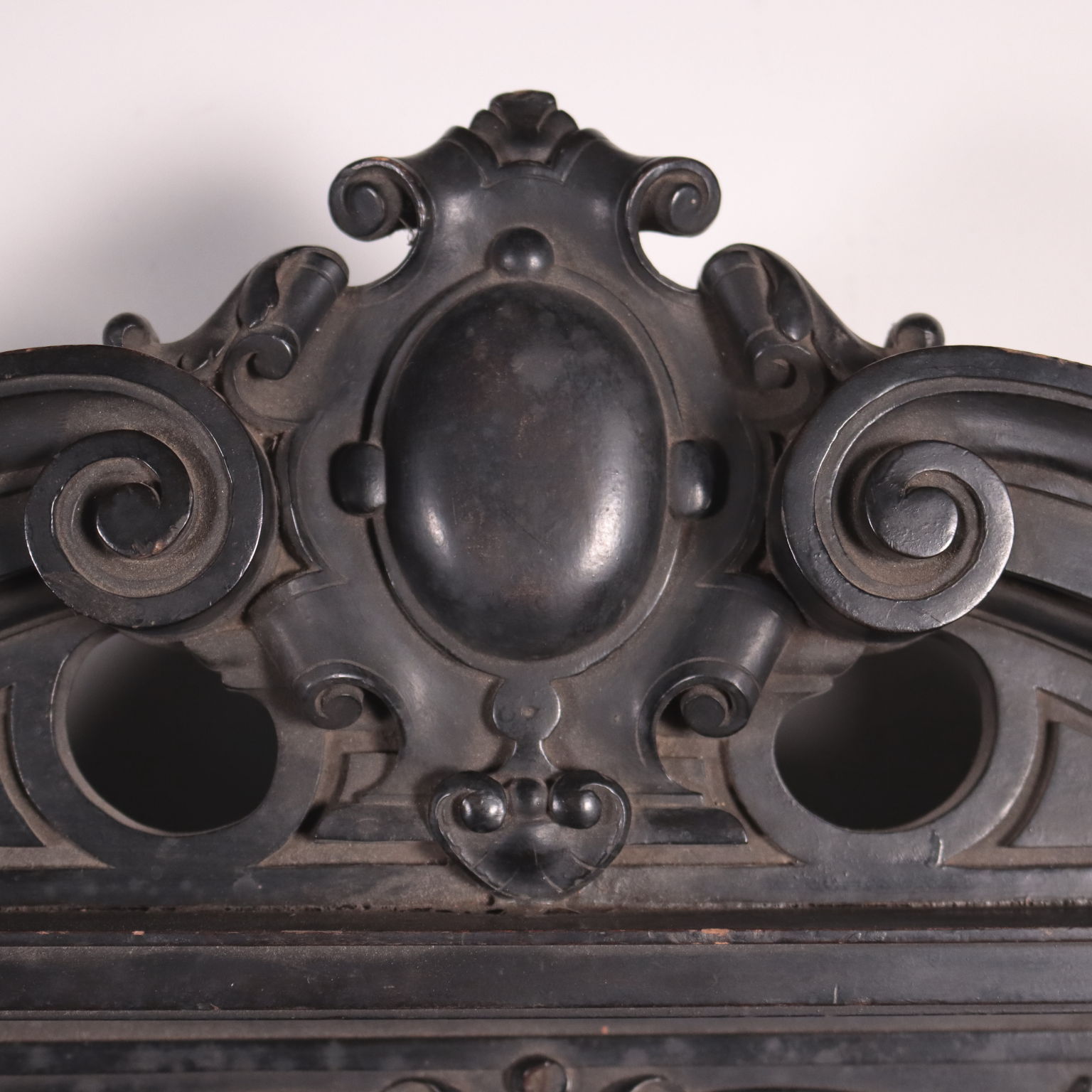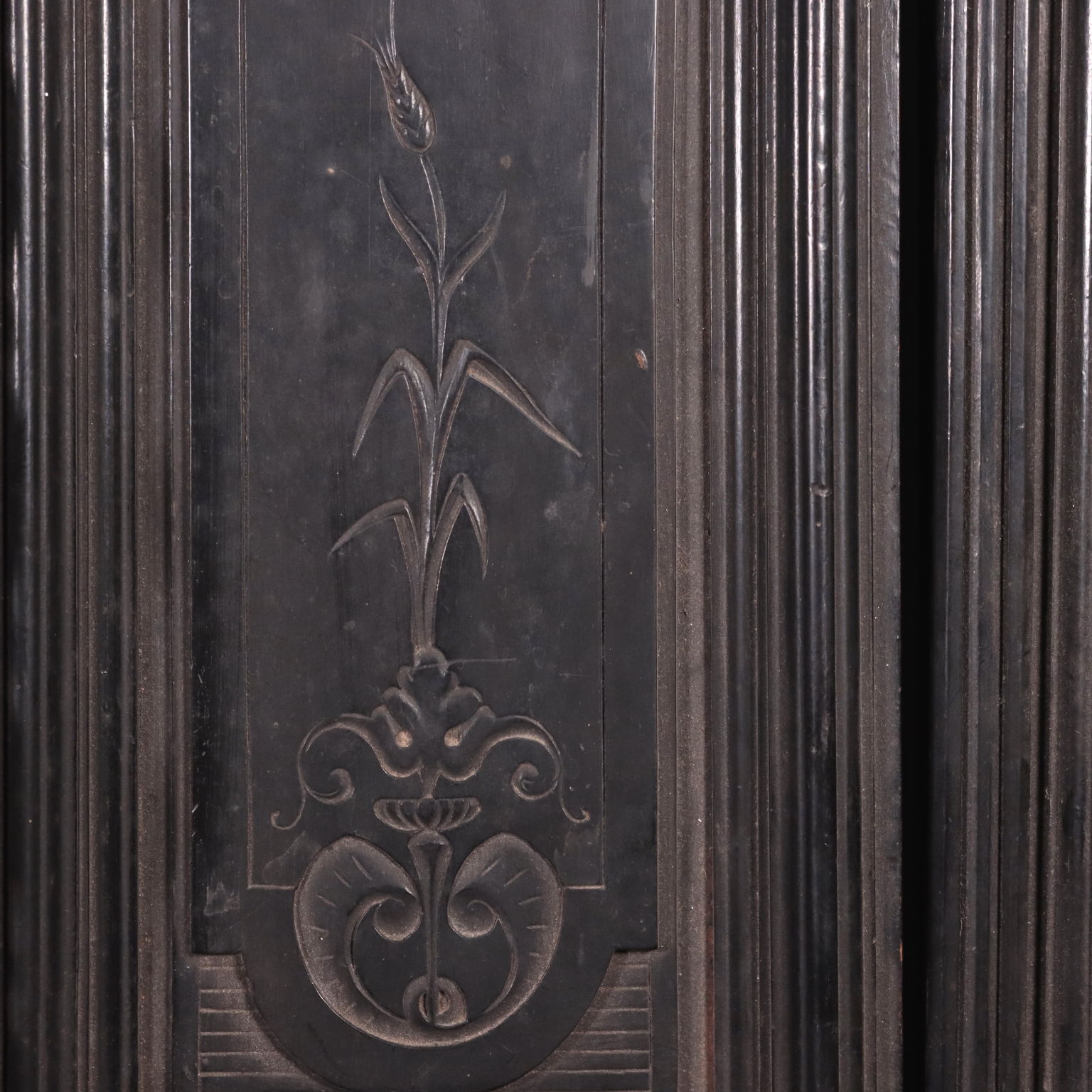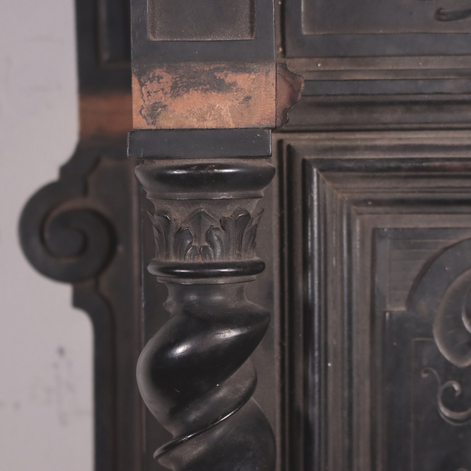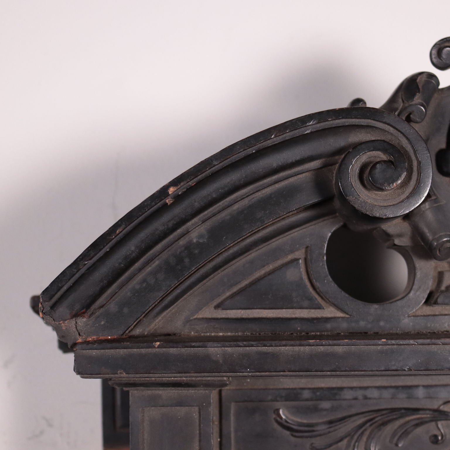 Edicola neorinascimento, sul fronte presenta due ante intagliate con motivi a candelabra, inquadrate tra due colonne tornite che sostengono il fronte ad arco ribassato con medaglione al centro. Altri intagli ornano i fianchi e la parte inferiore, dove si trova la testa di un putto. In legno di pero ebanizzato.
