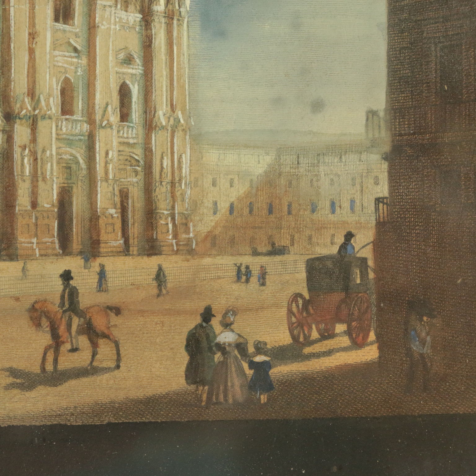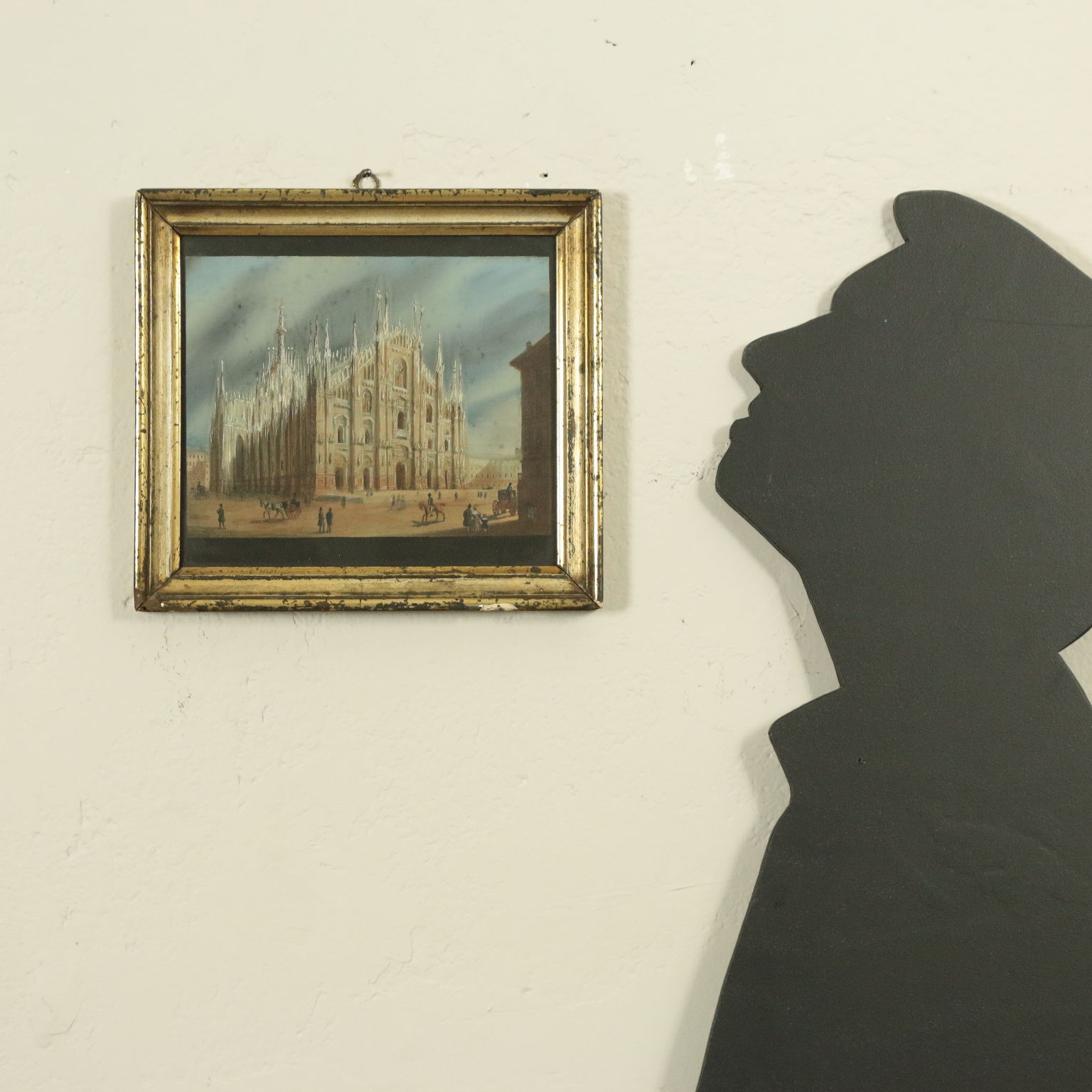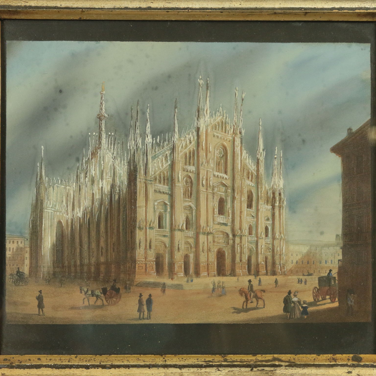 Gouache su carta. Suggestiva raffigurazione del Duomo di Milano, con la piazza del XIX secolo animata da molte figurine, da calessi e carrozze. In cornicetta di fine '800, con mancanze.