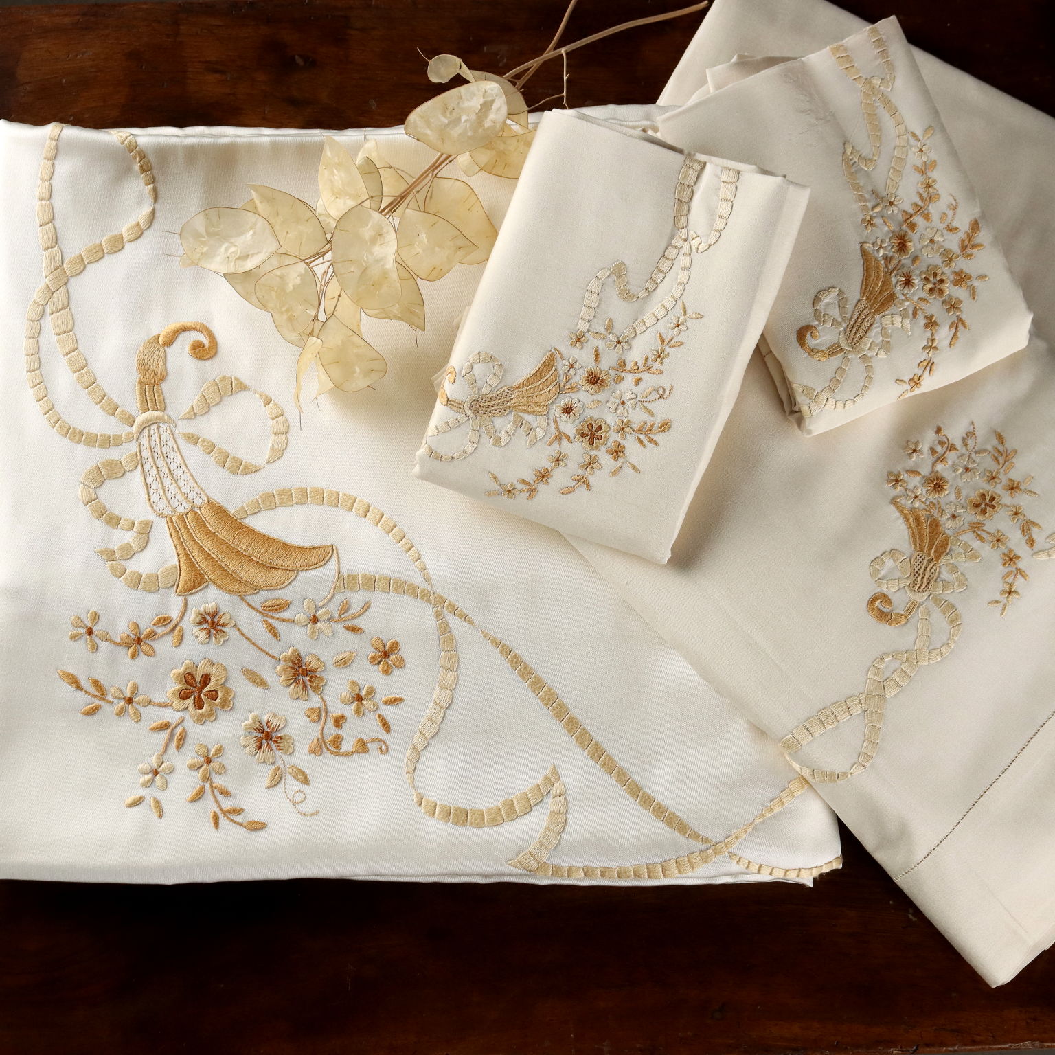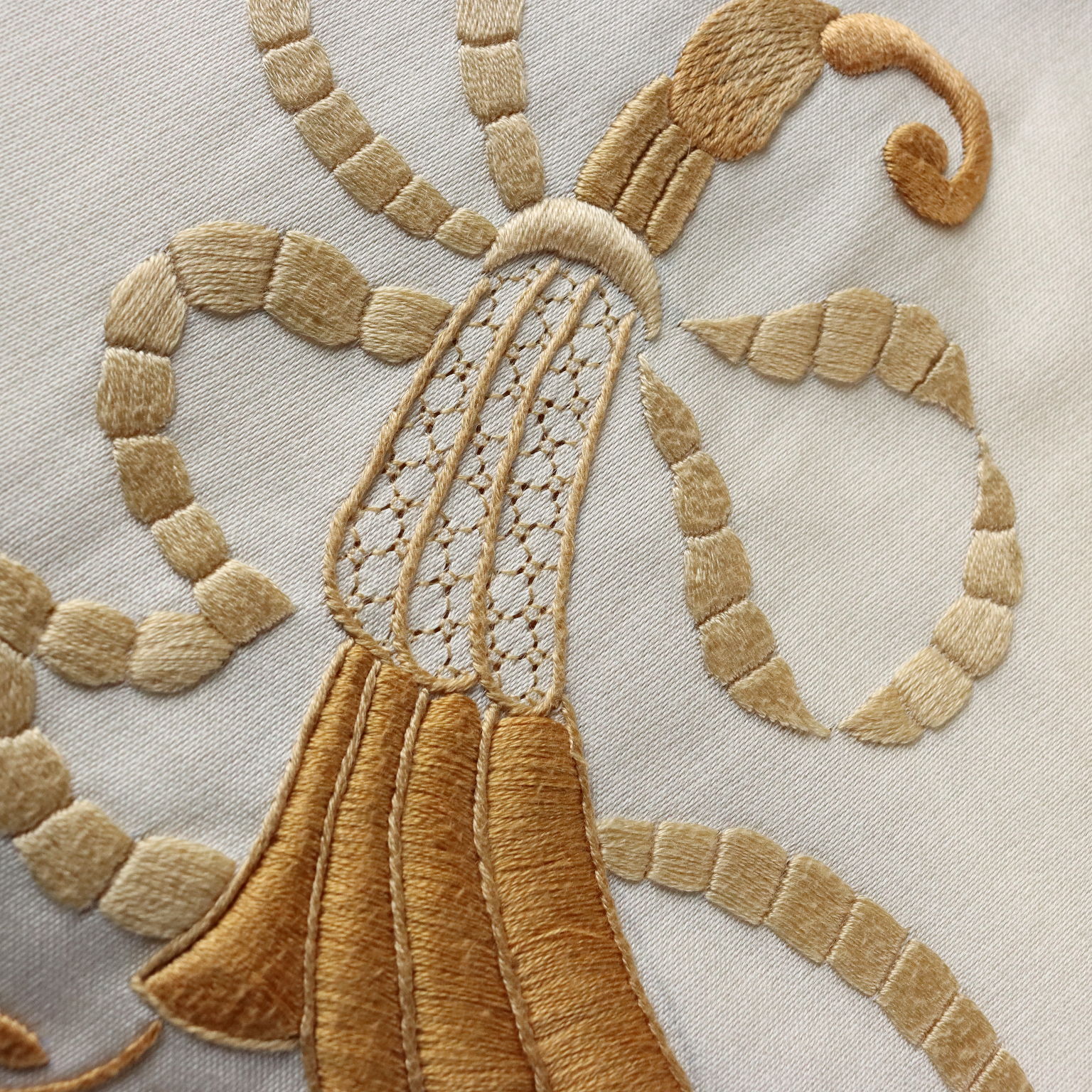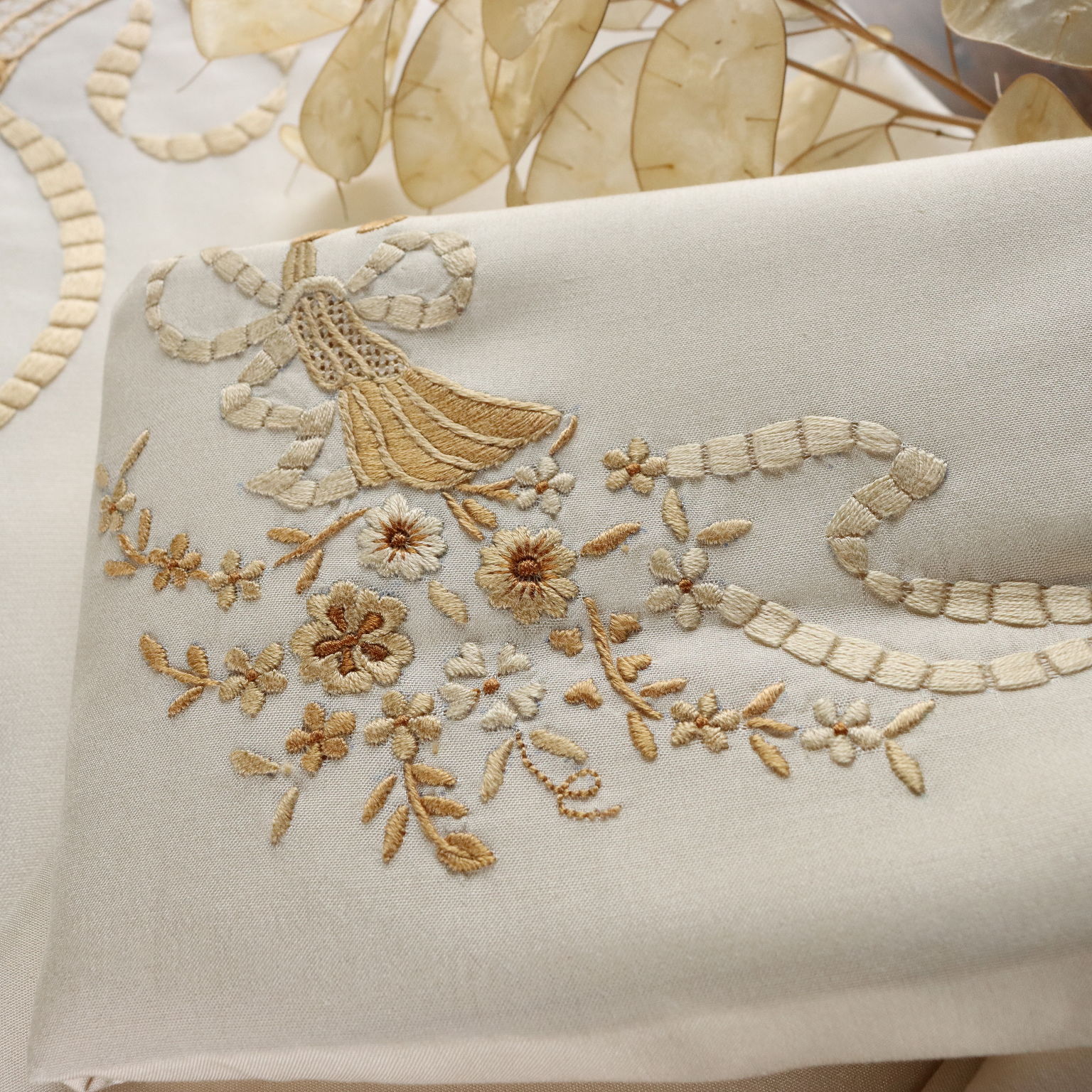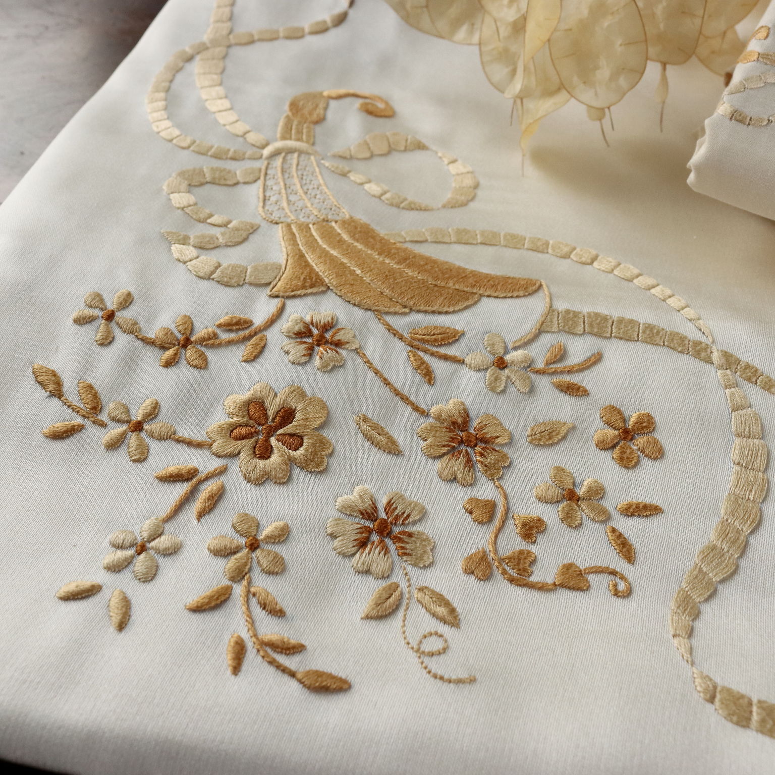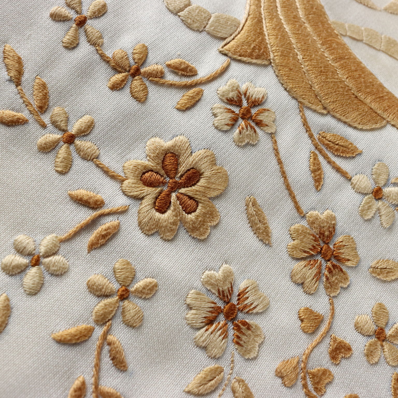 Completo matrimoniale in seta a motivo floreale con ricami in rilievo beige e marrone composto da Un copriletto Lenzuolo sotto e lenzuola sopra Due federe Segni del tempo su una federa Colore avorio Composizione seta Dimensioni Copriletto 290cm x 300cm Lenzuola 272cm x 282cm Federa 91cm x 57cm