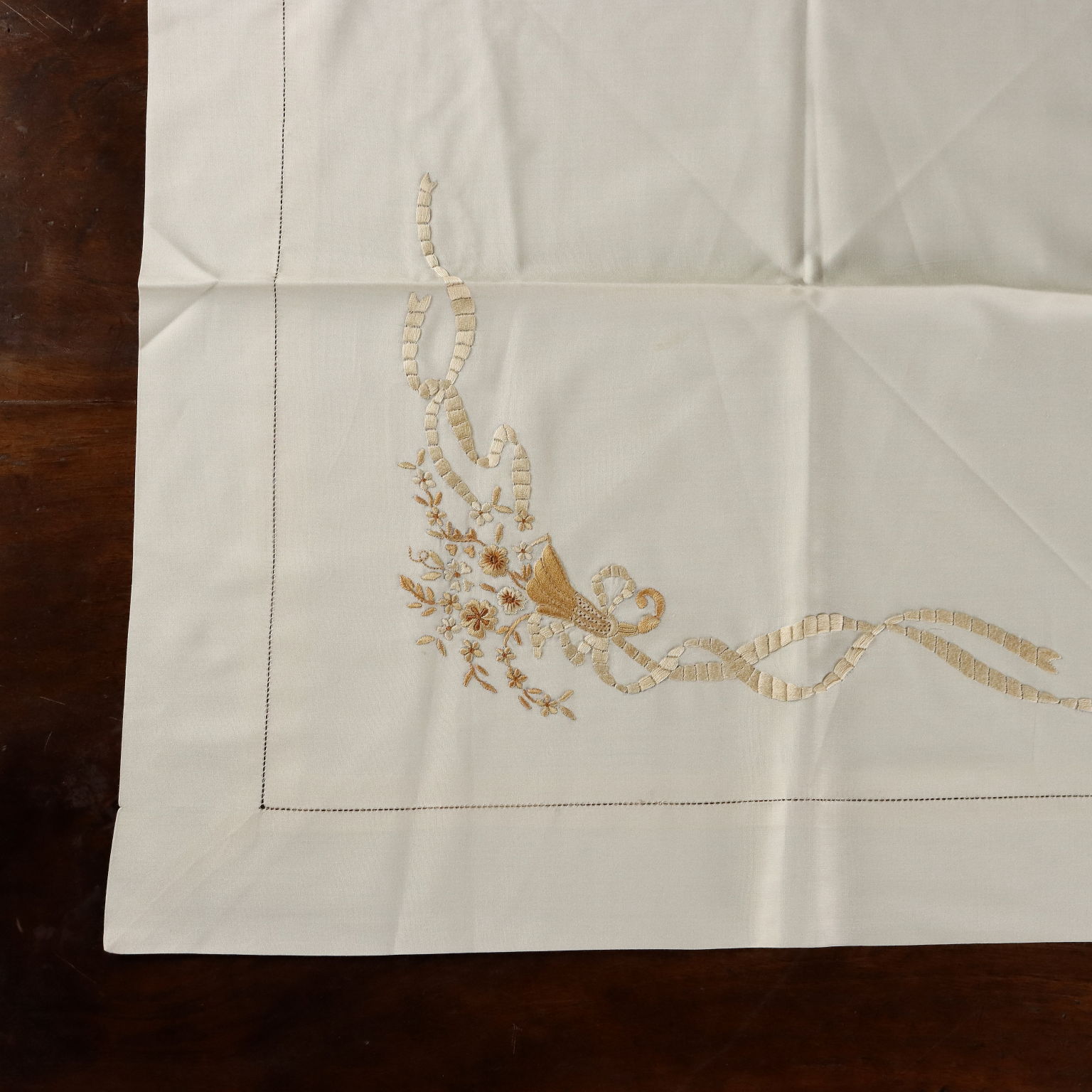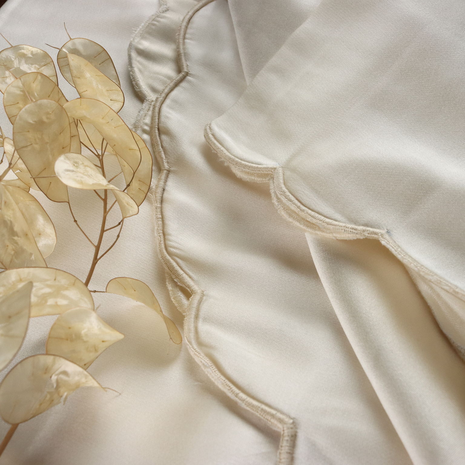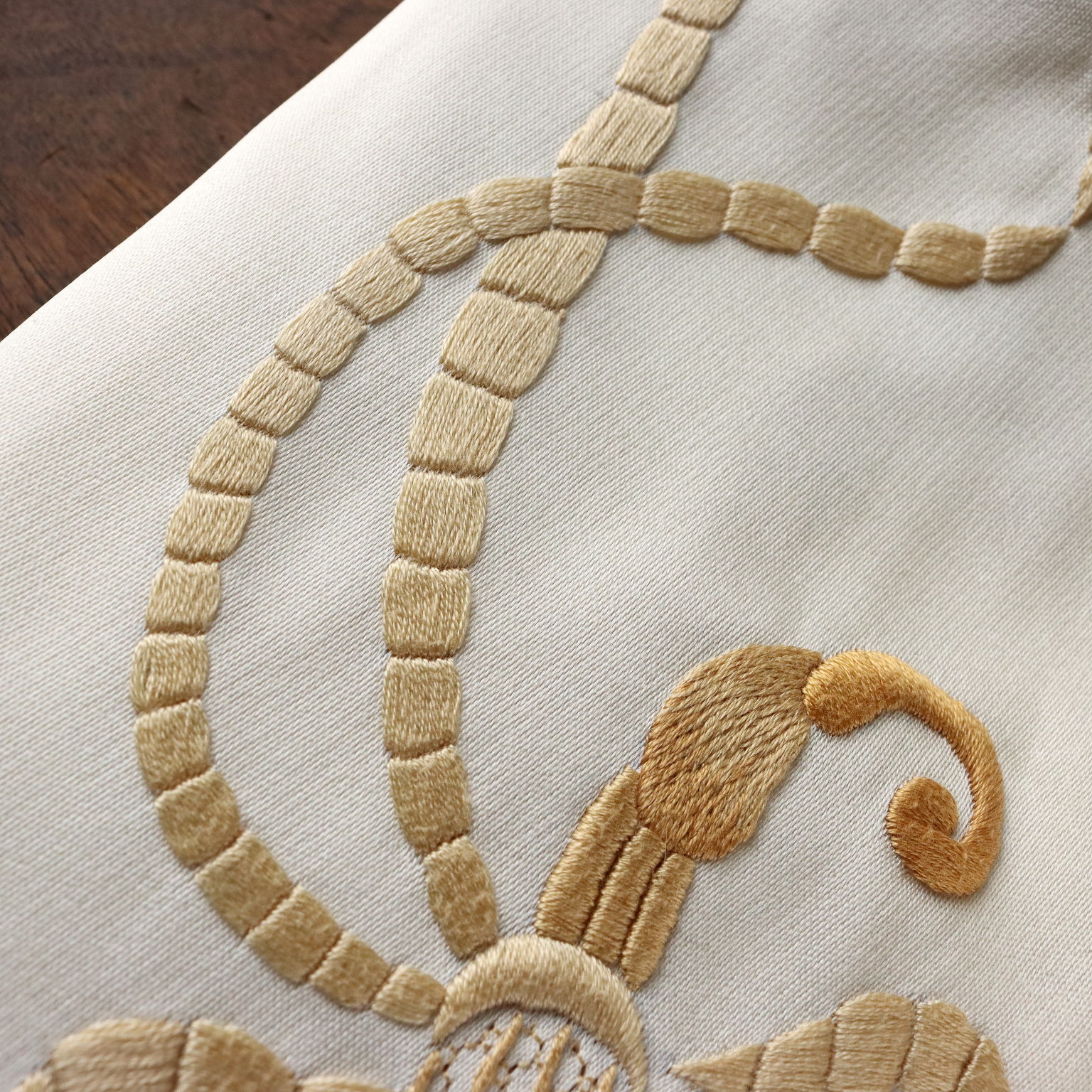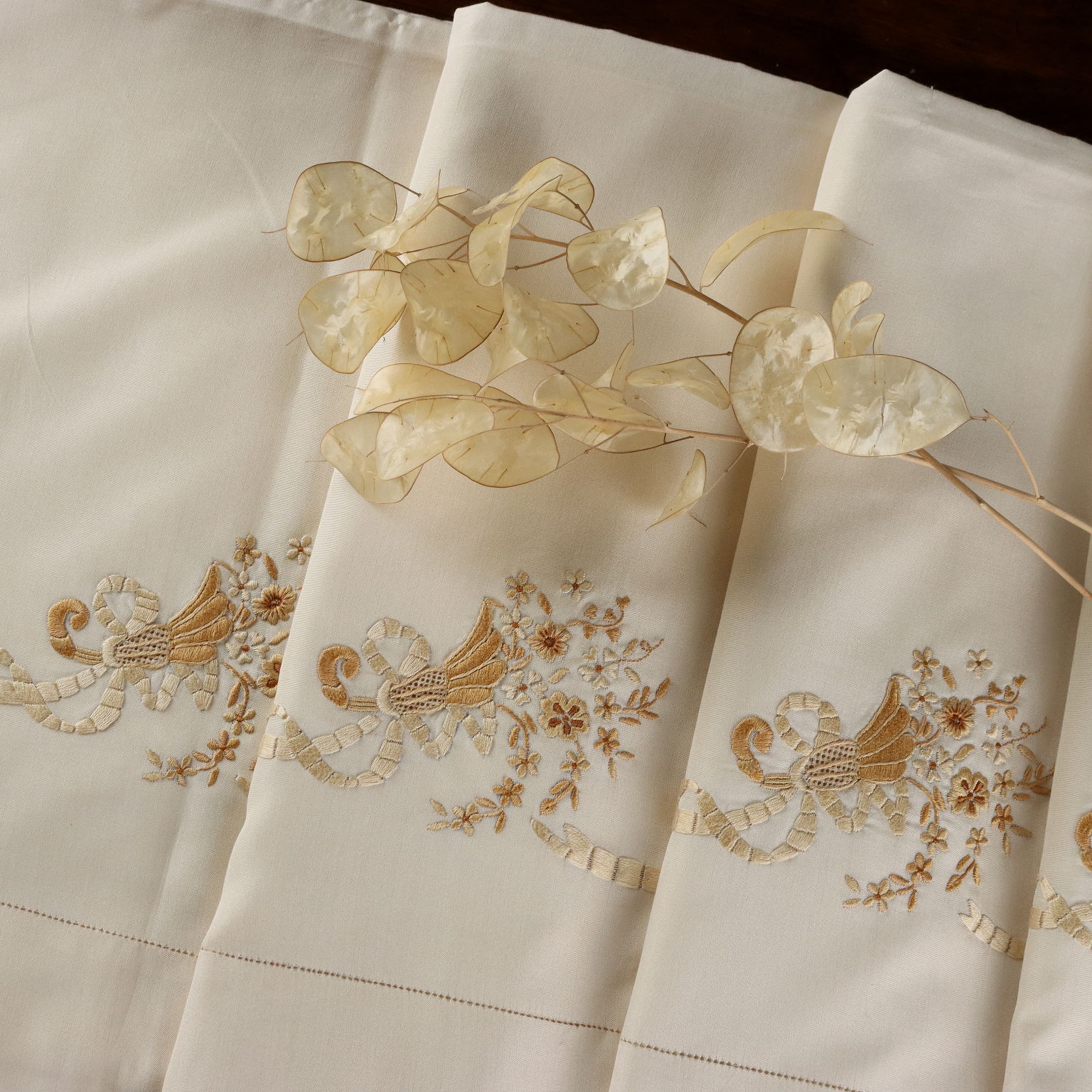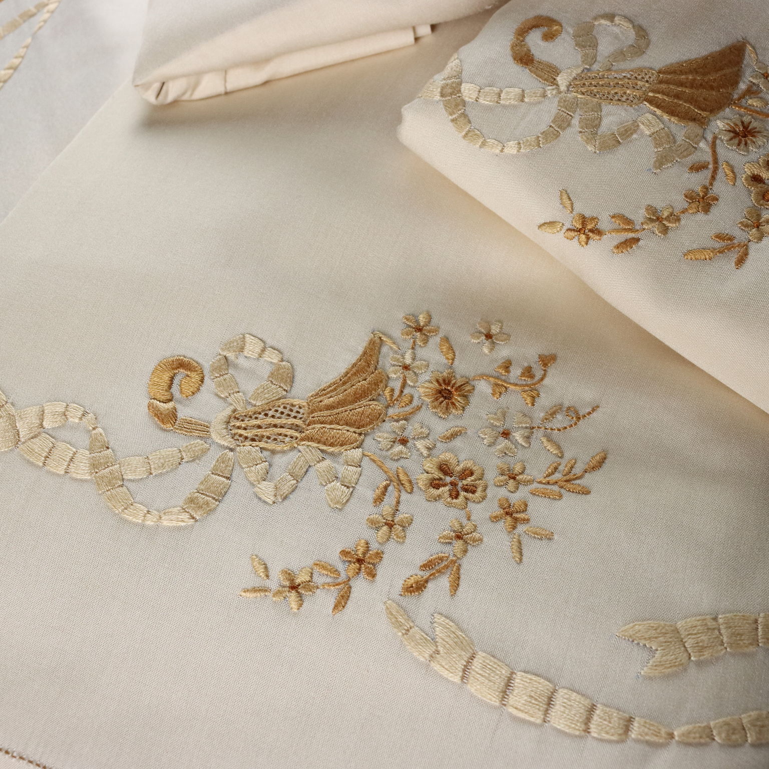 Completo matrimoniale in seta a motivo floreale con ricami in rilievo beige e marrone composto da Un copriletto Lenzuolo sotto e lenzuola sopra Due federe Segni del tempo su una federa Colore avorio Composizione seta Dimensioni Copriletto 290cm x 300cm Lenzuola 272cm x 282cm Federa 91cm x 57cm