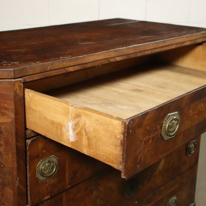 Cassettone neoclassico piacentino con montanti a 45°, con quattro cassetti. Impiallacciato in radica di ulivo, con filettature in ciliegio, la fascia perimetrale del fronte presenta una riserva intarsiata con motivi fitomorfi in acero, tra i quali trovano alloggio le maniglie in lamierino sbalzato. Piano in marmo mancante.