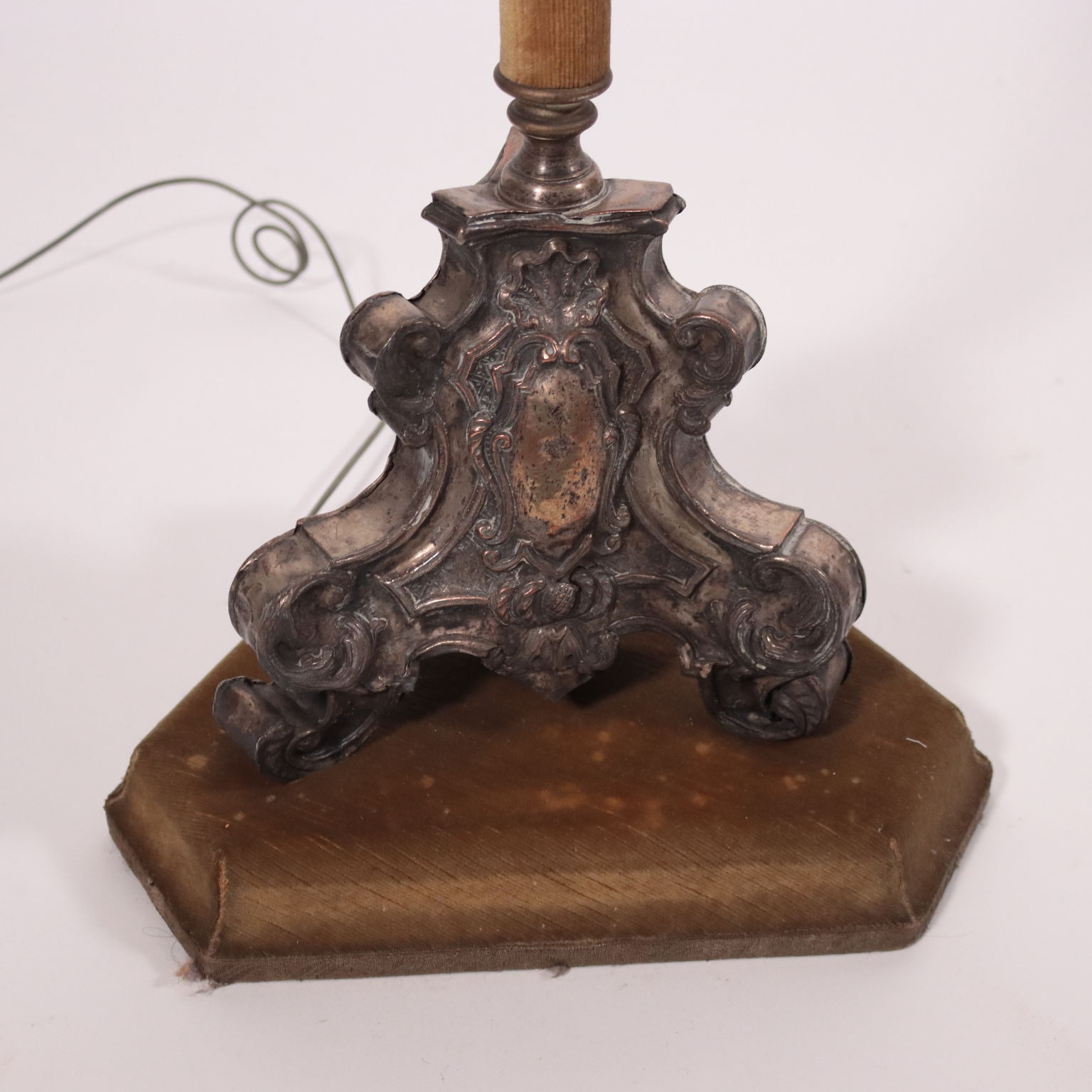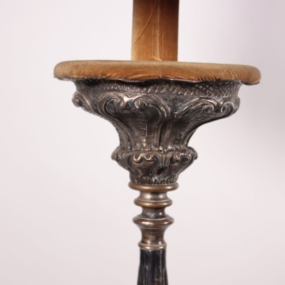 Lampada da terra il cui balaustro presenta parti in lamierino sbalzato e argentato, derivate da un antico torciere.