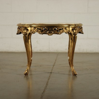 Tavolino in stile barocchetto, sorretto da gambe mosse, è intagliato e dorato; il piano è in marmo.