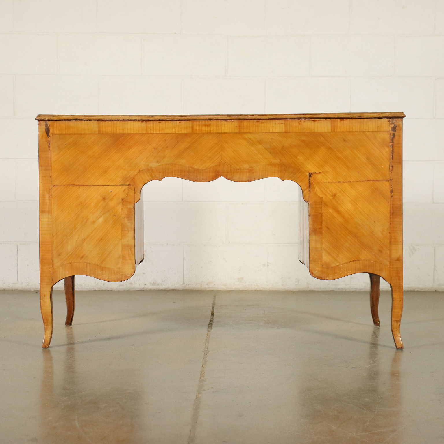 Descrizione Scrivania veneta a giorno, sorretta da piedini mossi, sul fronte presenta due ante ai lati, a inquadrare il vano centrale, mentre sottopiano si trovano tre cassetti e un tiretto che funge da piano scrittoio. Impiallacciata in ciliegio, gli interni sono in abete, serrature sostituite; ha subito modifiche e restauri.