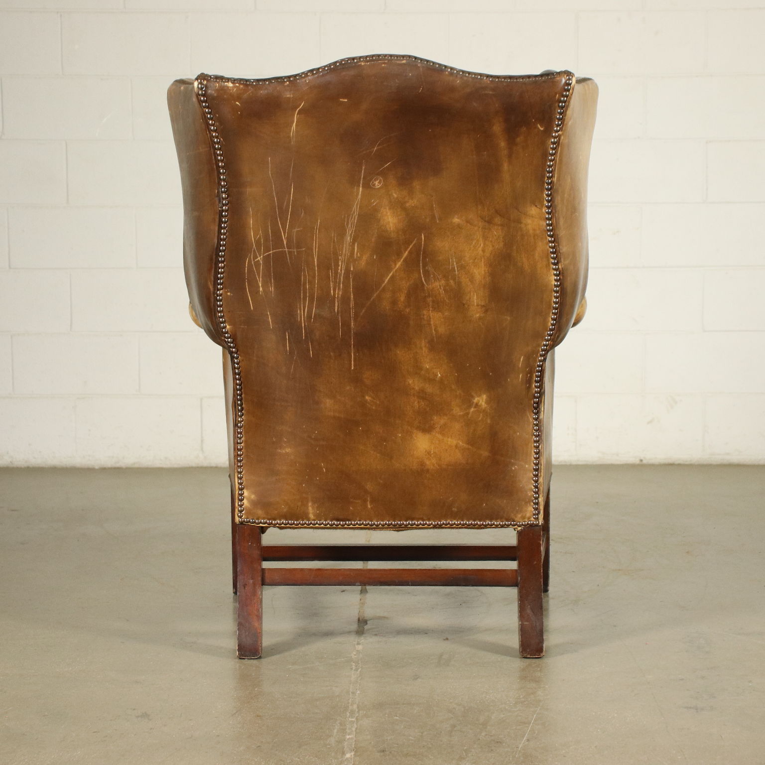 Poltrona Bergere con poggiapiedi, sorretti da gambe connesse da traverse, in mogano, sono interamente rivestiti in pelle capitonnè.