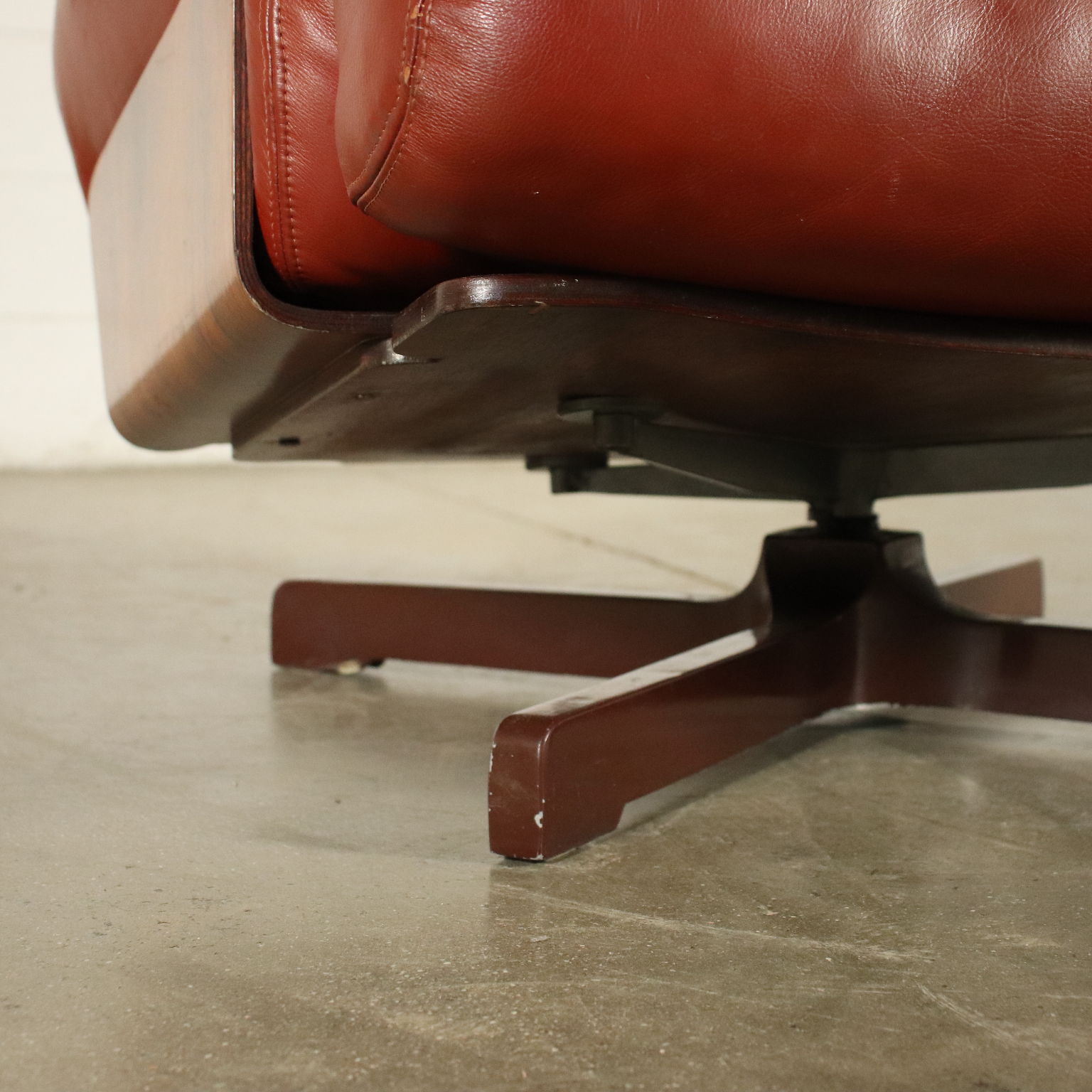 Poltrona girevole, imbottitura in espanso, rivestimento in pelle, scocca in legno impiallacciato palissandro.