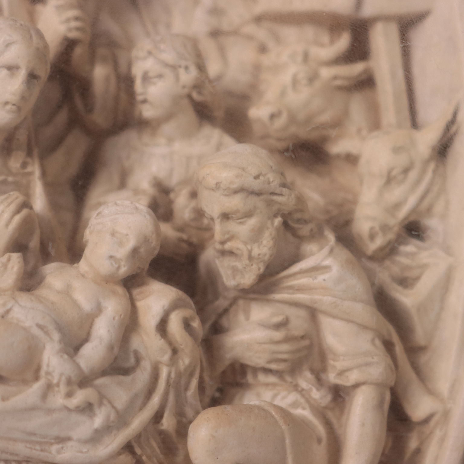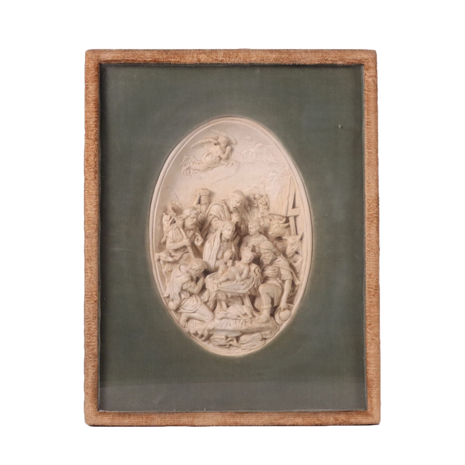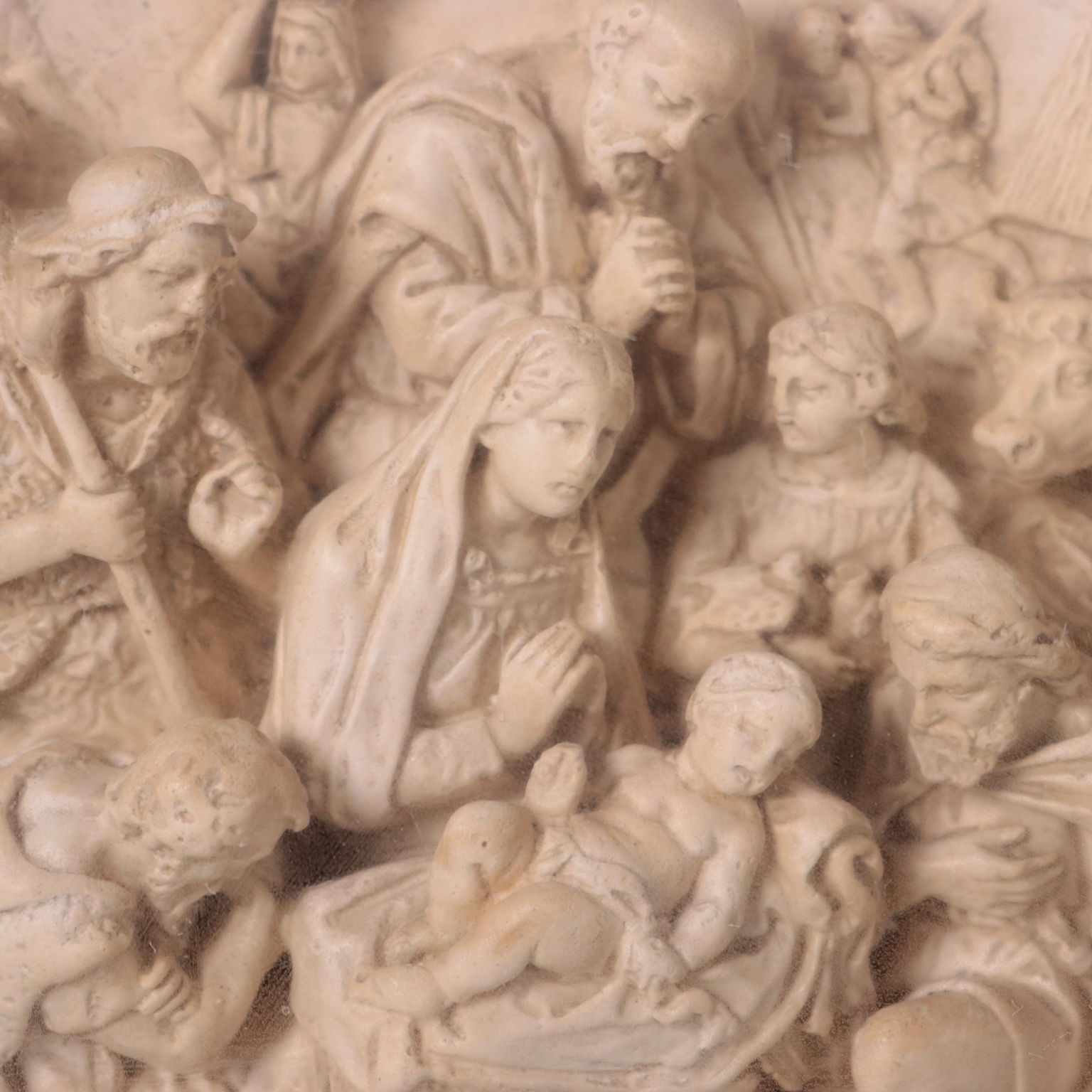 Bassorilievo in gesso raffigurante la Natività e diversi personaggi in adorazione. Scultura presentata in teca.