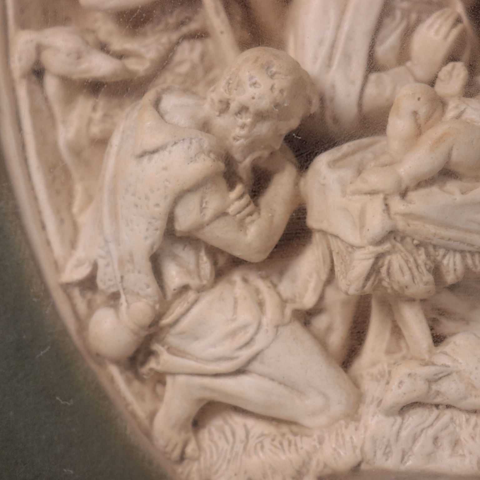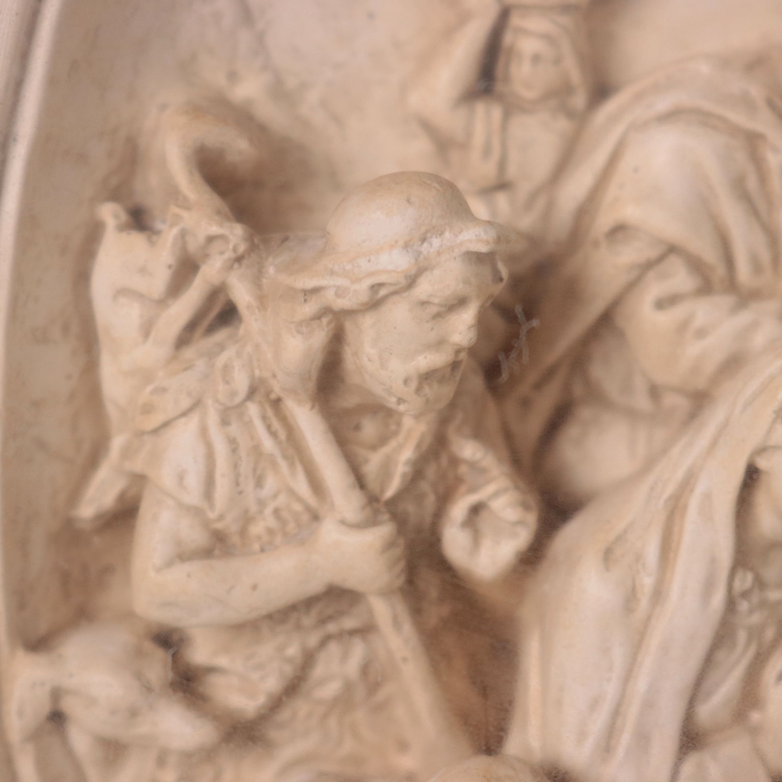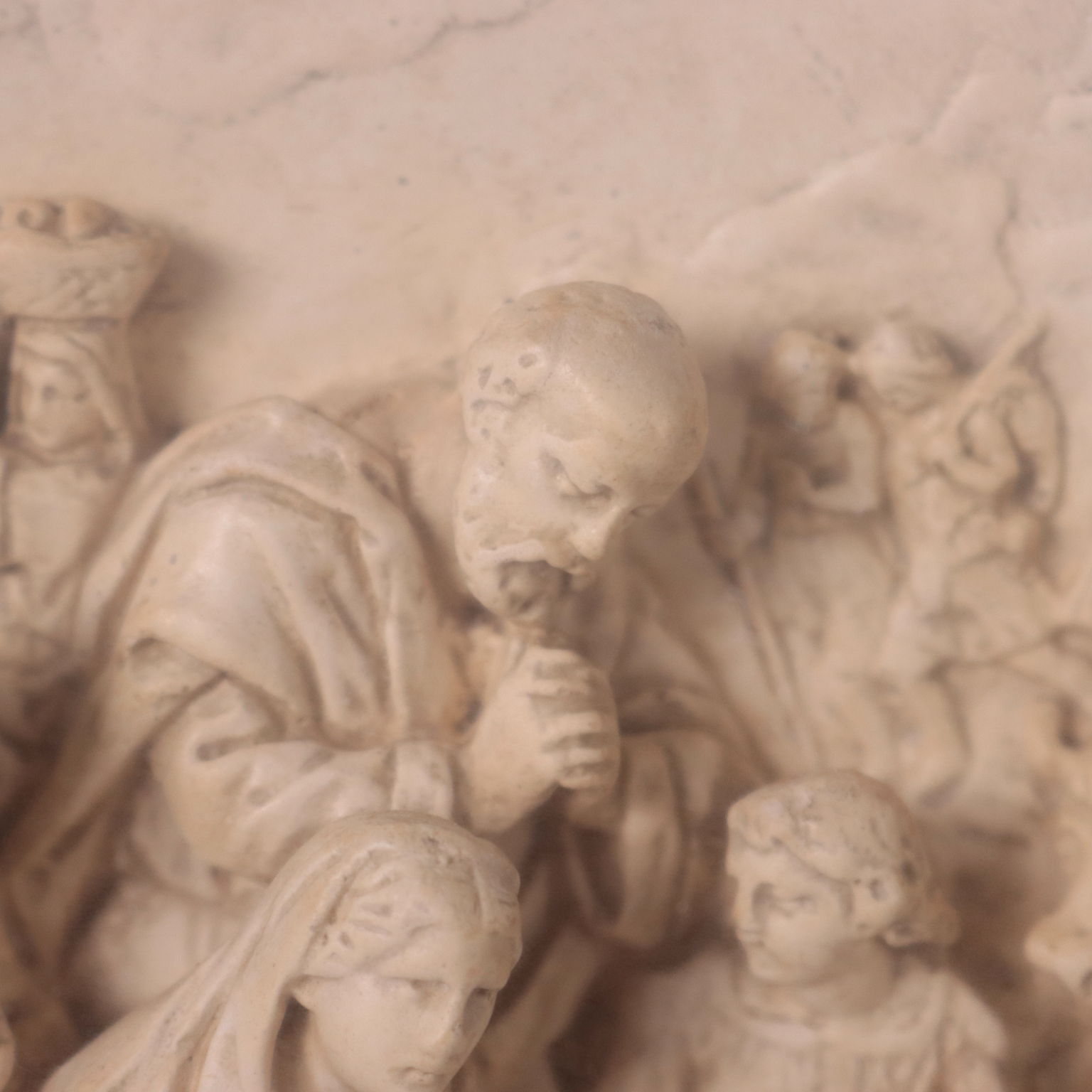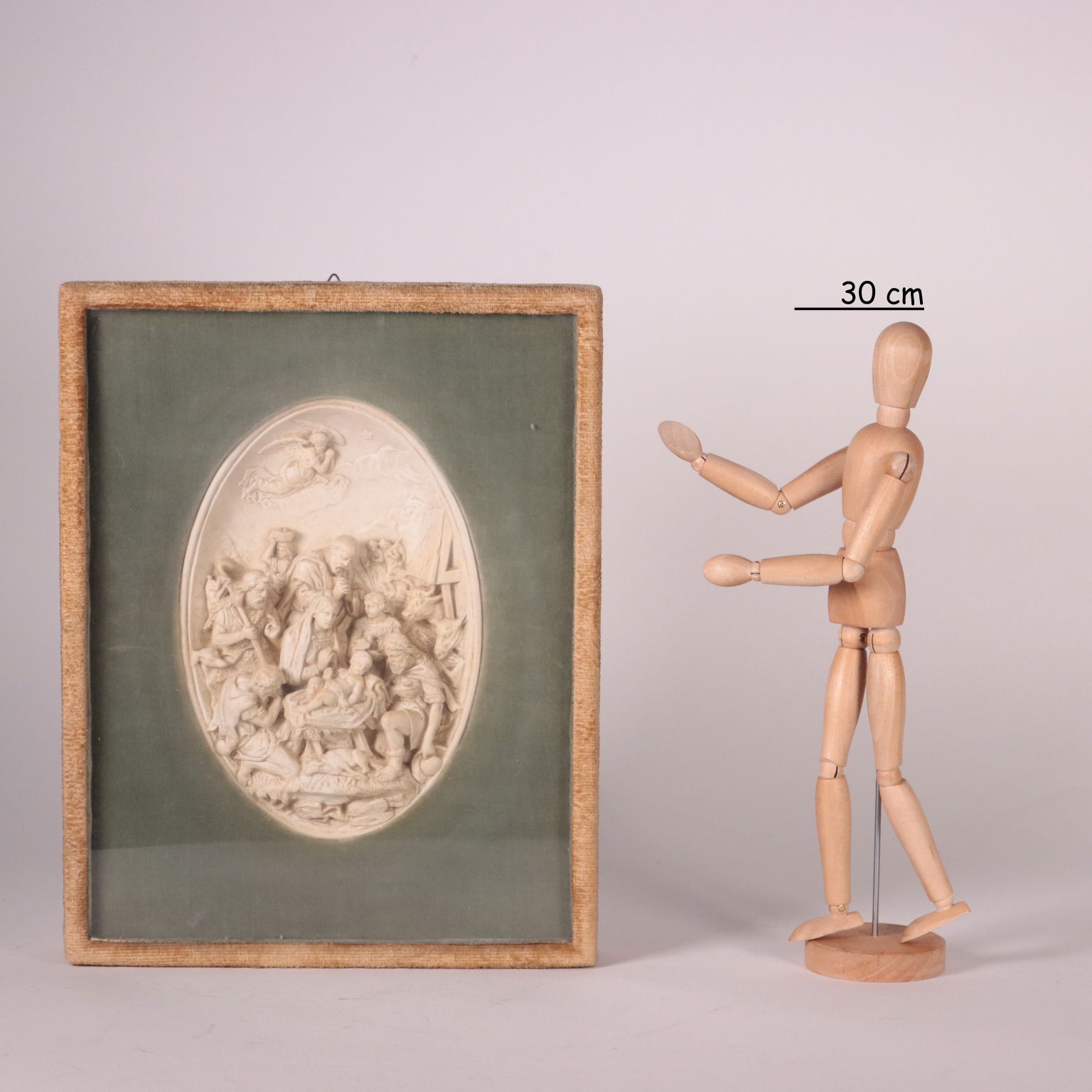 Bassorilievo in gesso raffigurante la Natività e diversi personaggi in adorazione. Scultura presentata in teca.